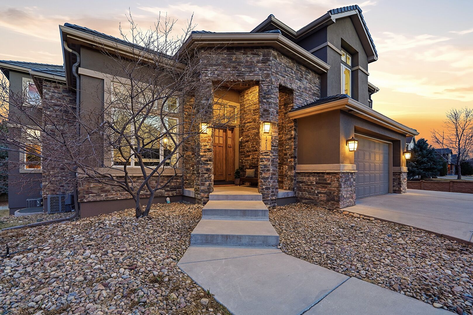 Central Ac, Concrete Foundation, Downspout, Driveway, Gutters, Lawn, Stone Siding, Stoop, Stucco Siding, Tile Roof, Built In Garage, Fence