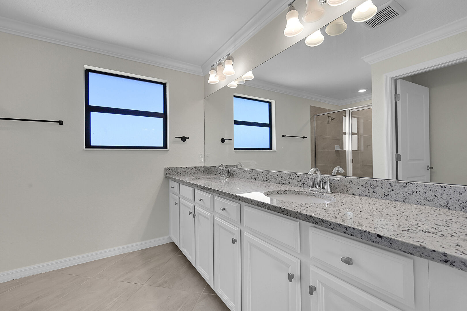 Baseboards Wall, Carpet, Crown Molding, Double Vanity, Drywall, Full Bathroom, Natural Light, Recessed Lighting, Tile Floor, Vent, Water Closet, Drywall, Natural Light