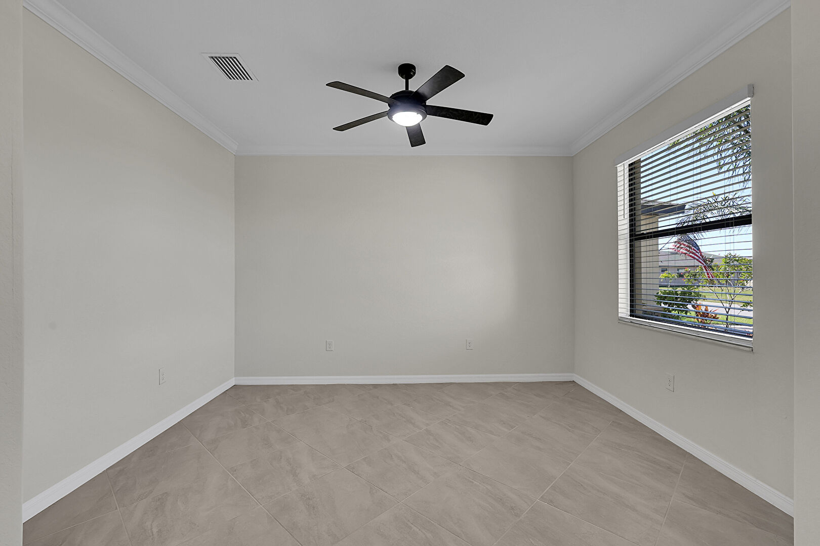 Ceiling Fan, Crown Molding, Drywall, Natural Light, Tile Floor, Vent, Baseboards Wall