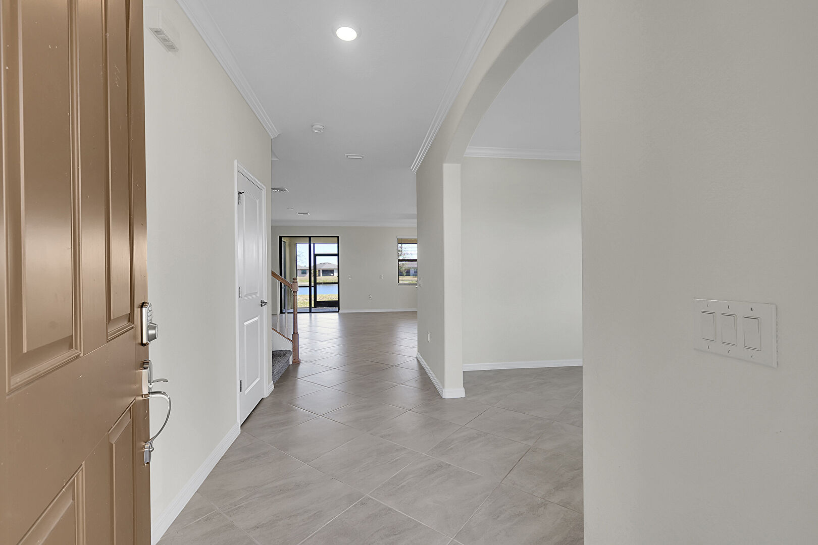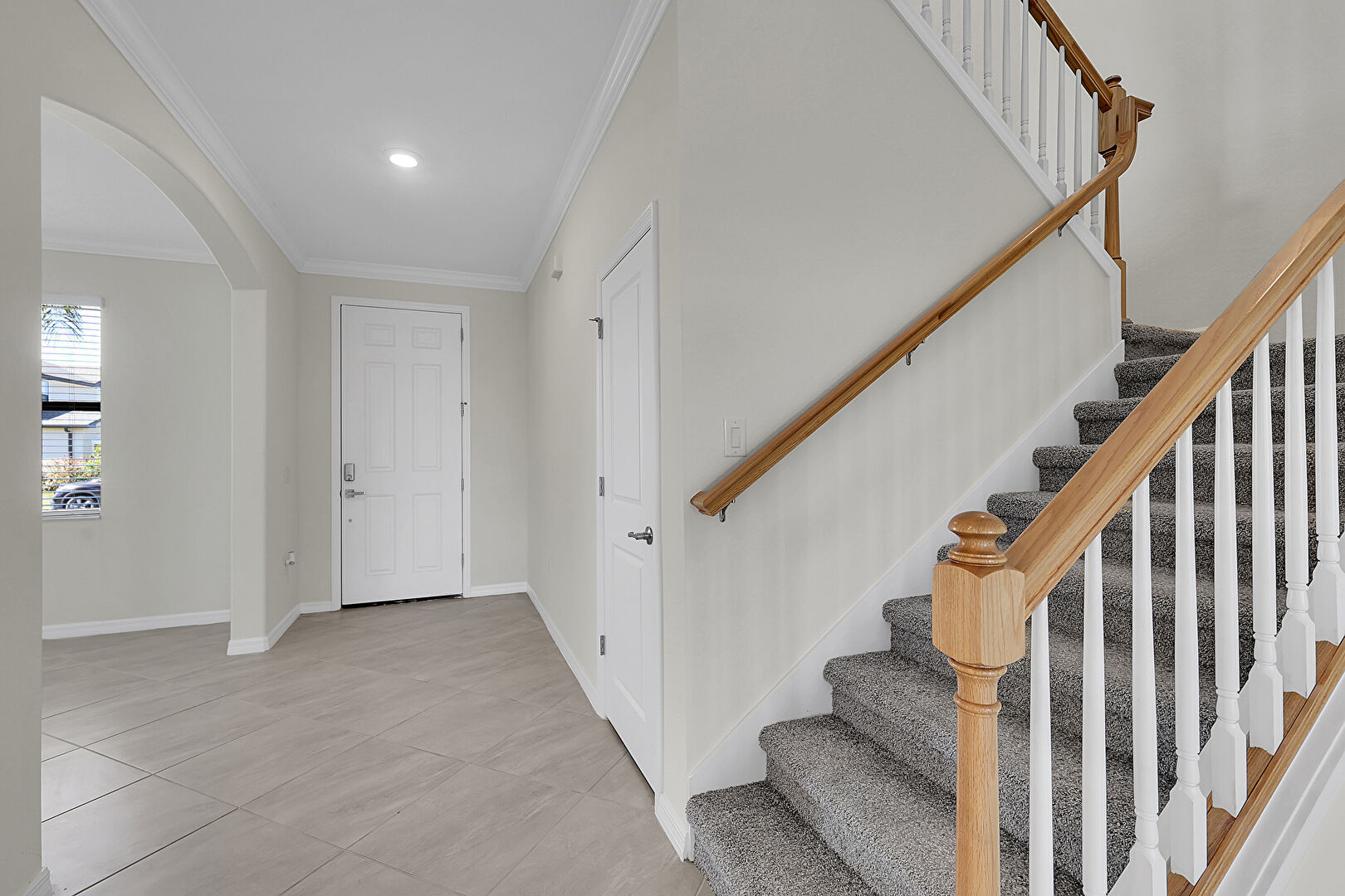 Arched Walkways, Baseboards Wall, Crown Molding, Drywall, Natural Light, Recessed Lighting, Stairs, Tile Floor, Baseboards Wall, Tile Floor