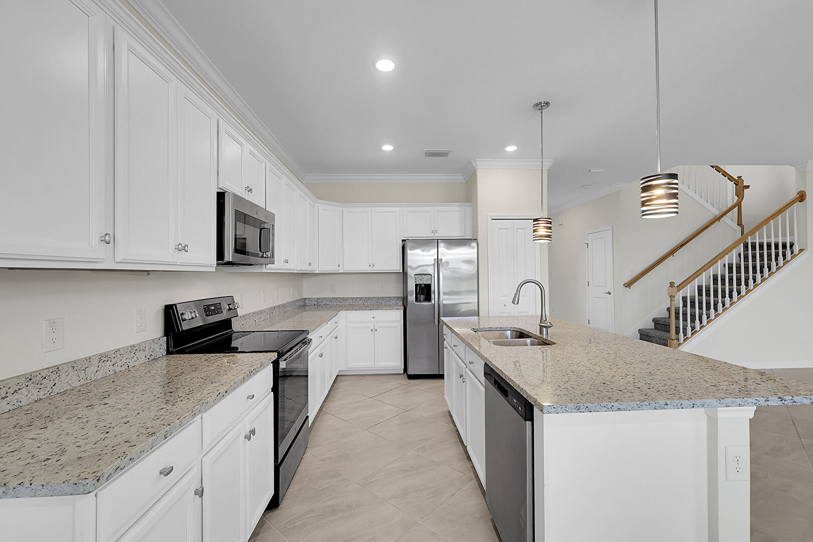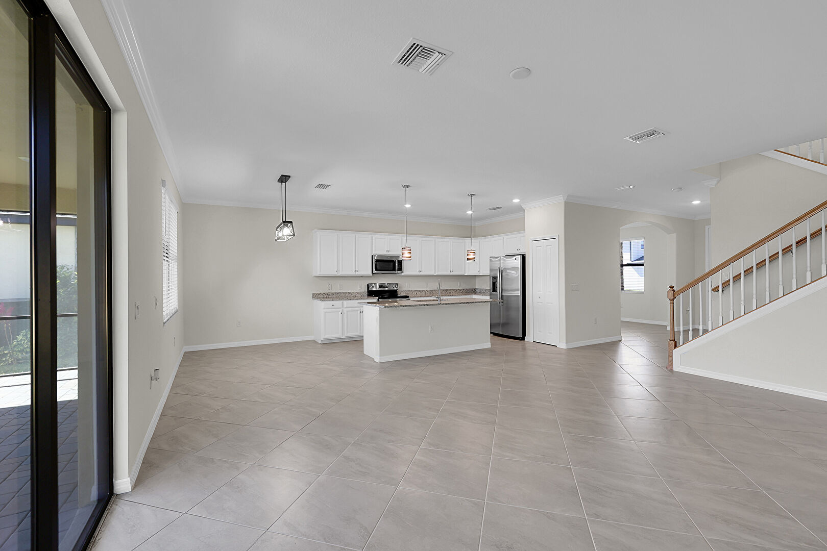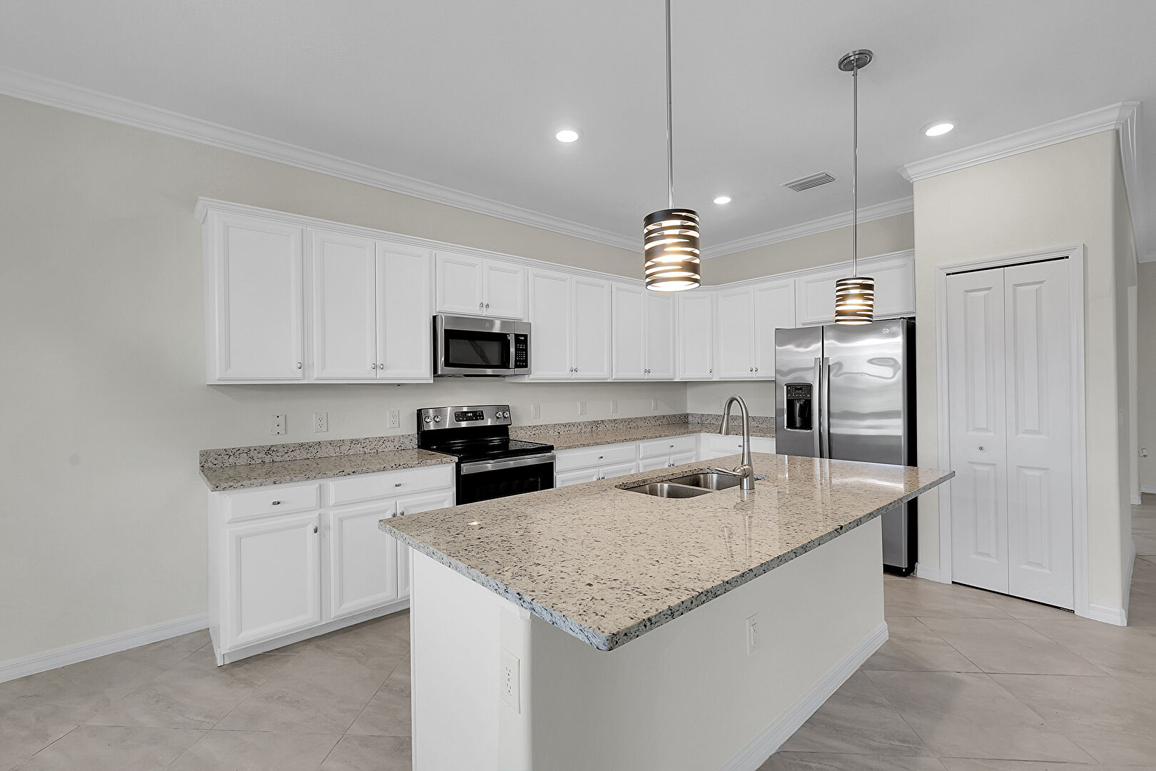 Baseboards Wall, Crown Molding, Crown Molding Cabinets, Drywall, Kitchen Bar, Kitchen Island, L Shaped Kitchen, Natural Light, Opens To Living Area, Pendant Lighting, Recessed Lighting, Shaker Cabinets, Stone Countertops, Tile Floor, Vent, Arched Walkways, Crown Molding Cabinets, L Shaped Kitchen