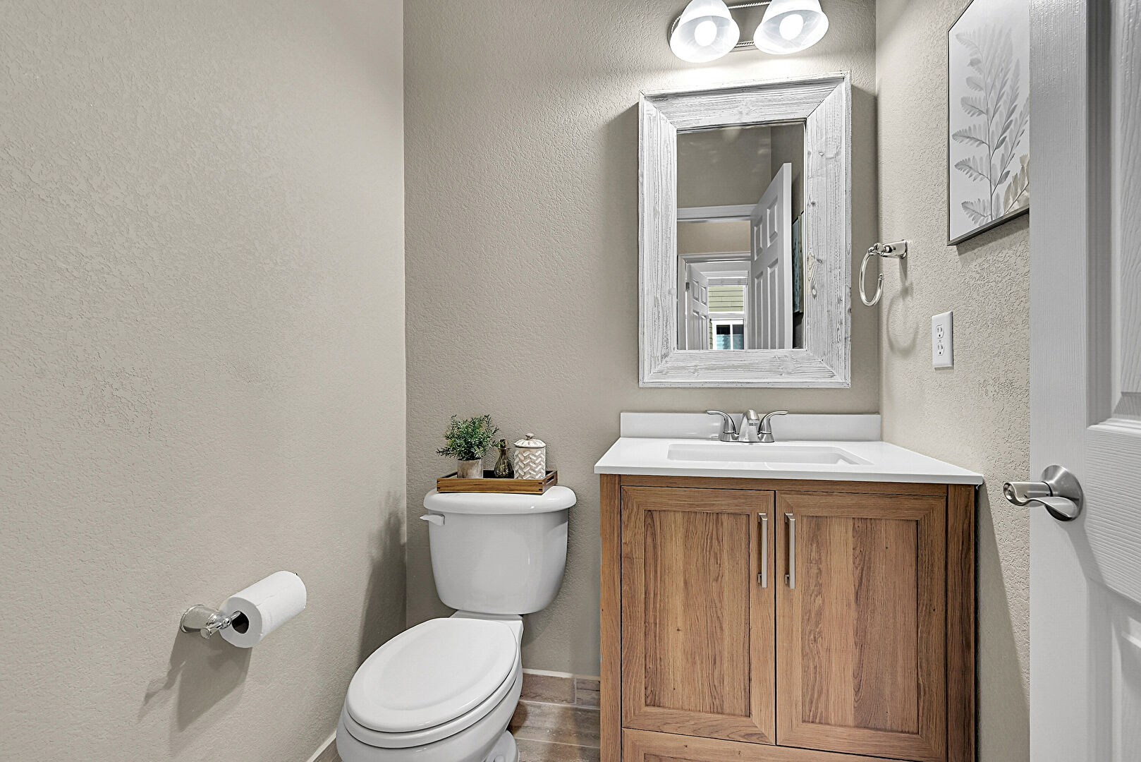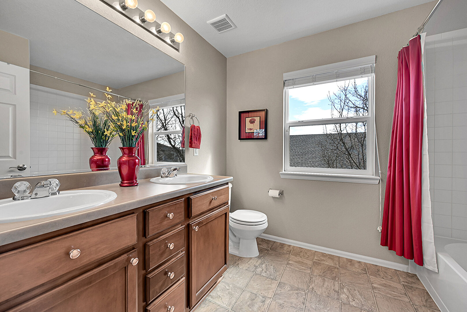 Baseboards Wall, Combined Bath Shower, Double Vanity, Drywall, Full Bathroom, Natural Light, Stone Finish Floor, Textured Wall, Vanity, Vent, Baseboards Wall, Half Bathroom