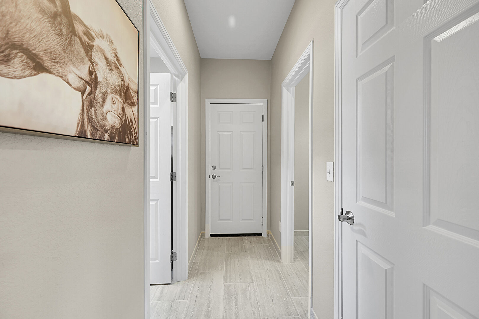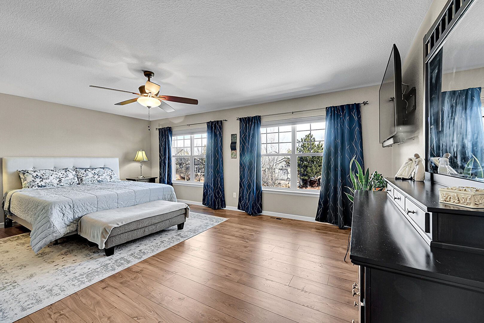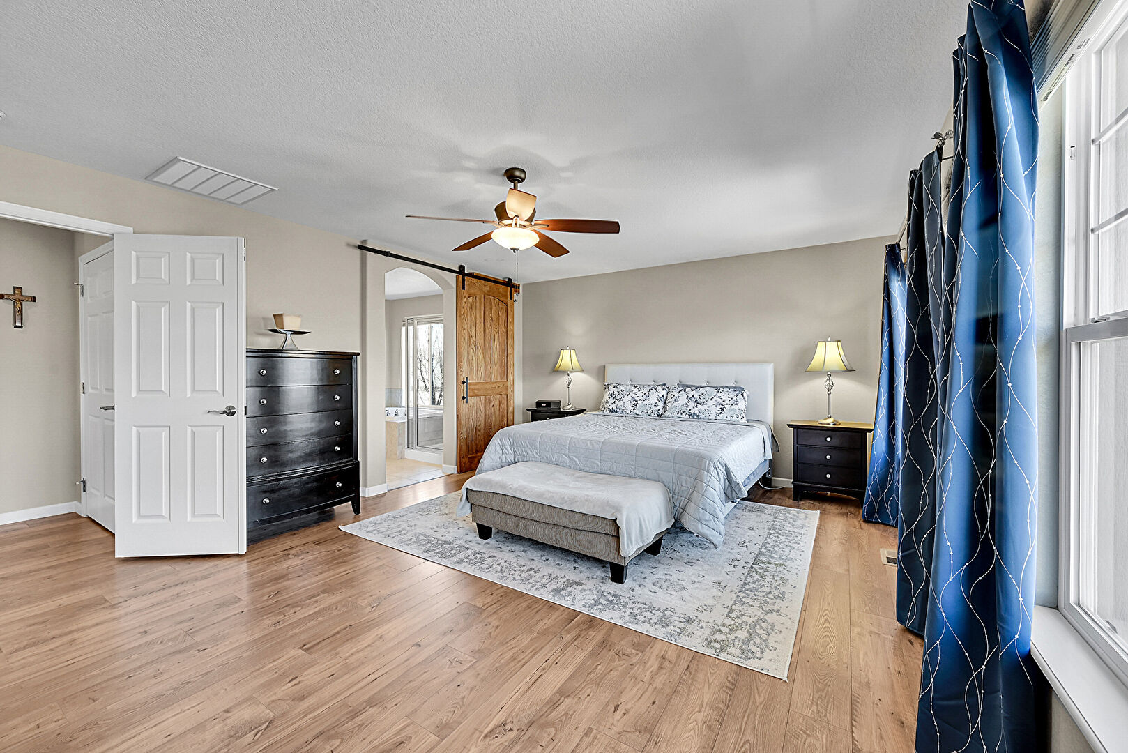 Barn Door, Baseboards Wall, Ceiling Fan, Drywall, Ensuite Bathroom, Natural Light, Textured Ceiling, Vent, Wood Finish Floor, Ceiling Fan, Drywall