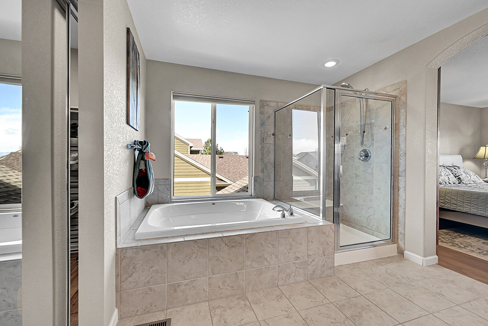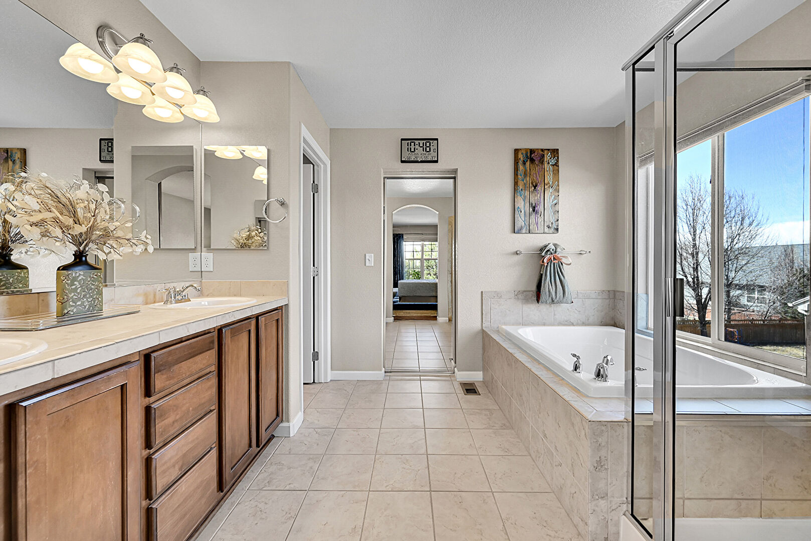 Baseboards Wall, Closet, Double Vanity, Drywall, Ensuite Bathroom, Full Bathroom, Natural Light, Recessed Lighting, Tile Floor, Vent, Drywall, Ensuite Bathroom, Full Bathroom