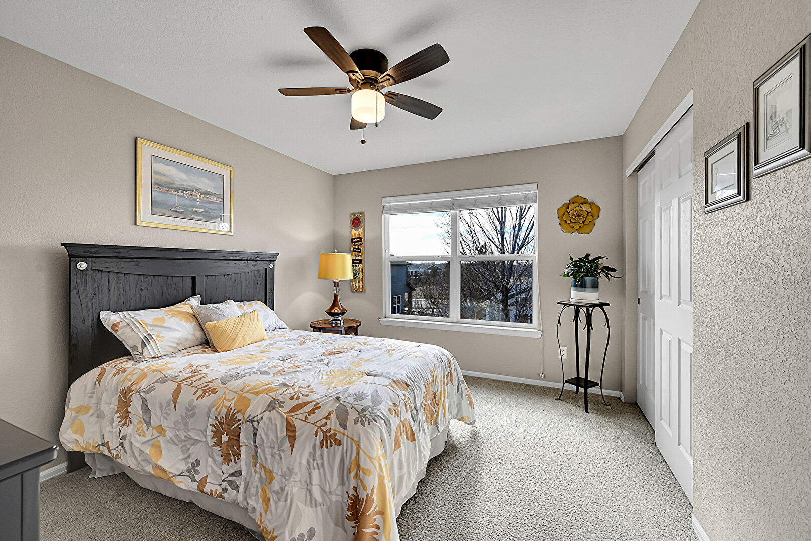 Baseboards Wall, Carpet, Ceiling Fan, Drywall, Natural Light, Smoke Carbon Monoxide Detector, Textured Wall, Vent, Carpet, Closet