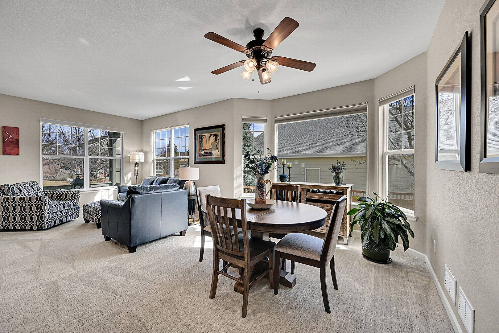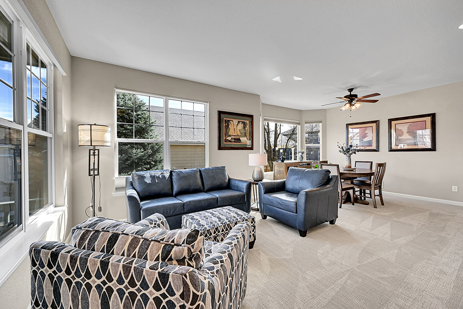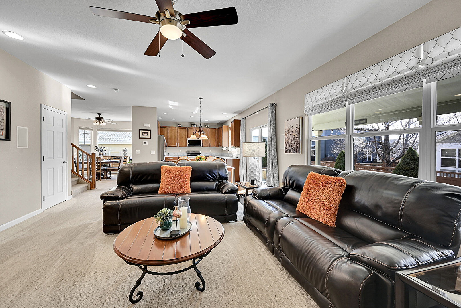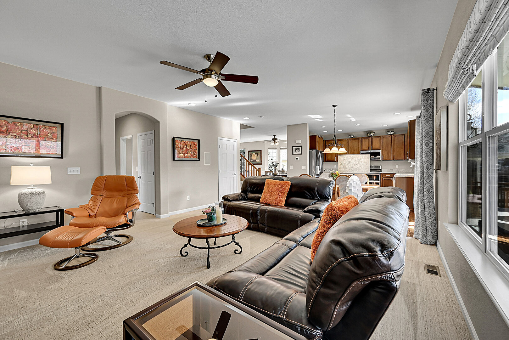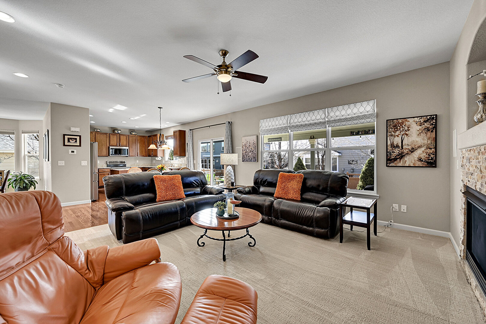 Arched Walkways, Baseboards Wall, Carpet, Ceiling Fan, Drywall, Fireplace, L Shaped Kitchen, Natural Light, Recessed Lighting, Stairs, Vent, Arched Walkways, Carpet, Ceiling Fan, Recessed Lighting