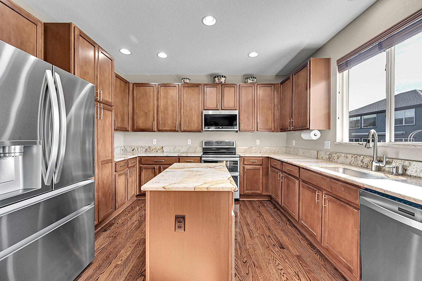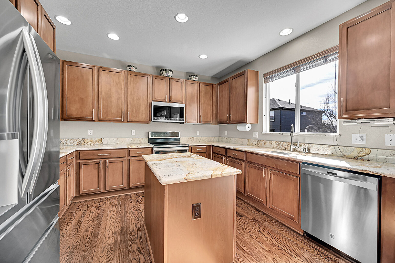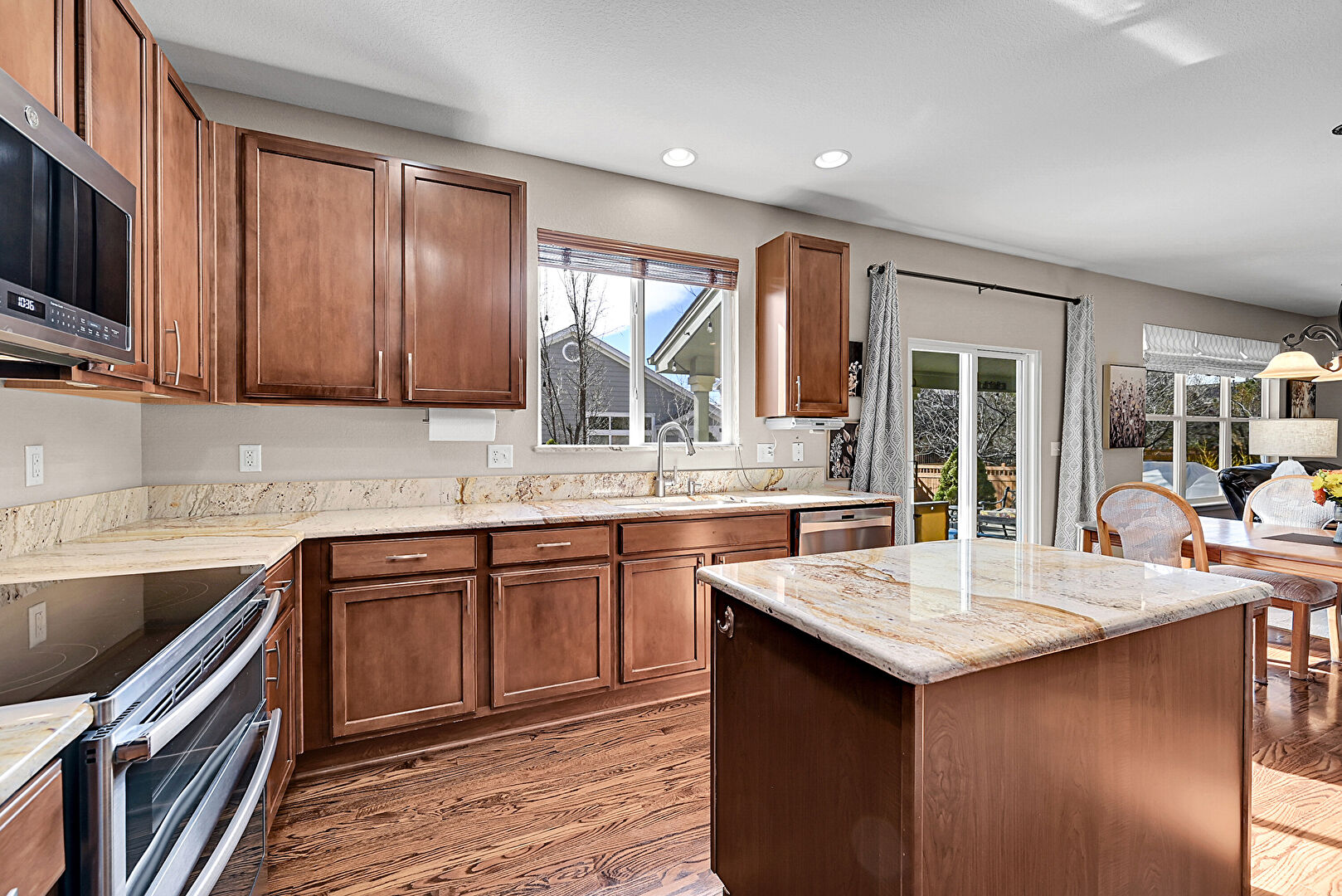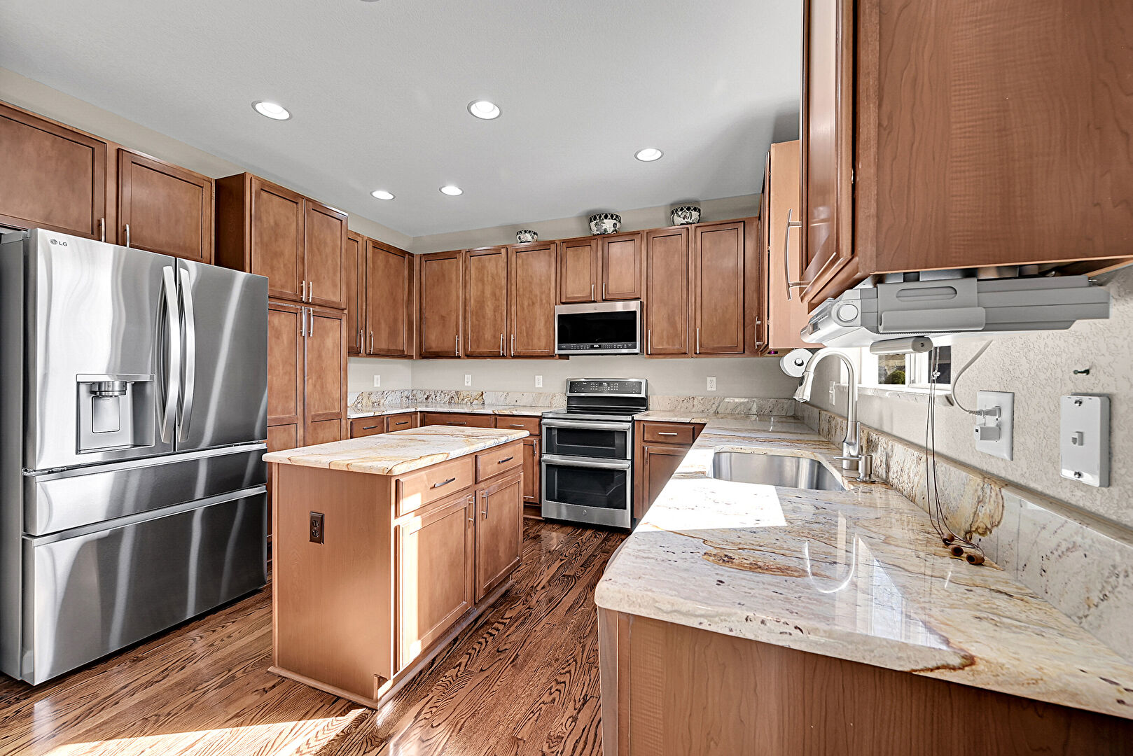 Arched Walkways, Baseboards Wall, Ceiling Fan, Drywall, Kitchen Island, Medium Brown Cabinets, Natural Light, Opens To Living Area, Pendant Lighting, Recessed Lighting, Shaker Cabinets, Stone Countertops, U Shaped Kitchen, Wood Finish Floor, Drywall, Kitchen Island, Recessed Lighting, Stone Countertops