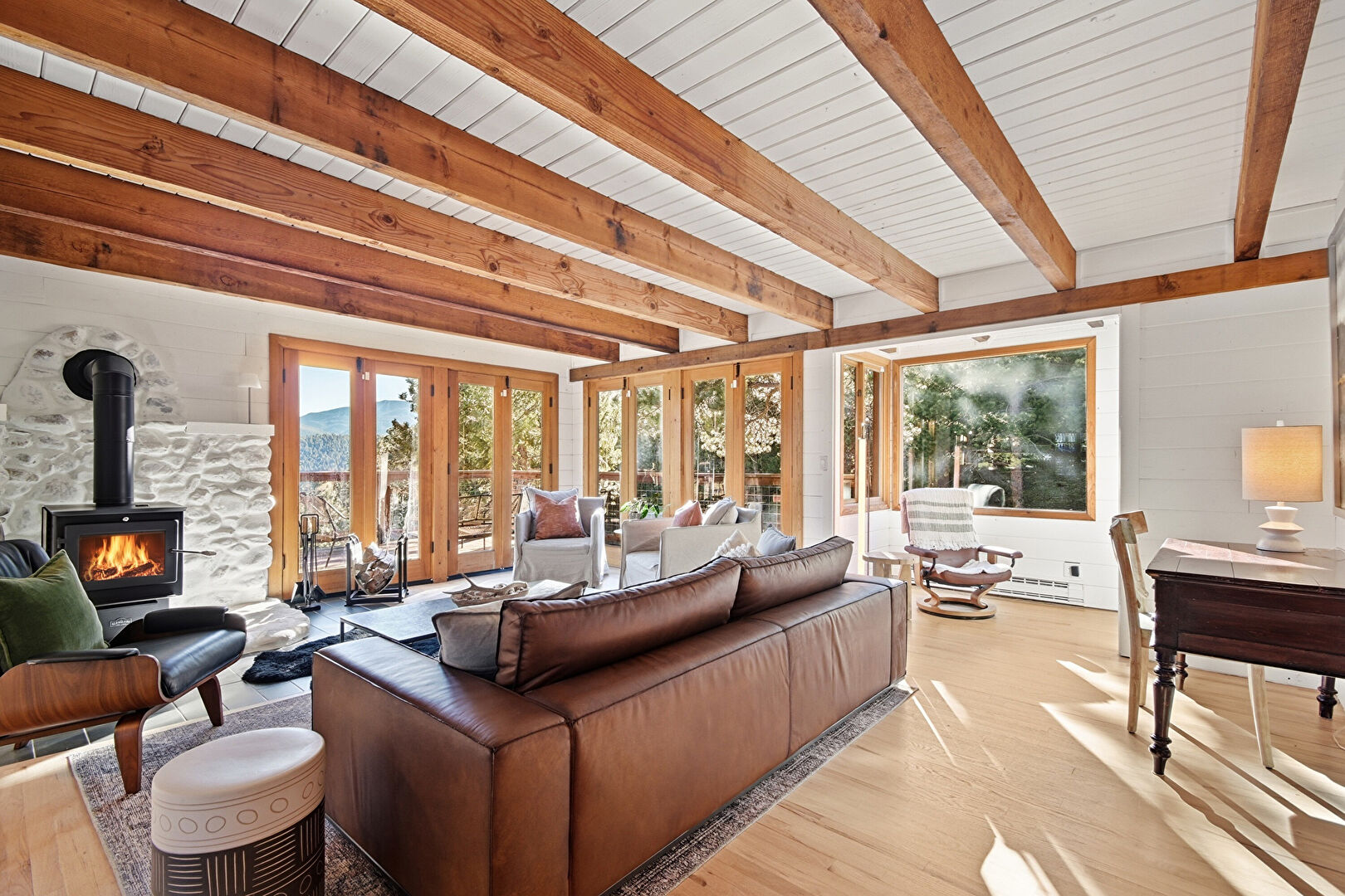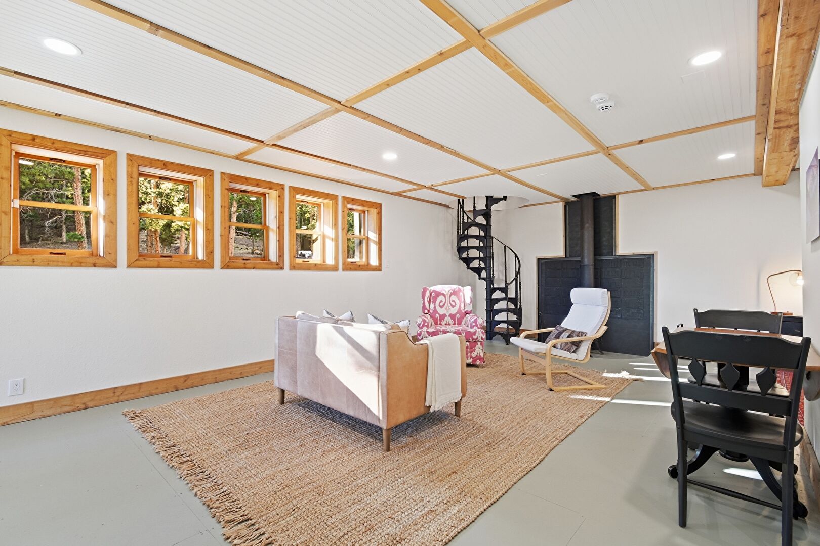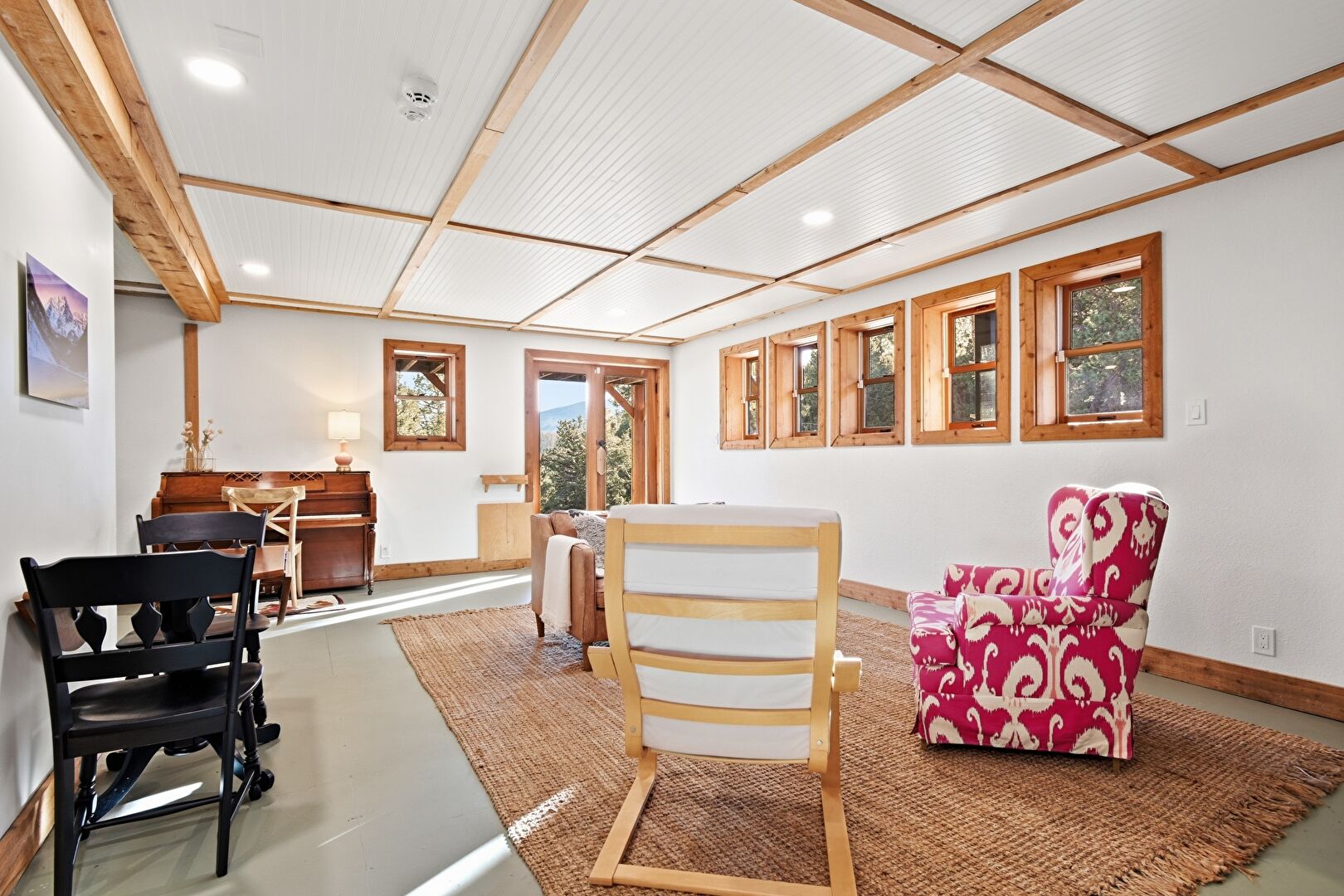 Access To Exterior, Baseboard Radiator, Baseboards Wall, Beamed Ceiling, Ceiling Fan, Concrete Floor, Drywall, French Doors, High Ceiling, Mountain View, Natural Light, Radiator, Recessed Lighting, Vaulted Ceiling, Vent, Wood Ceiling, Wood Finish Floor, Wood Wall, Access To Exterior, Basement, Beamed Ceiling, Concrete Floor, Drywall, Ensuite Bathroom, Natural Light, Vaulted Ceiling