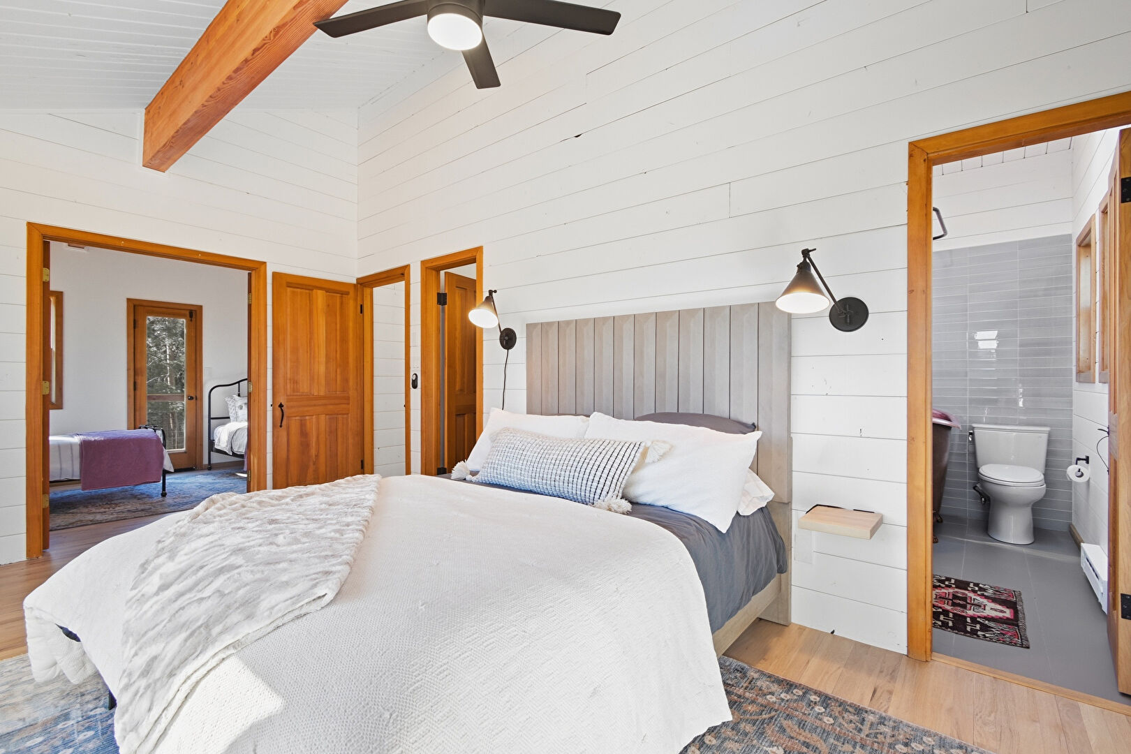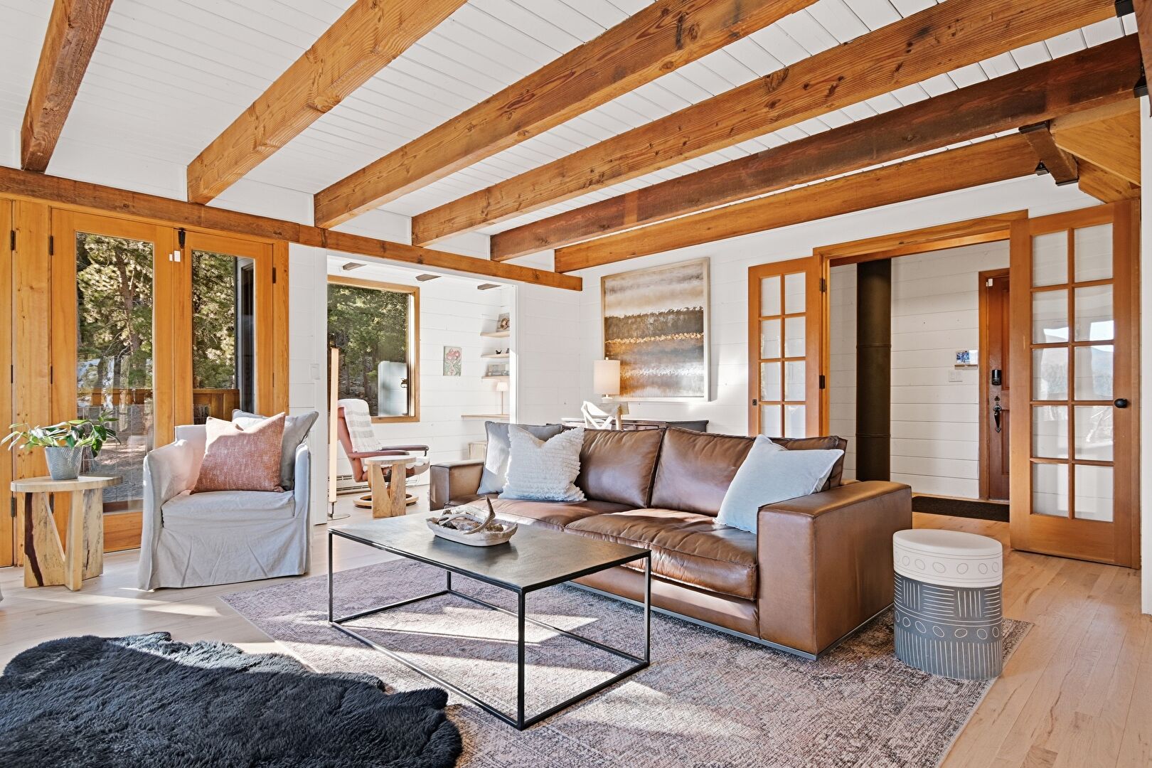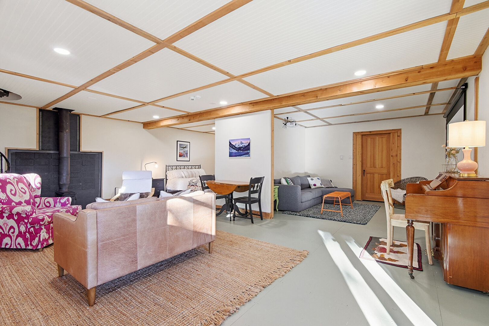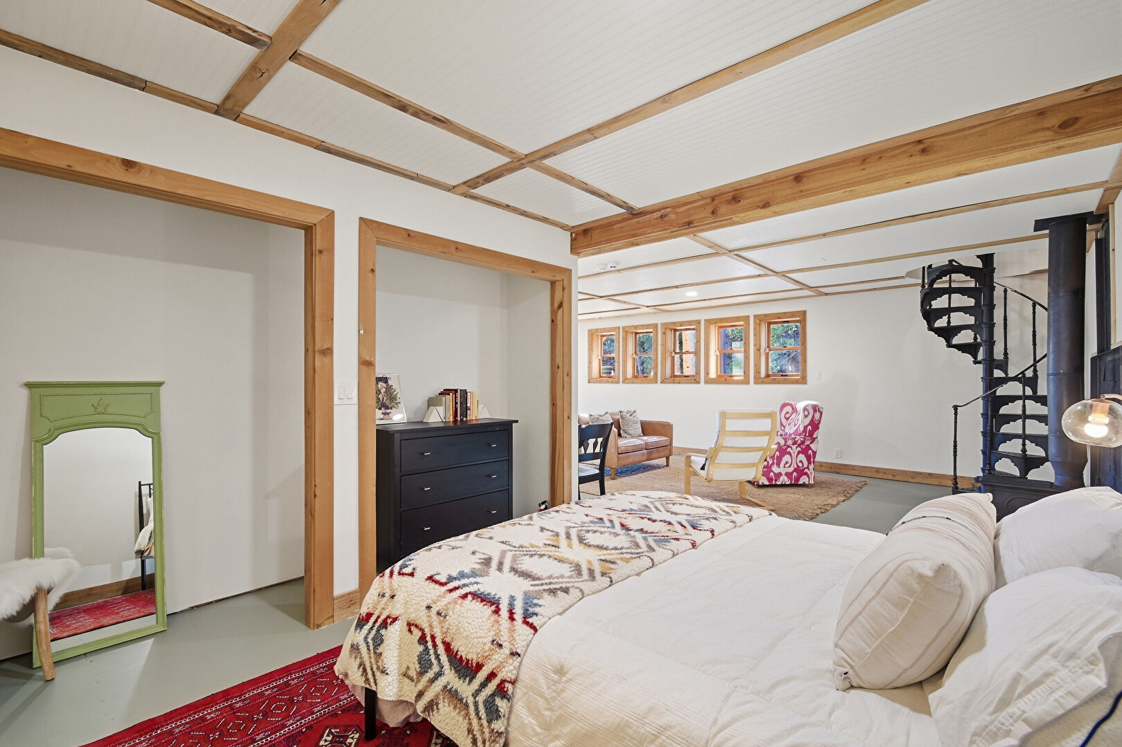 Access To Exterior, Baseboard Radiator, Baseboards Wall, Beamed Ceiling, Ceiling Fan, Concrete Floor, Drywall, French Doors, High Ceiling, Mountain View, Natural Light, Radiator, Recessed Lighting, Vaulted Ceiling, Vent, Wood Ceiling, Wood Finish Floor, Wood Wall, Access To Exterior, Basement, Beamed Ceiling, Concrete Floor, Drywall, Ensuite Bathroom, Natural Light, Vaulted Ceiling