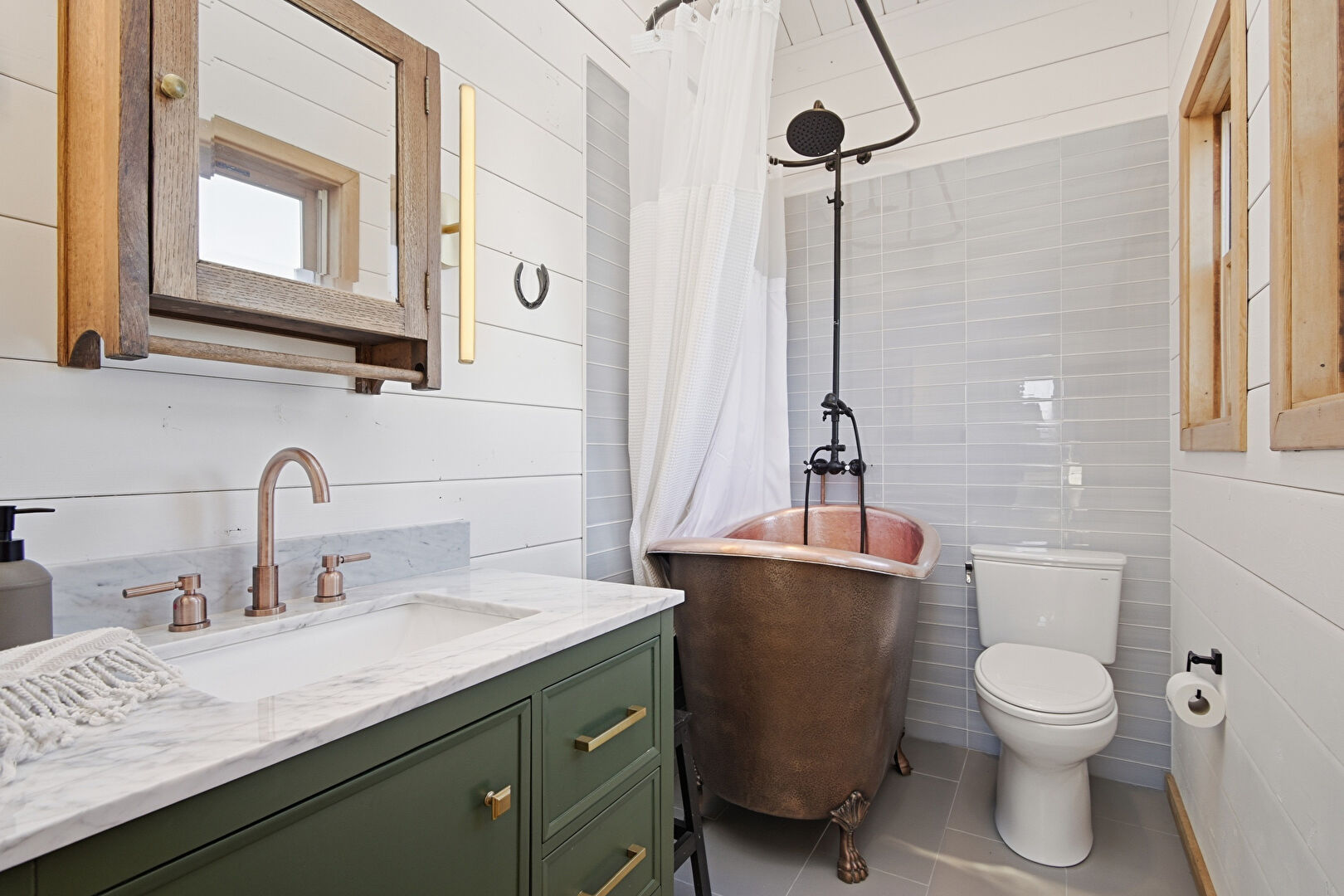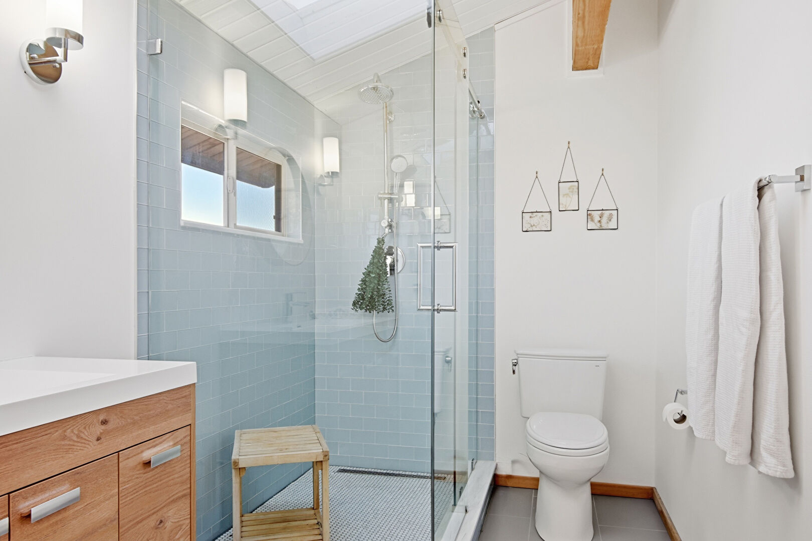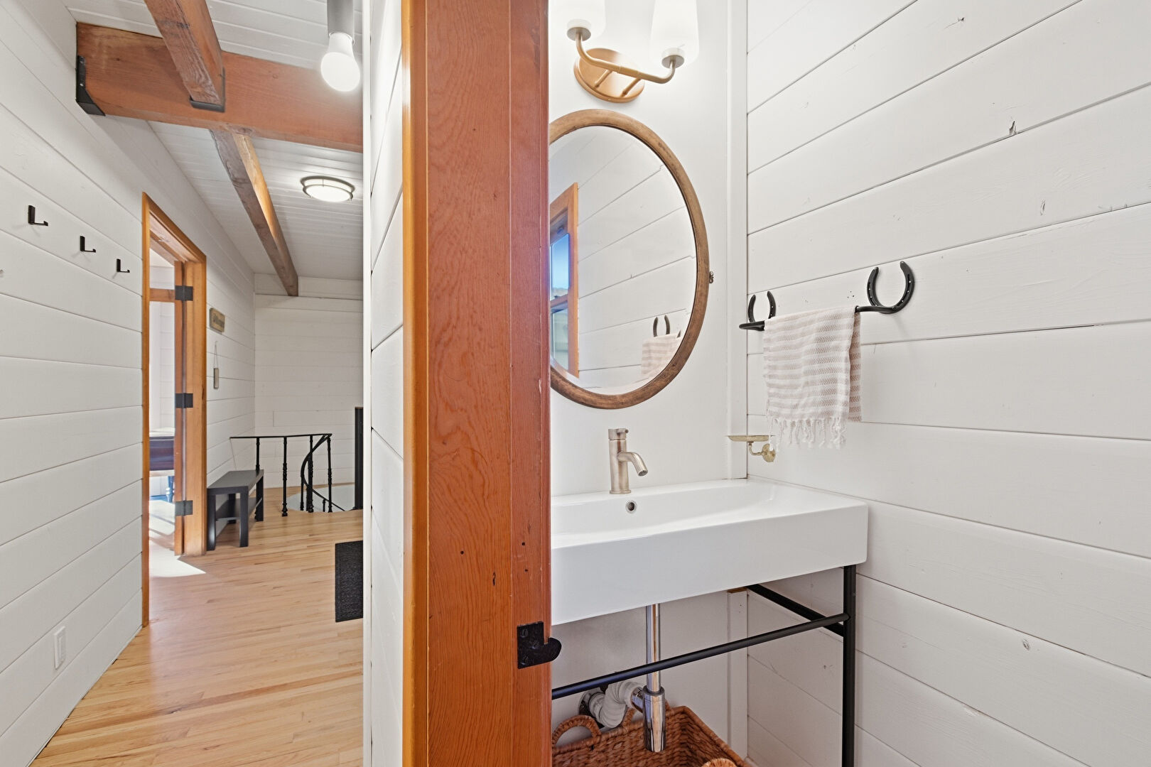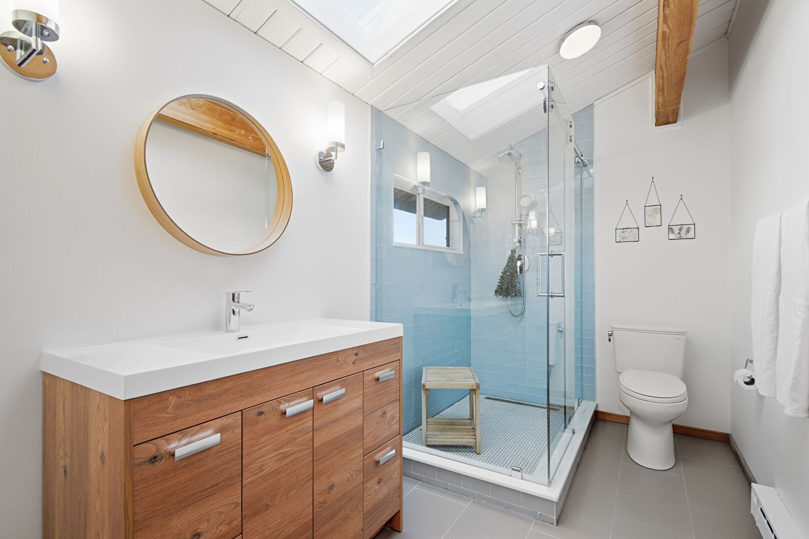 Baseboard Radiator, Baseboards Wall, Beamed Ceiling, Drywall, Full Bathroom, Half Bathroom, Natural Light, Skylight, Tile Floor, Tile Wall, Vanity, Vaulted Ceiling, Wood Ceiling, Wood Finish Floor, Wood Wall, Beamed Ceiling, Combined Bath Shower, Full Bathroom, Vanity, Wood Finish Floor