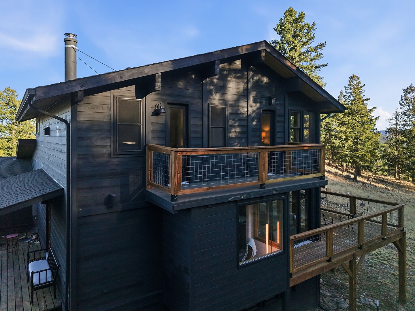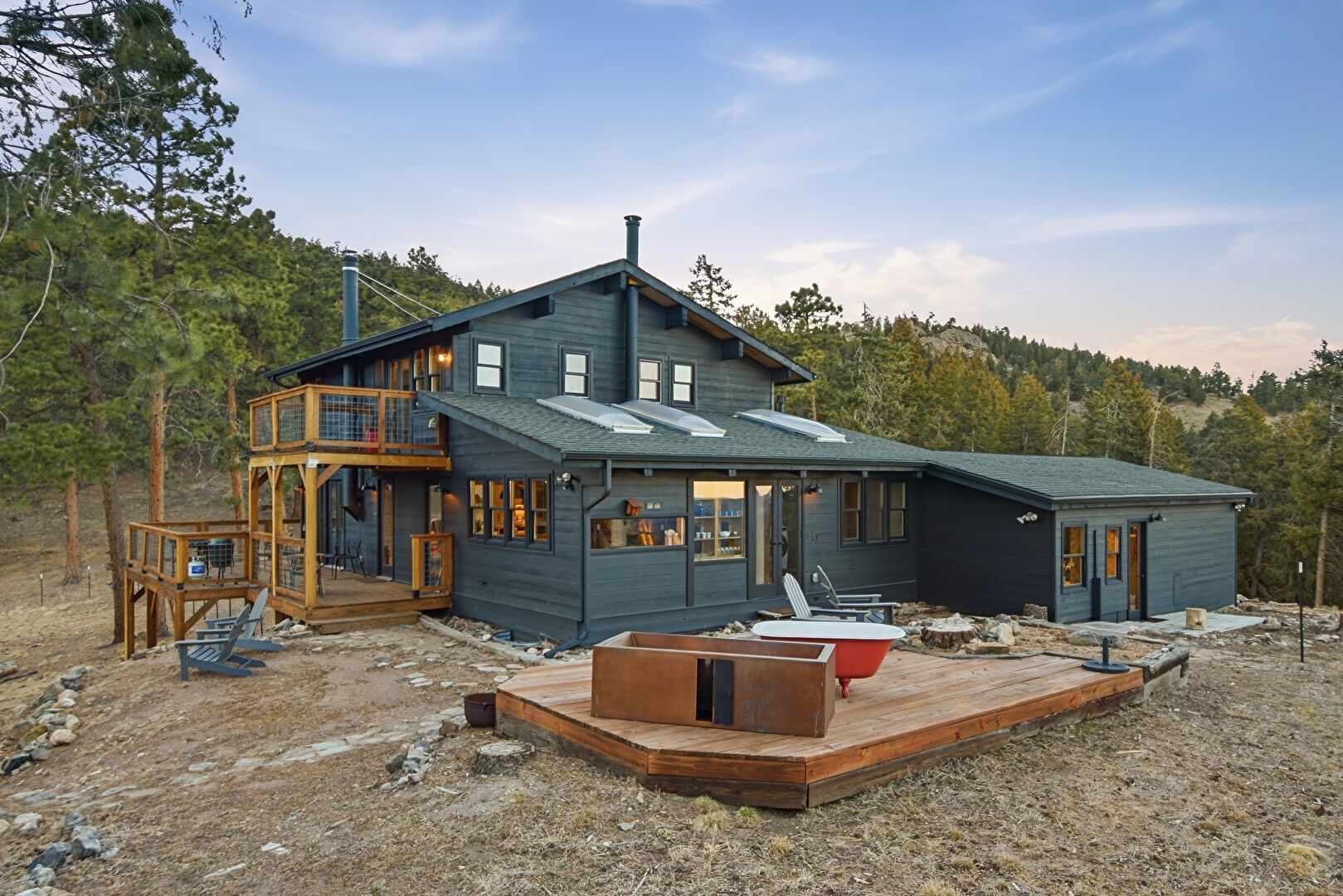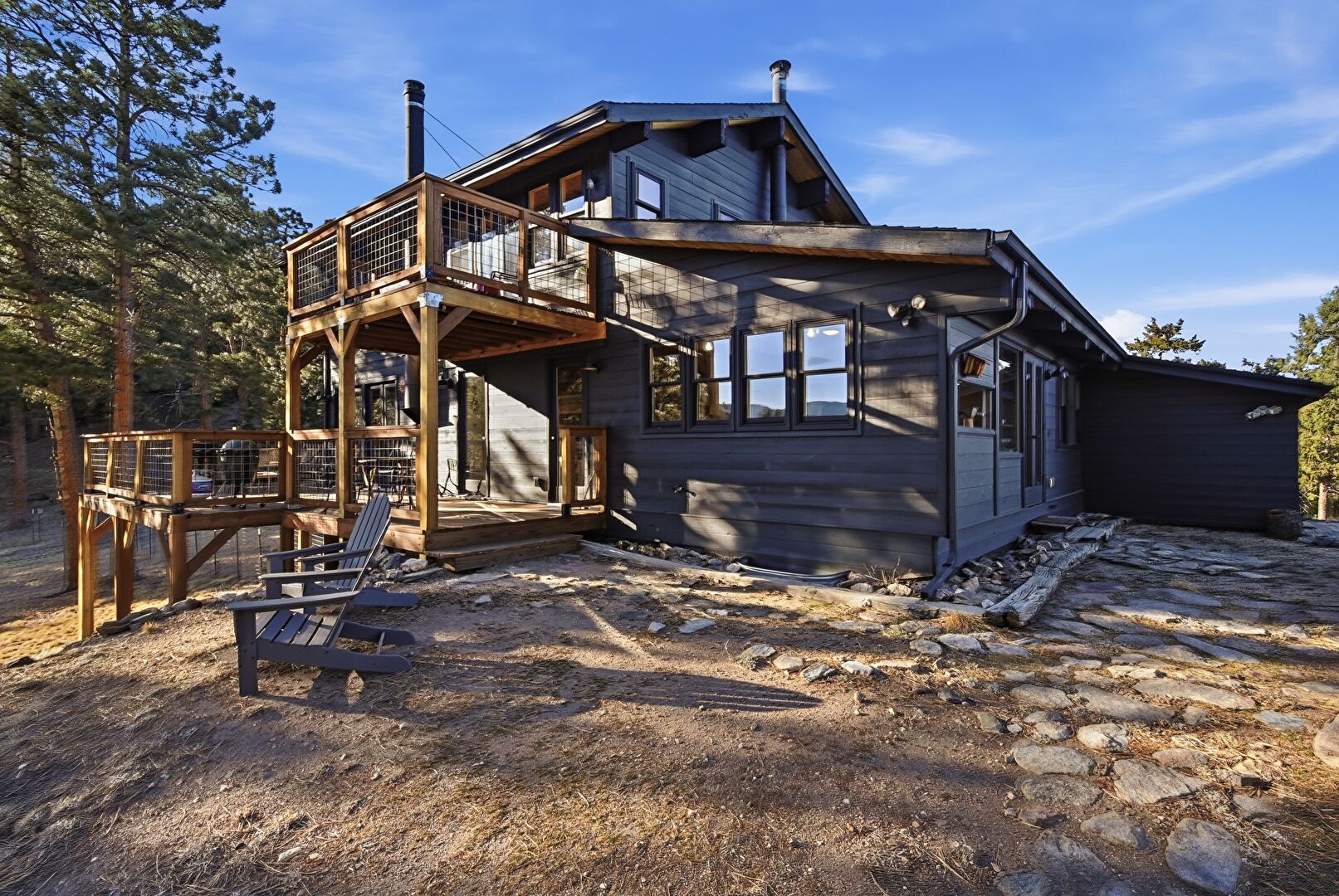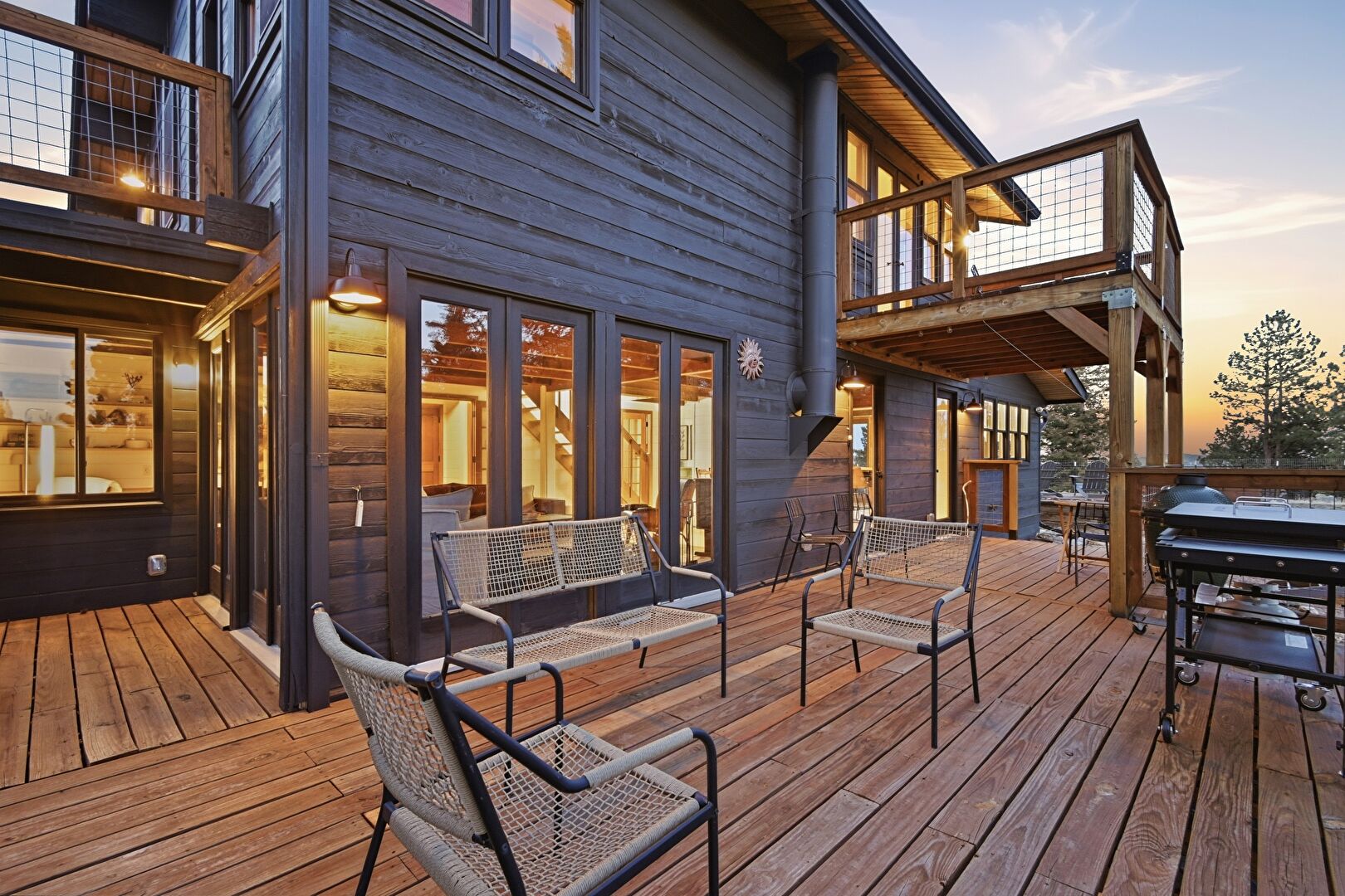 Balcony, Chimney, Deck, Downspout, Driveway, Forest View, Gutters, Horizontal Siding, Lawn, Mountain View, Patio, Shingle Roof, Stairs, Wood Siding, Balcony, Deck, Downspout, Forest View, Gutters, Horizontal Siding, Lawn, Patio
