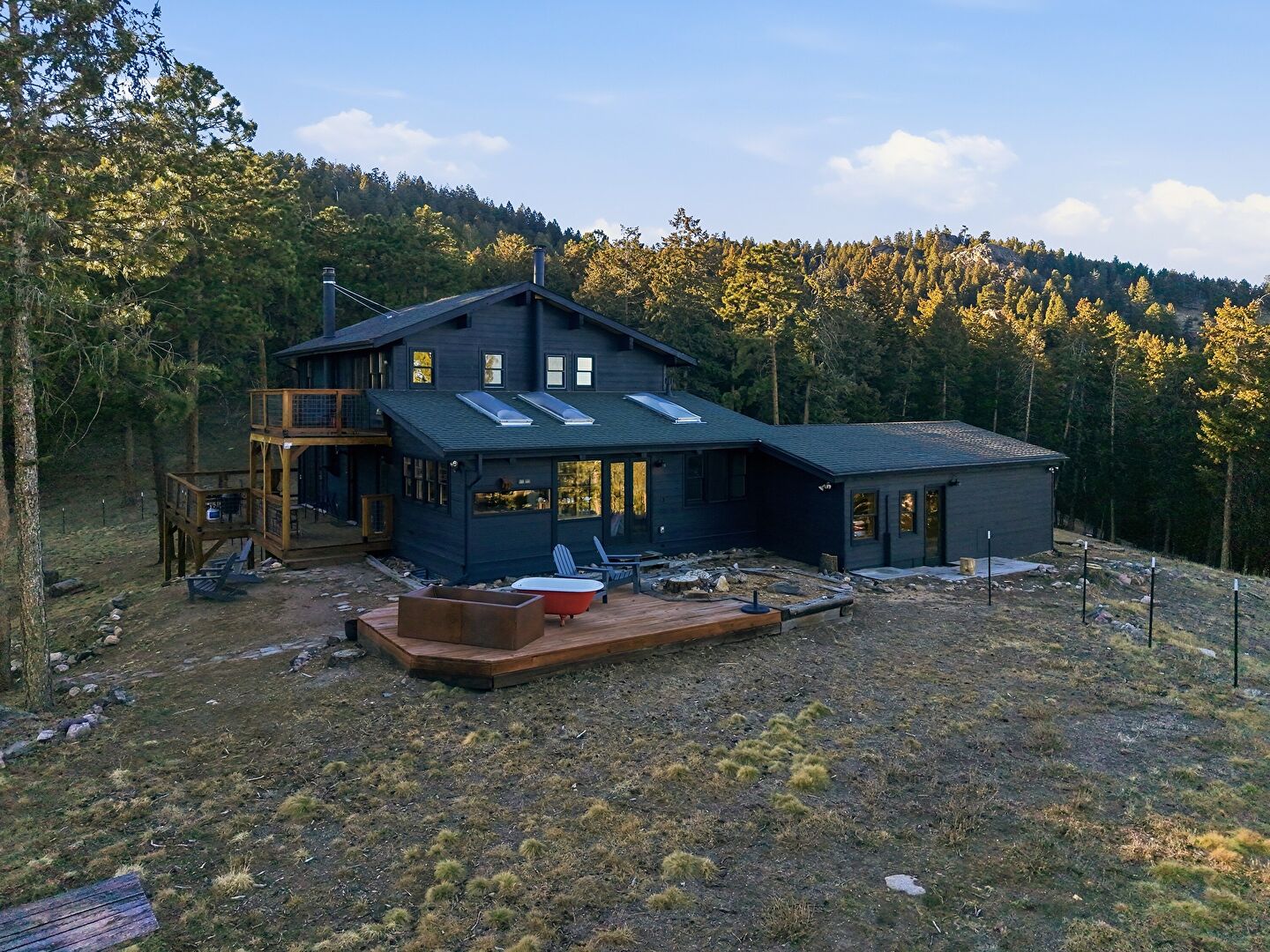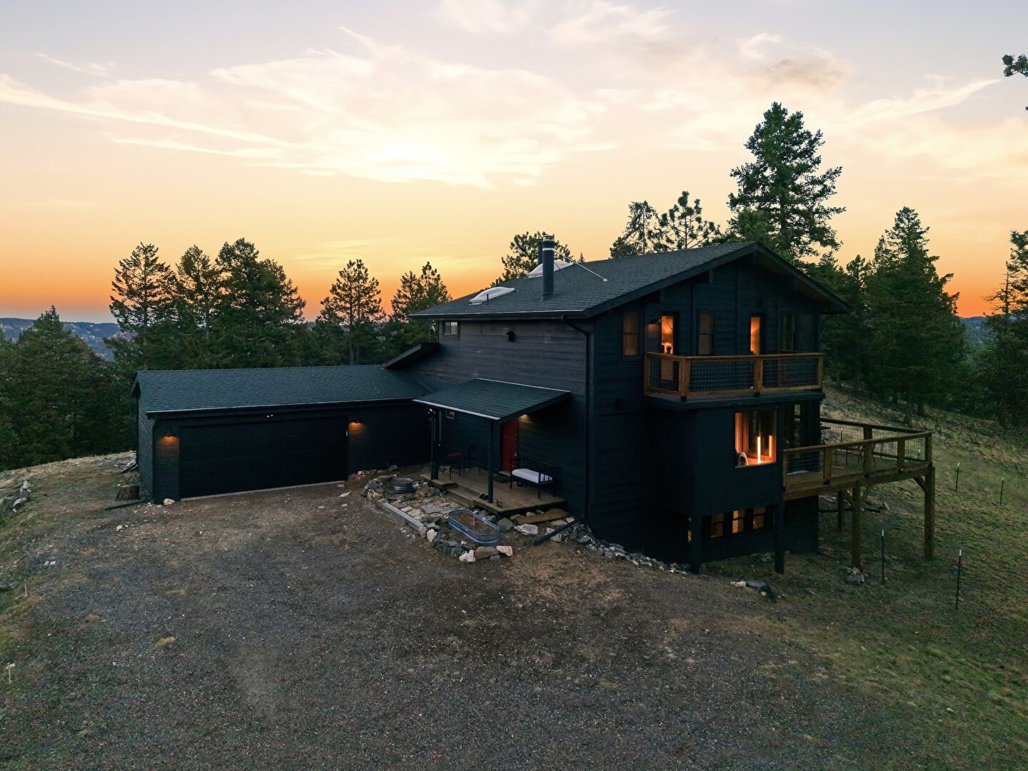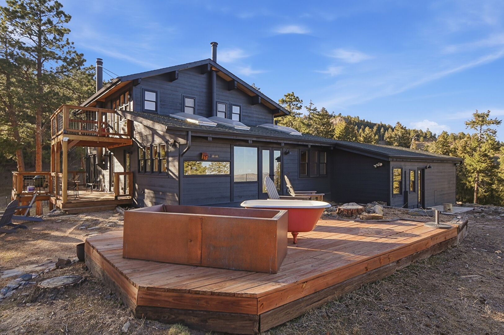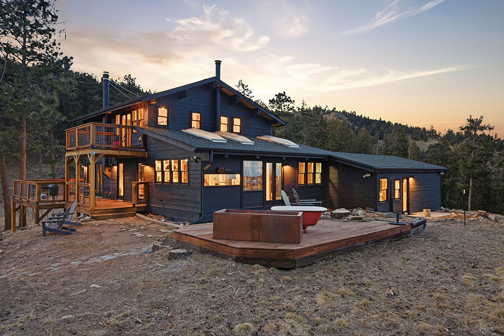 Balcony, Chimney, Deck, Downspout, Driveway, Forest View, Gutters, Horizontal Siding, Lawn, Mountain View, Patio, Shingle Roof, Stairs, Wood Siding, Balcony, Deck, Downspout, Forest View, Gutters, Horizontal Siding, Lawn, Patio