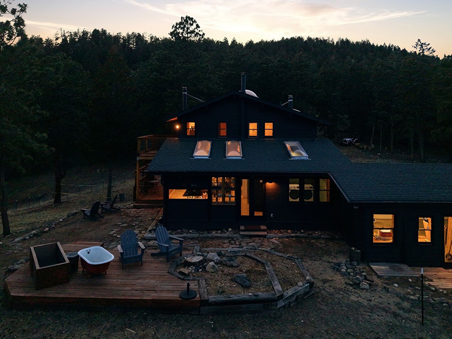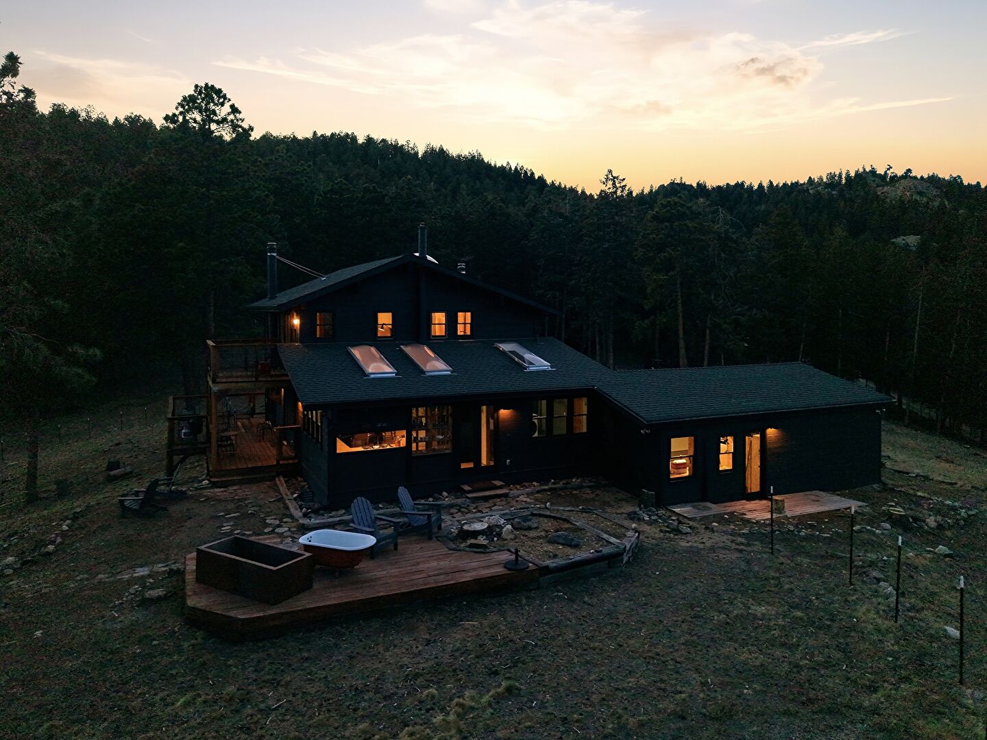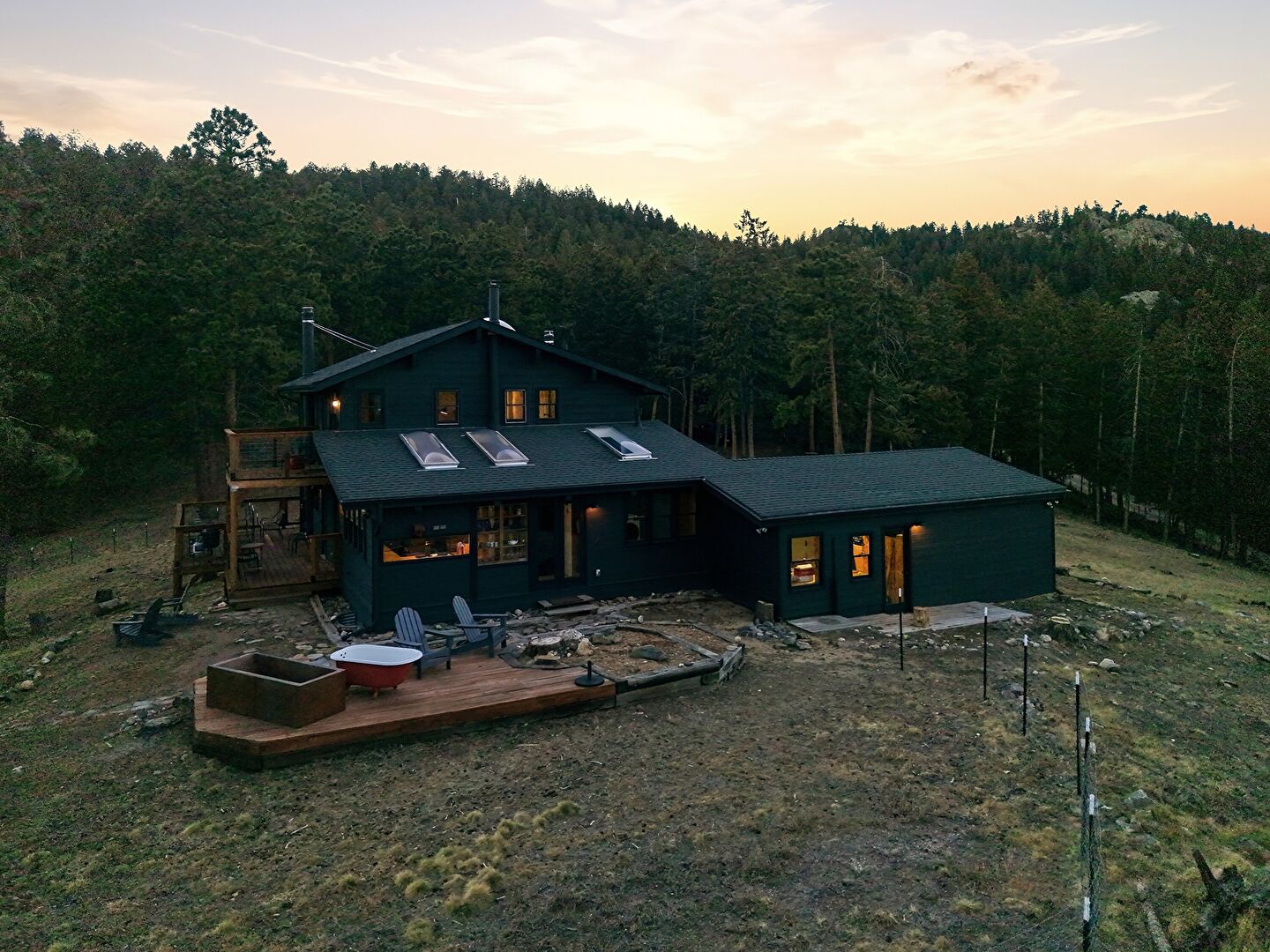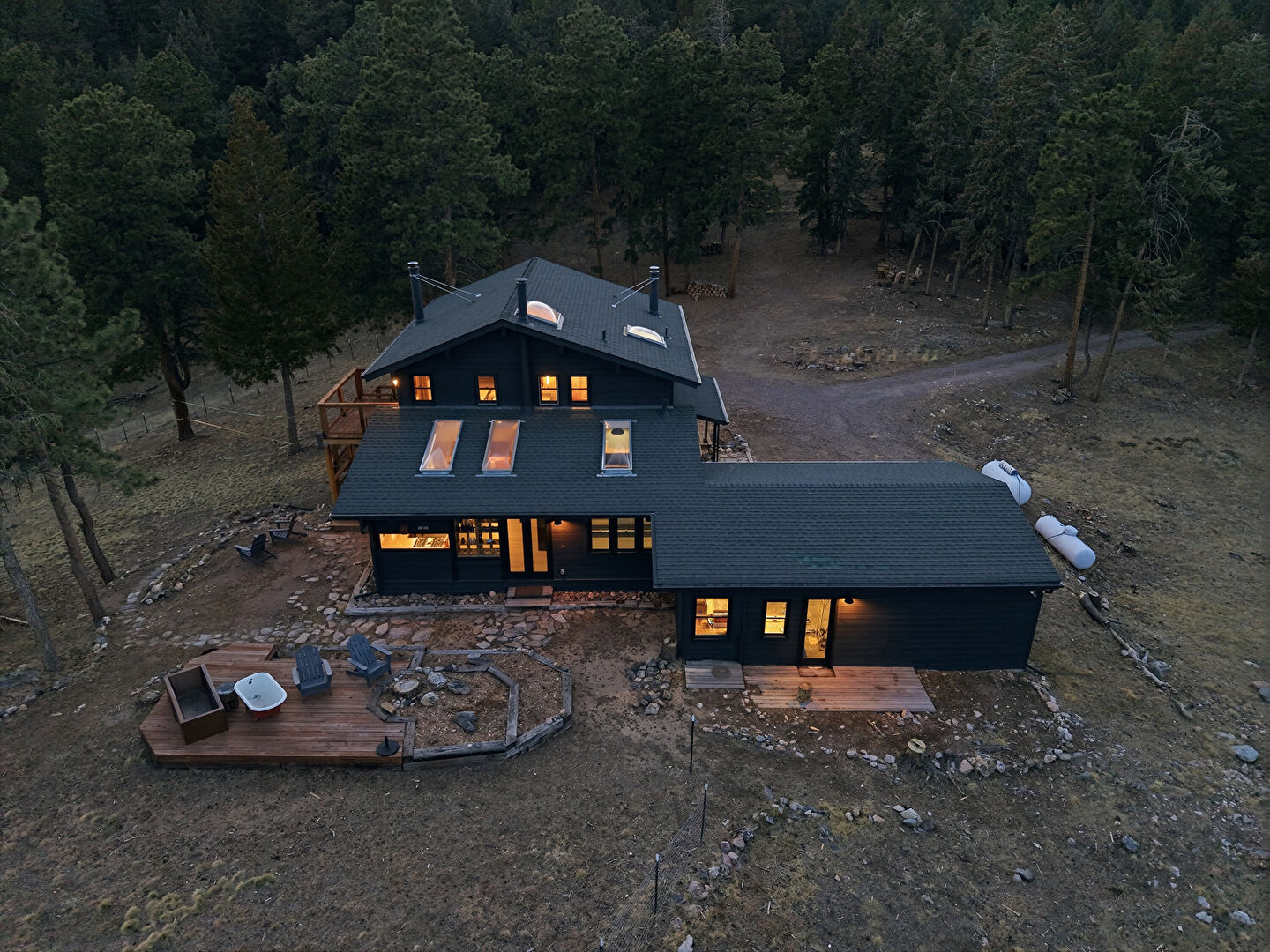 Balcony, Chimney, Deck, Downspout, Driveway, Forest View, Gutters, Horizontal Siding, Lawn, Mountain View, Patio, Shingle Roof, Stairs, Wood Siding, Balcony, Deck, Downspout, Forest View, Gutters, Horizontal Siding, Lawn, Patio