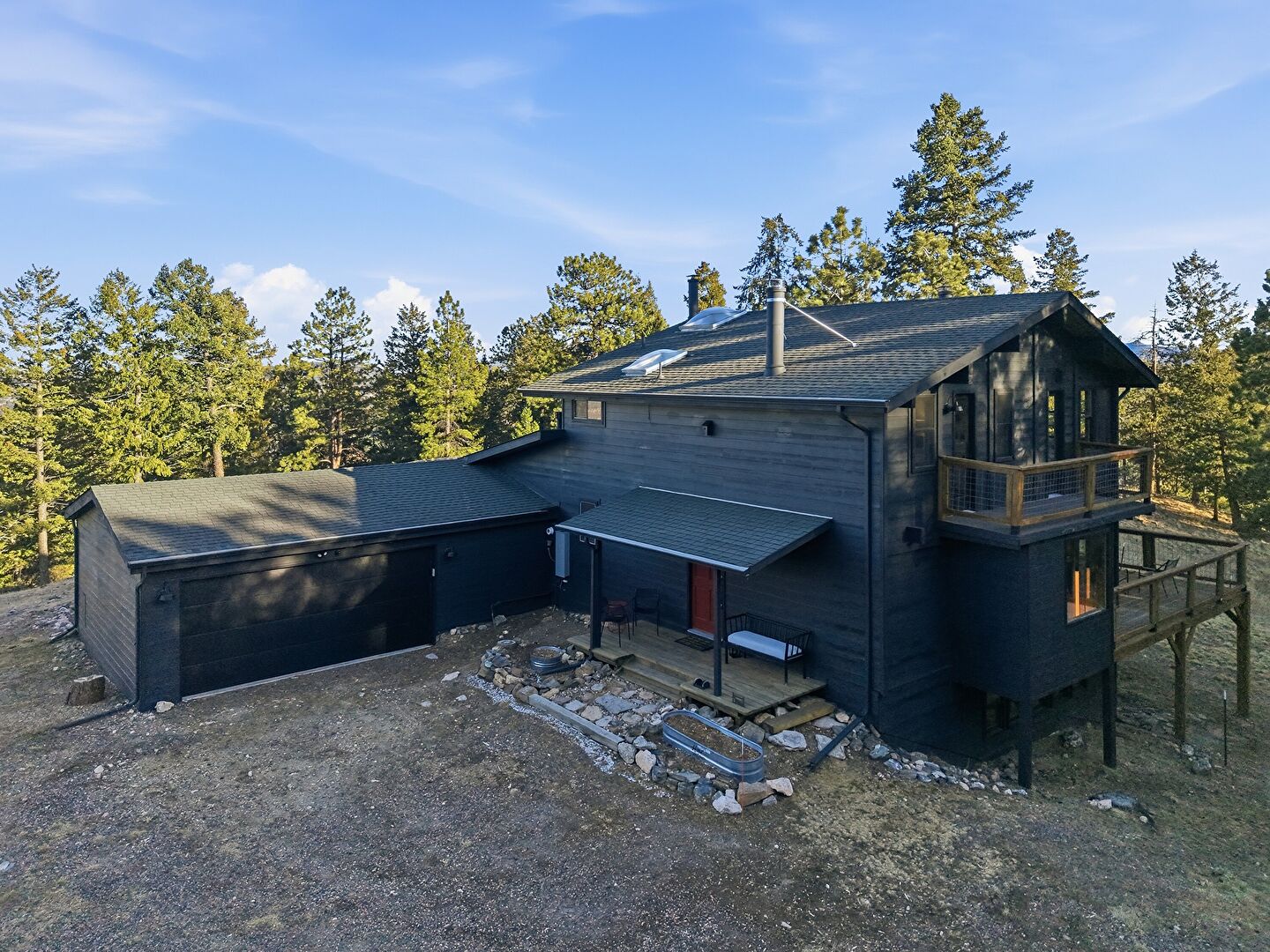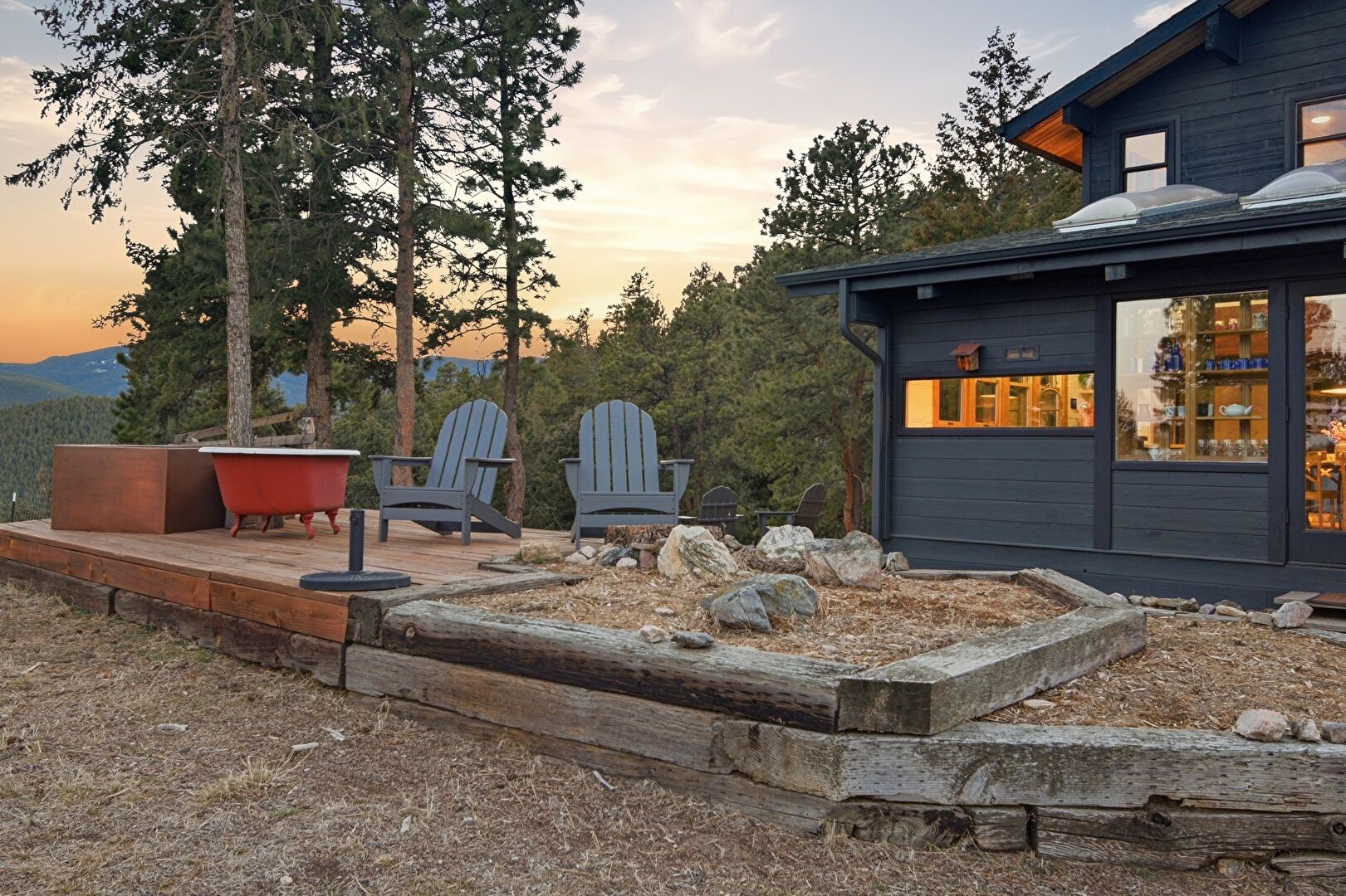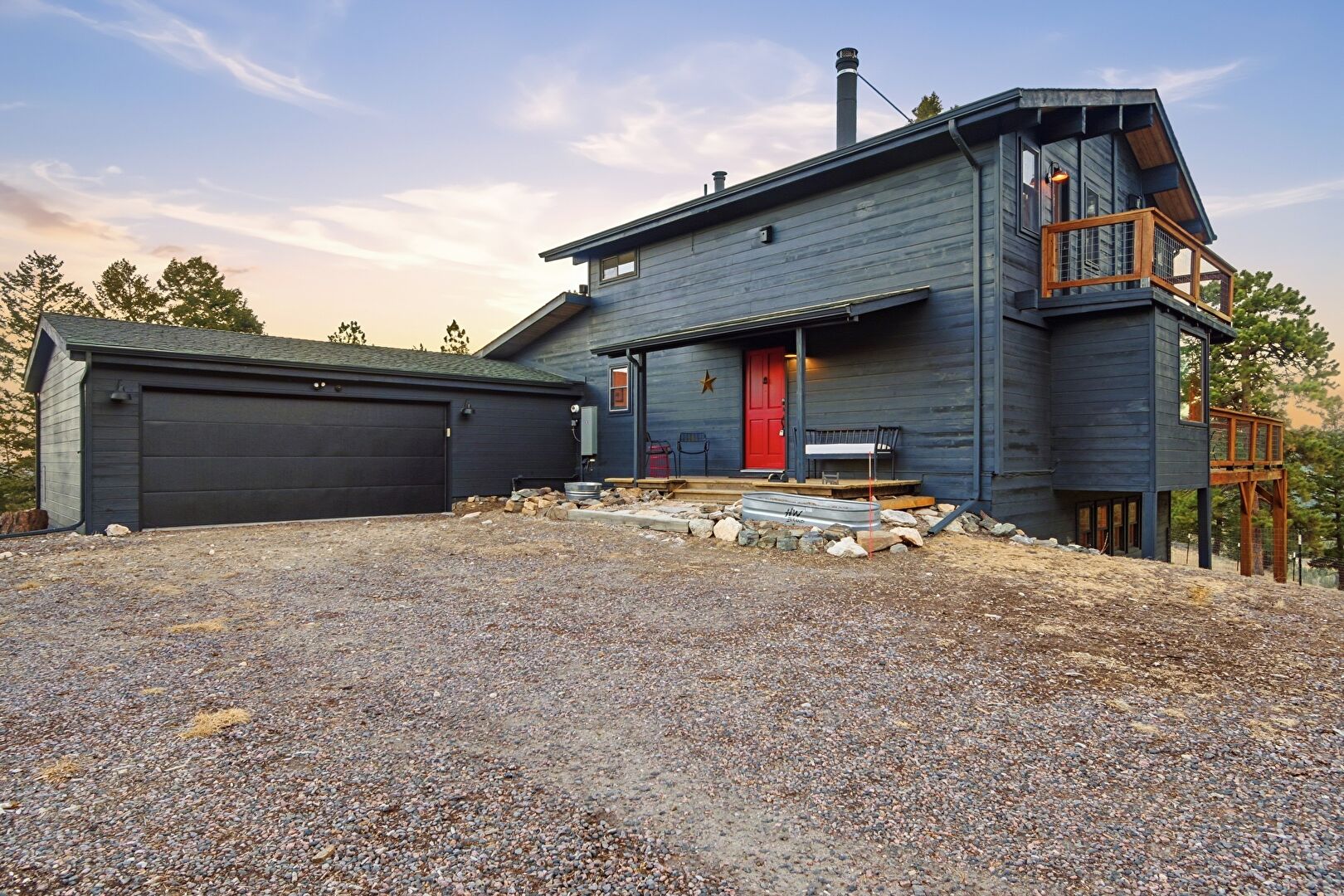Balcony, Chimney, Deck, Detached Garage, Downspout, Driveway, Fence, Fire Pit, Garage, Horizontal Siding, Lawn, Patio, Wood Siding, Deck, Downspout, Forest View, Gutters