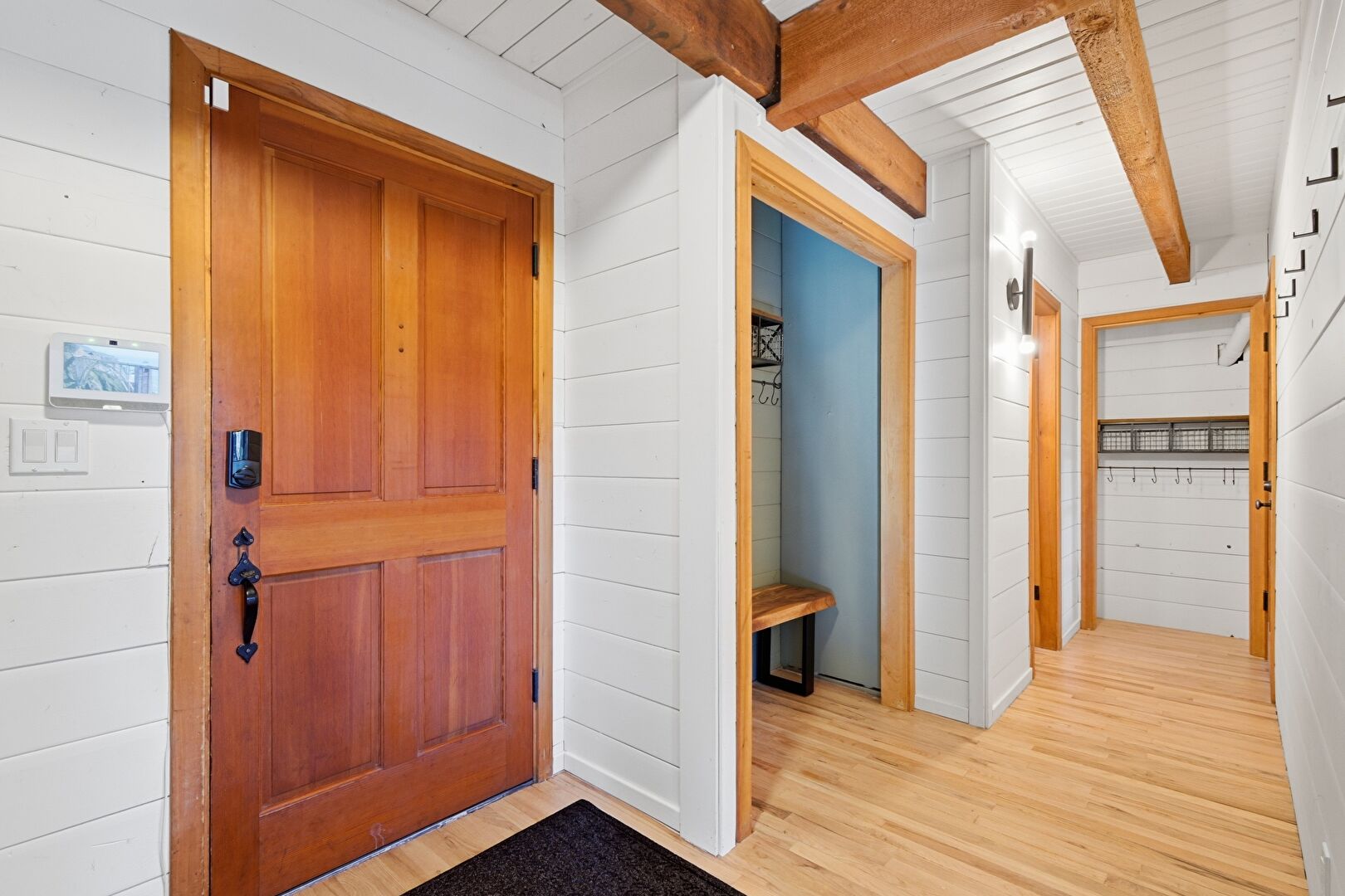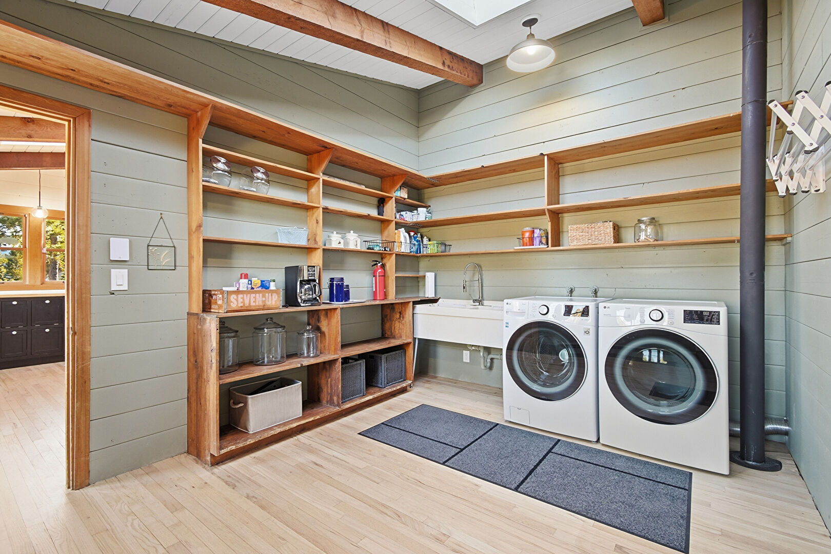 Beamed Ceiling, Fire Extinguisher, Laundry, Natural Light, Wood Ceiling, Wood Finish Floor, Wood Wall, Skylight