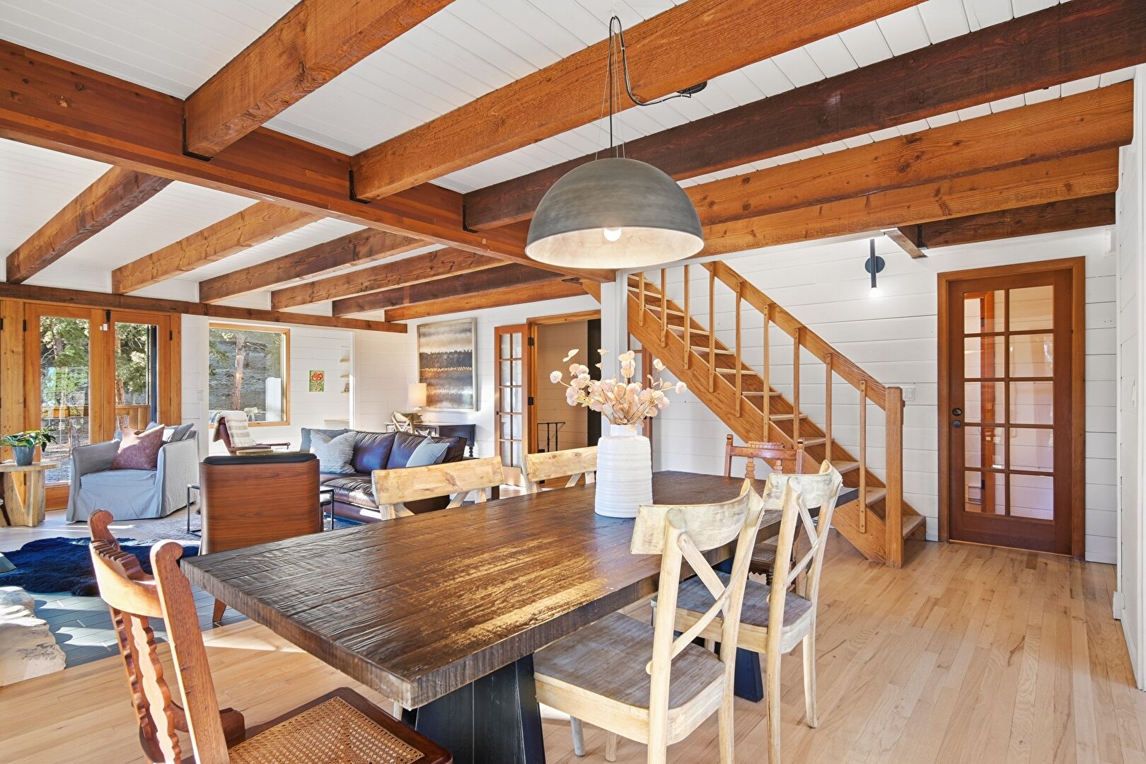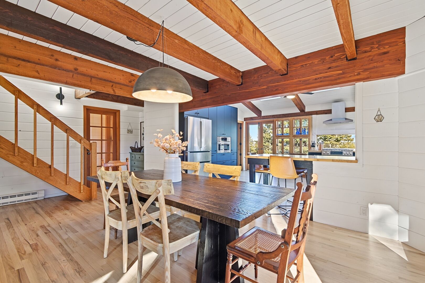 Beamed Ceiling, French Doors, Natural Light, Stairs, Wood Ceiling, Wood Finish Floor, Wood Wall, Baseboard Radiator, Beamed Ceiling, Wood Ceiling