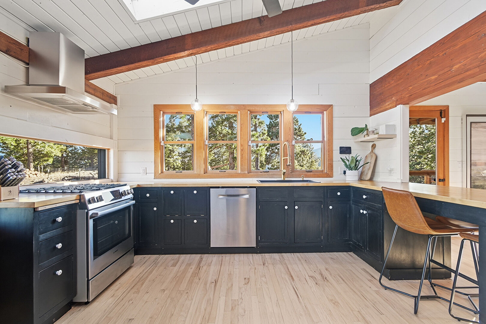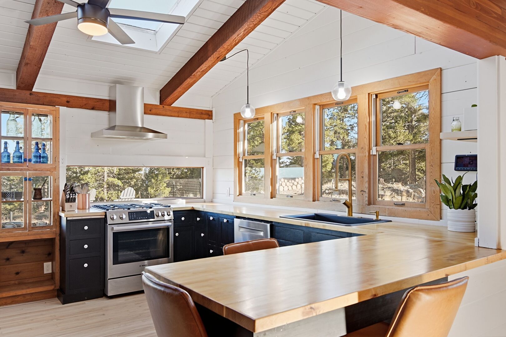 Beamed Ceiling, Black Cabinets, Butcher Block Countertops, Ceiling Fan, Dark Brown Cabinets, High Ceiling, Kitchen Bar, Kitchen Peninsula, Natural Light, Open Shelves, Pendant Lighting, Shaker Cabinets, Skylight, Stone Countertops, Vaulted Ceiling, Wood Ceiling, Wood Finish Floor, Wood Wall, Butcher Block Countertops, Ceiling Fan, Skylight, Wood Ceiling, Wood Wall