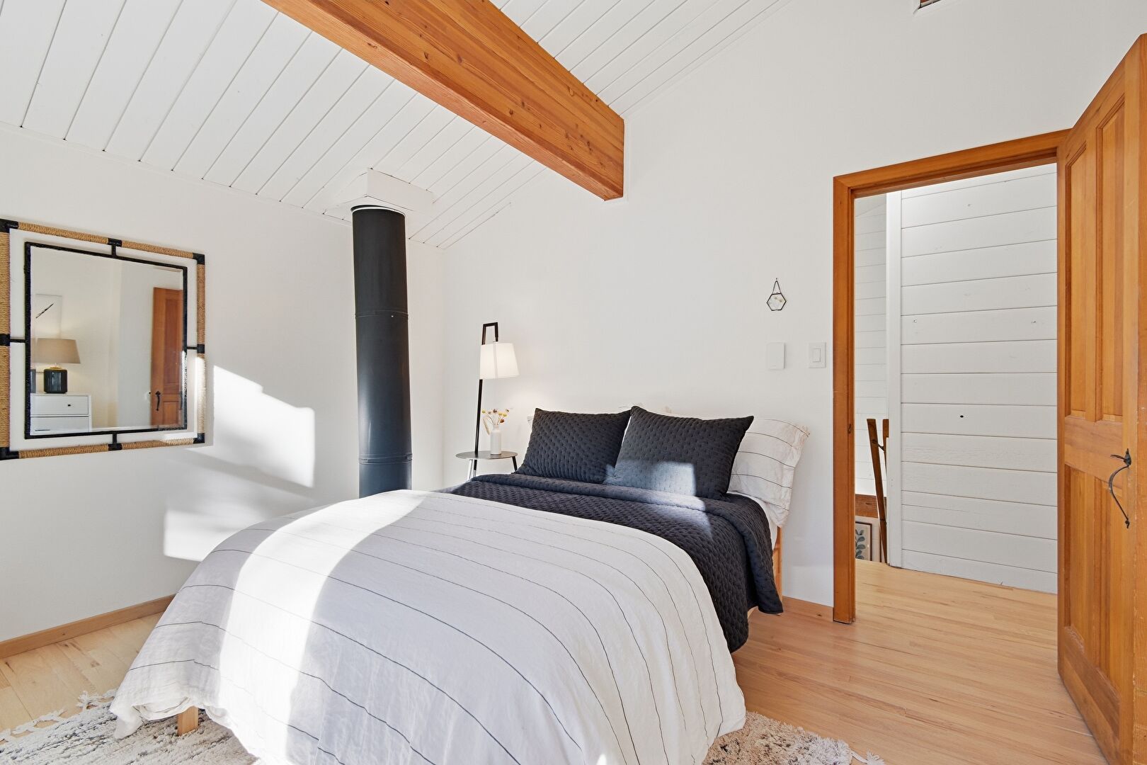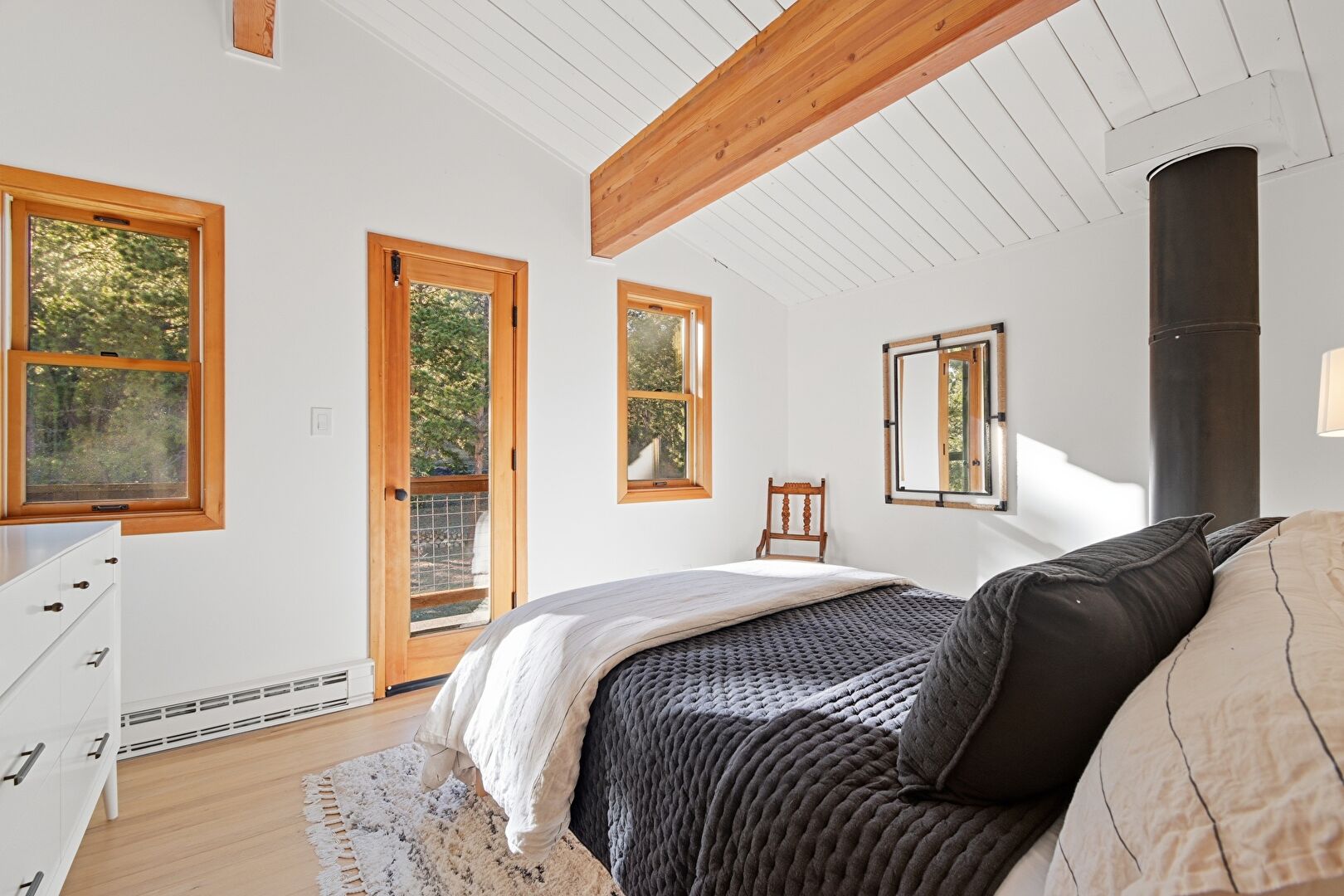 Baseboard Radiator, Beamed Ceiling, Drywall, Fire Extinguisher, Fireplace, French Doors, Natural Light, Stairs, Wood Ceiling, Wood Finish Floor, Wood Stove, Wood Wall, Beamed Ceiling, Wood Ceiling, Wood Finish Floor, Wood Stove, Wood Wall