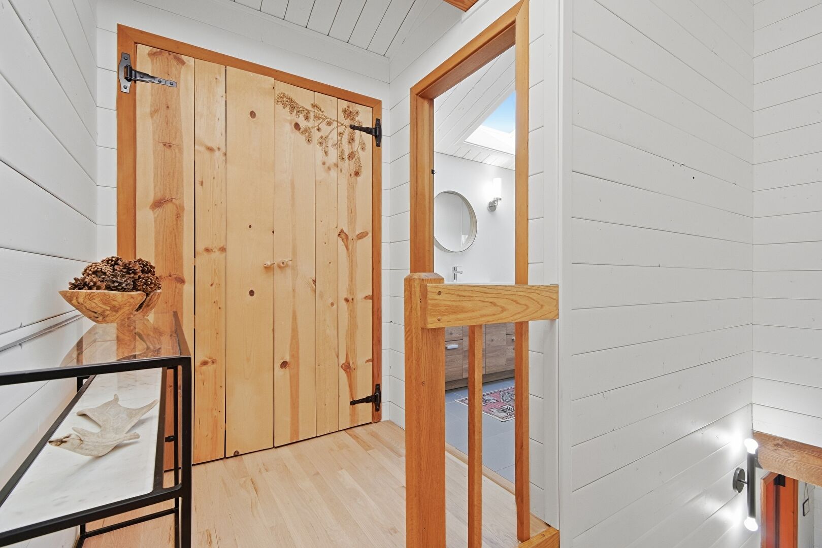 Beamed Ceiling, Mountain View, Natural Light, Wood Ceiling, Wood Finish Floor, Wood Wall, Upstairs Landing