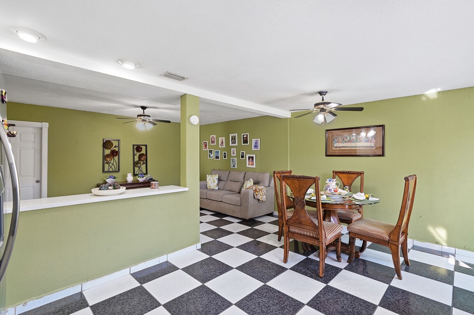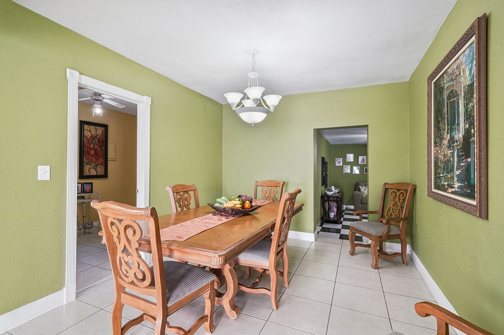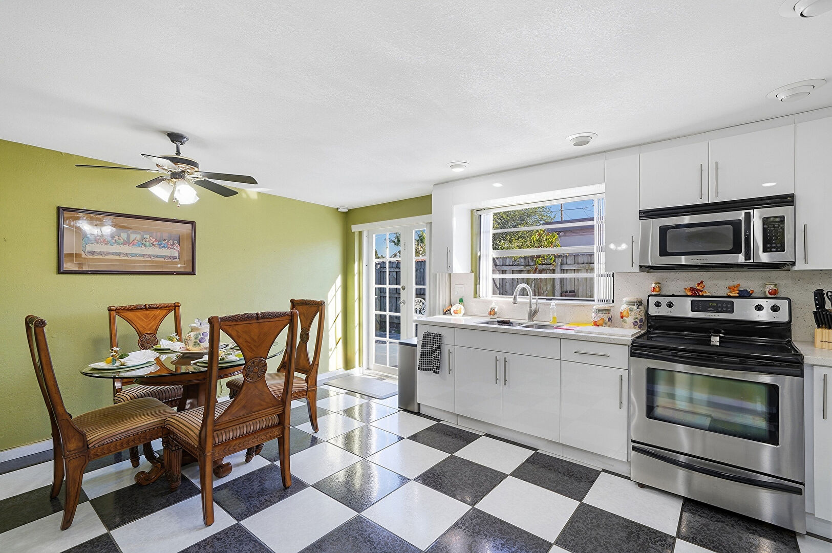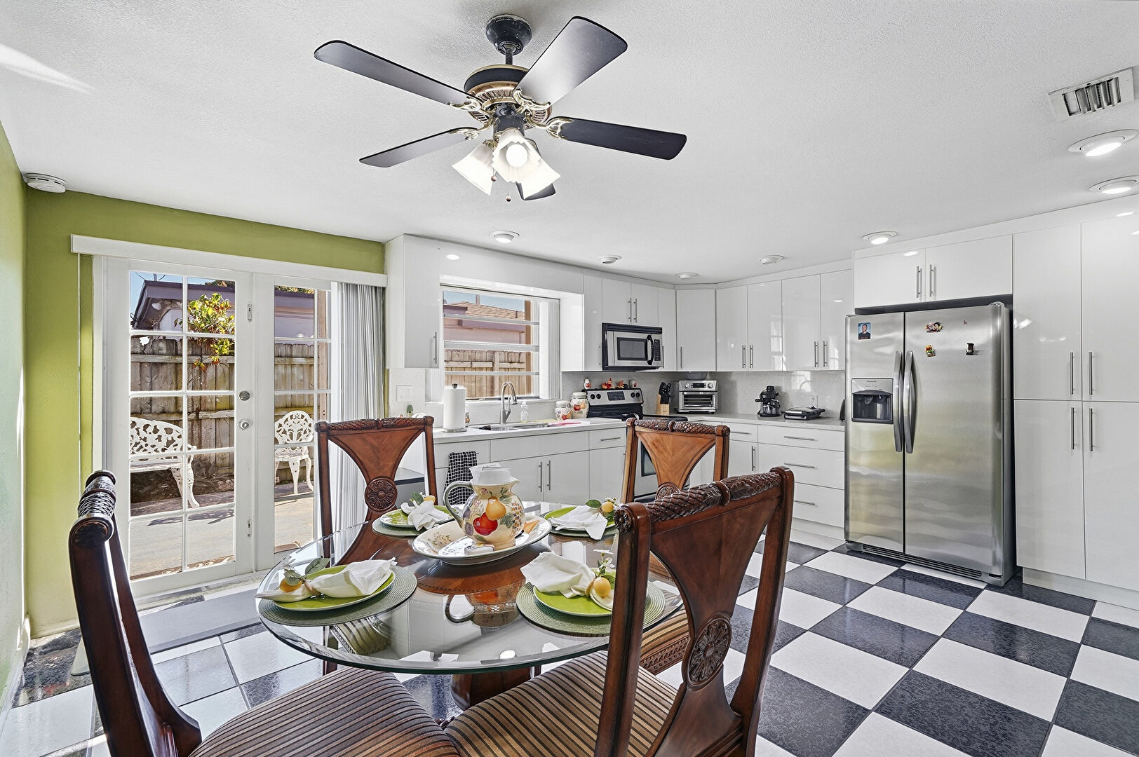 Baseboards Wall, Ceiling Fan, Drywall, French Doors, L Shaped Kitchen, Natural Light, Notable Chandelier, Recessed Lighting, Textured Wall, Tile Floor, Vent, Vinyl Floor, Baseboards Wall, Ceiling Fan, Tile Floor, Toaster
