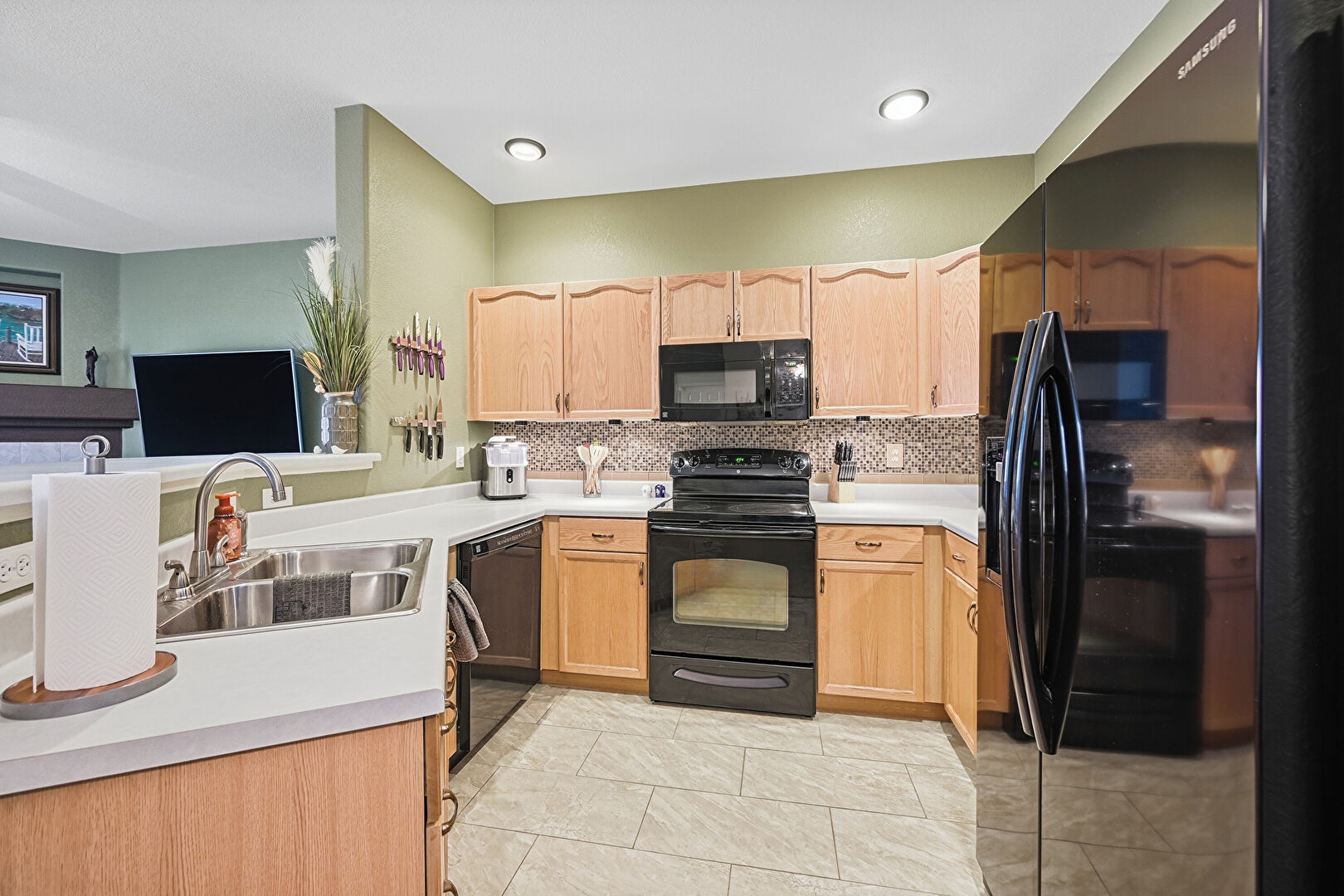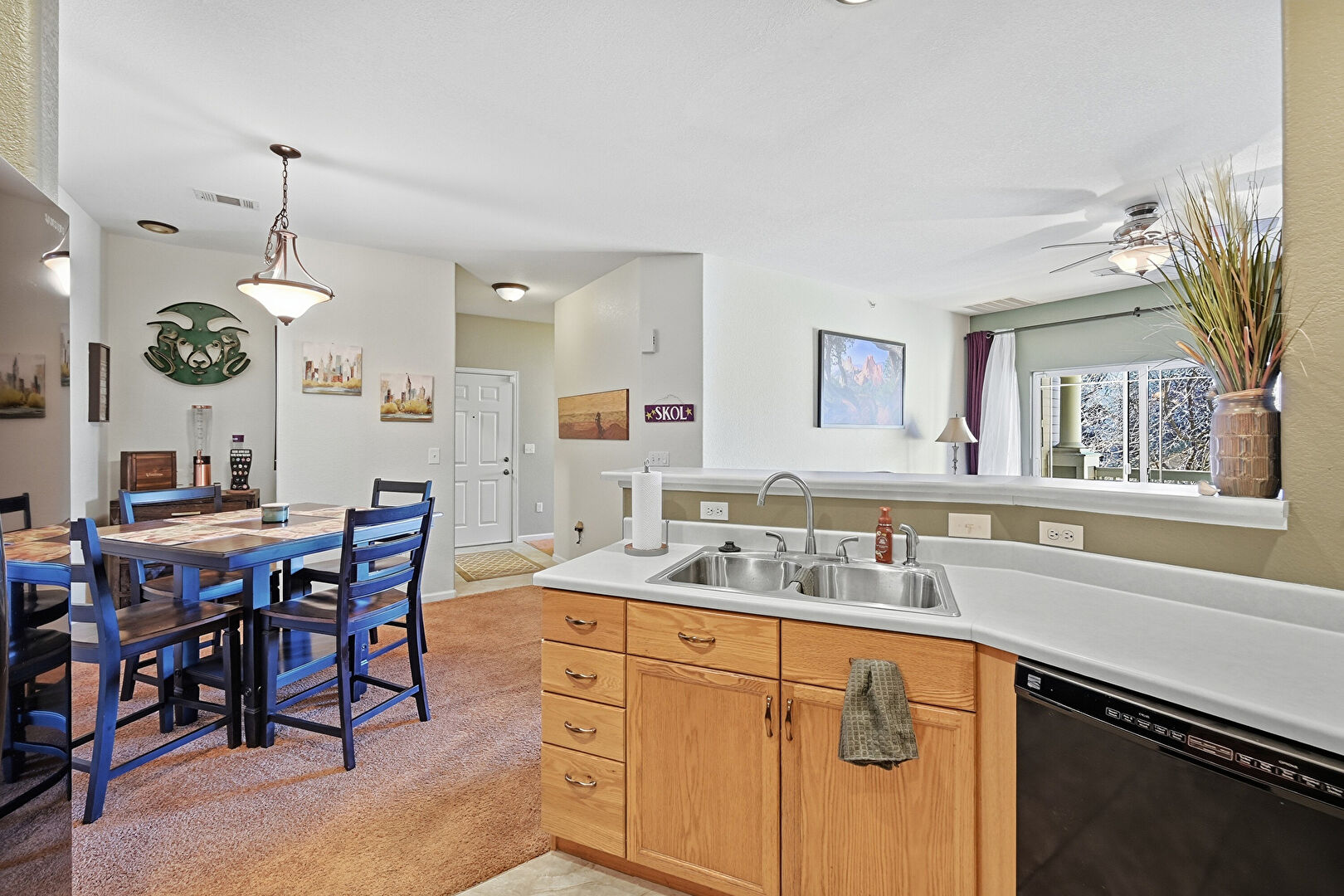 Carpet, Ceiling Fan, Drywall, Kitchen Peninsula, Natural Light, Pendant Lighting, Recessed Lighting, Shaker Cabinets, Tile Floor, U Shaped Kitchen, Vent, Arched Cabinets, Baseboards Wall
