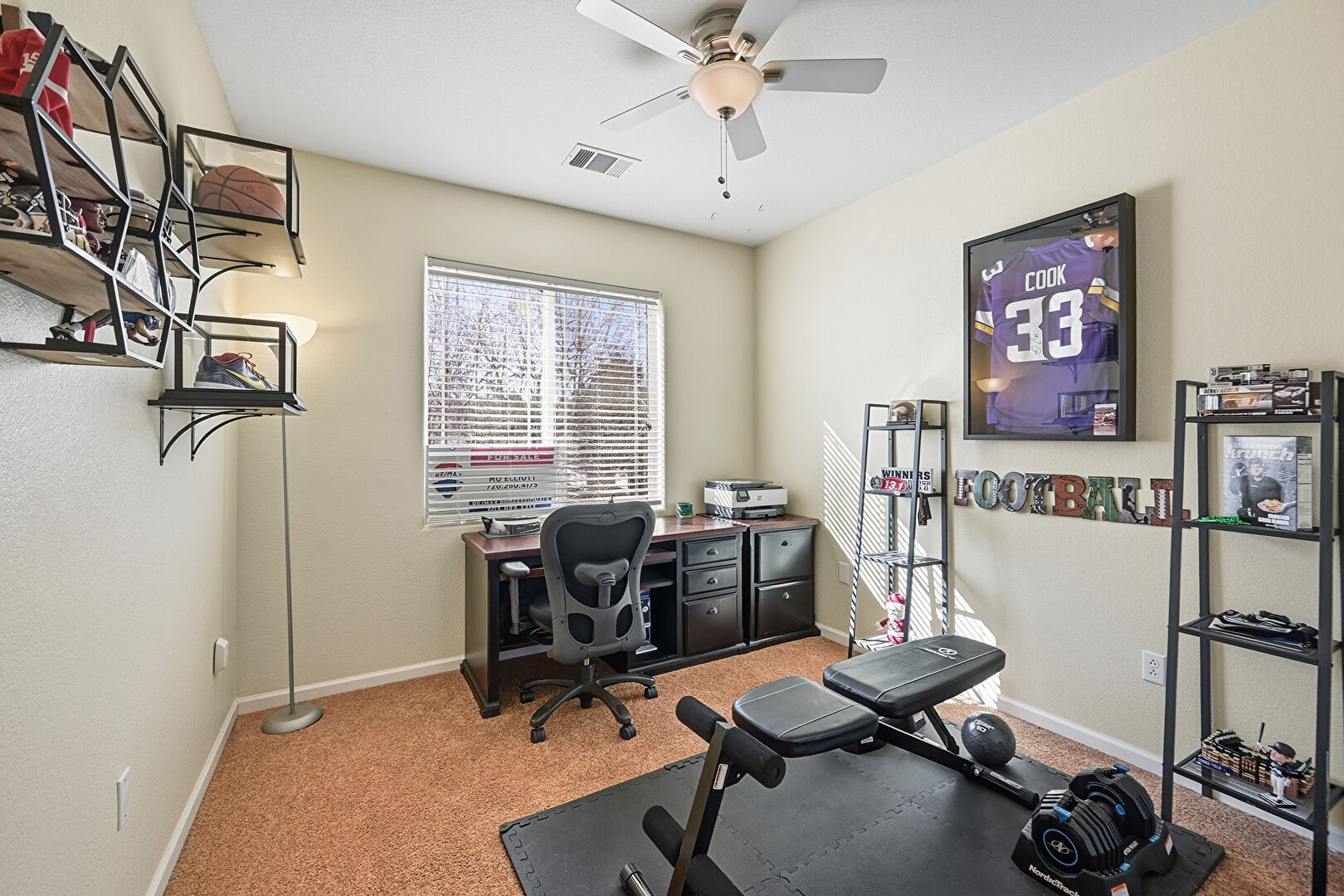 Baseboards Wall, Ceiling Fan, Drywall, Natural Light, Office Area, Vent, Carpet