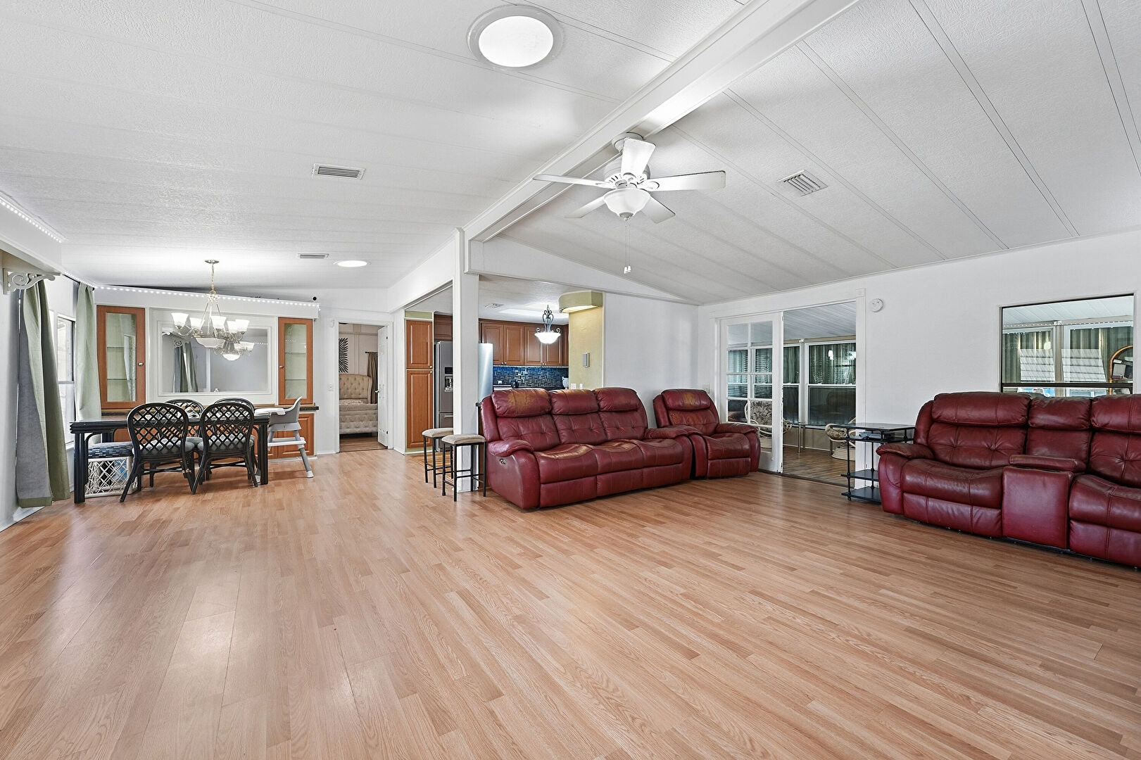 Baseboards Wall, Beamed Ceiling, Cathedral Ceiling, Ceiling Fan, Drywall, Natural Light, Notable Chandelier, Vaulted Ceiling, Vent, Wood Finish Floor, Drywall, Natural Light, Vaulted Ceiling