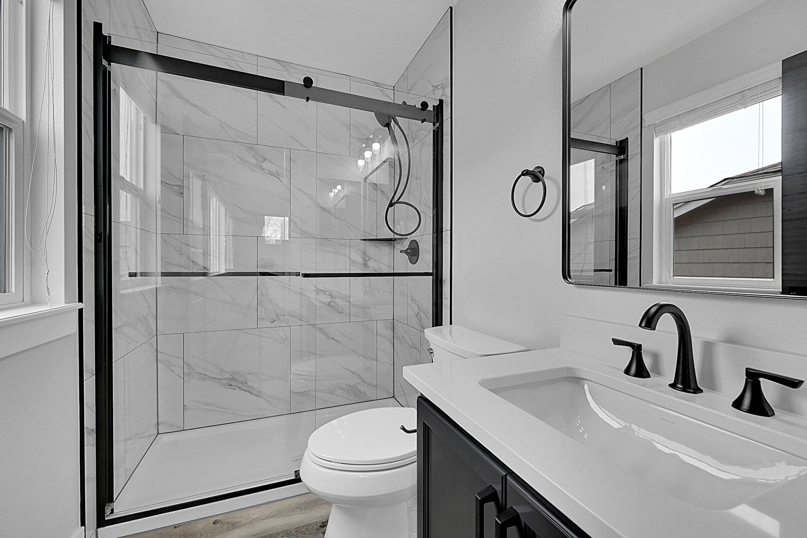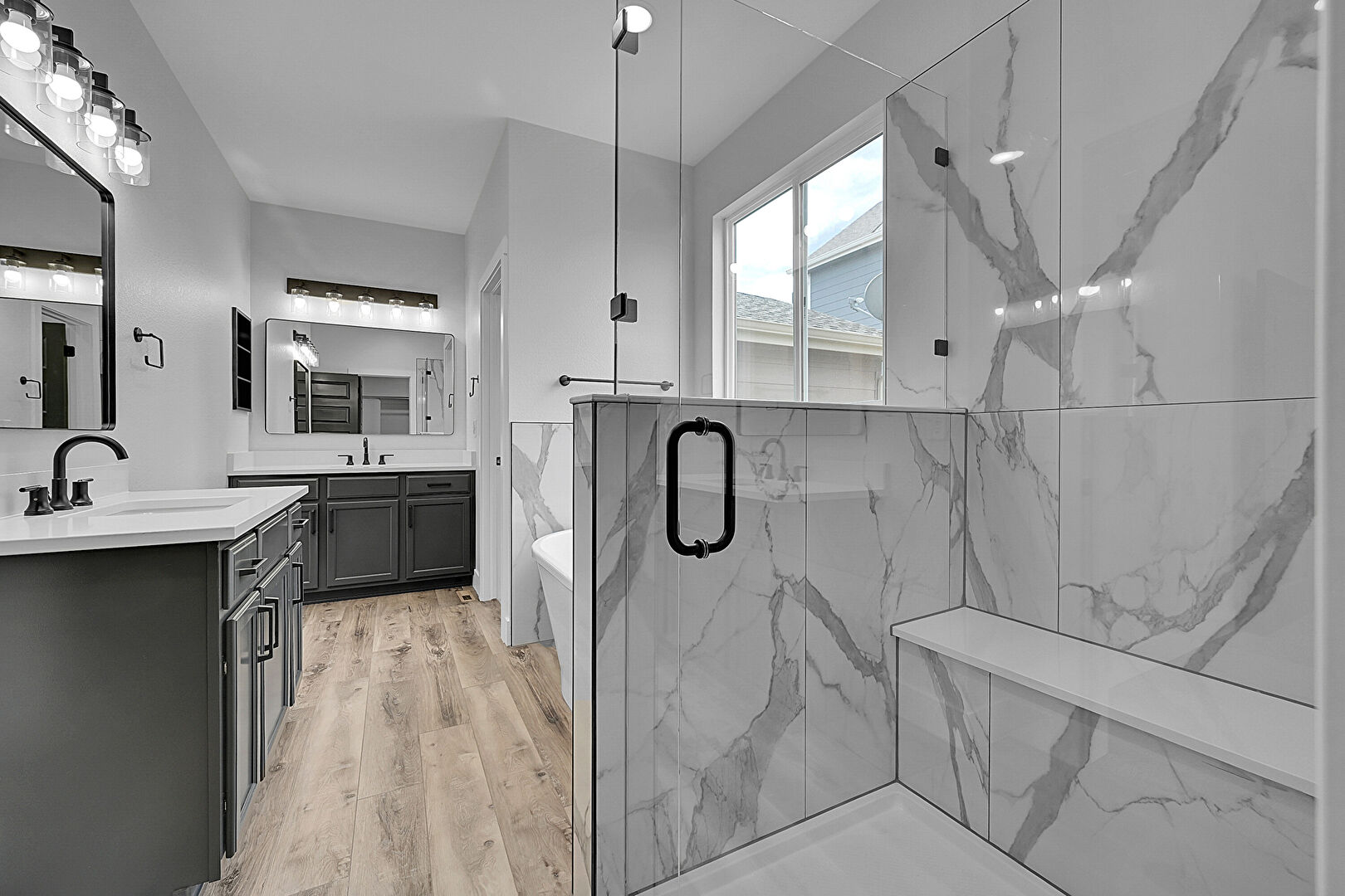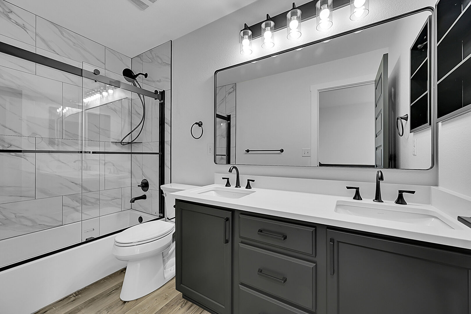 Baseboards Wall, Combined Bath Shower, Drywall, Full Bathroom, Natural Light, Vanity, Vent, Wood Finish Floor, Double Vanity, Full Bathroom, Half Bathroom