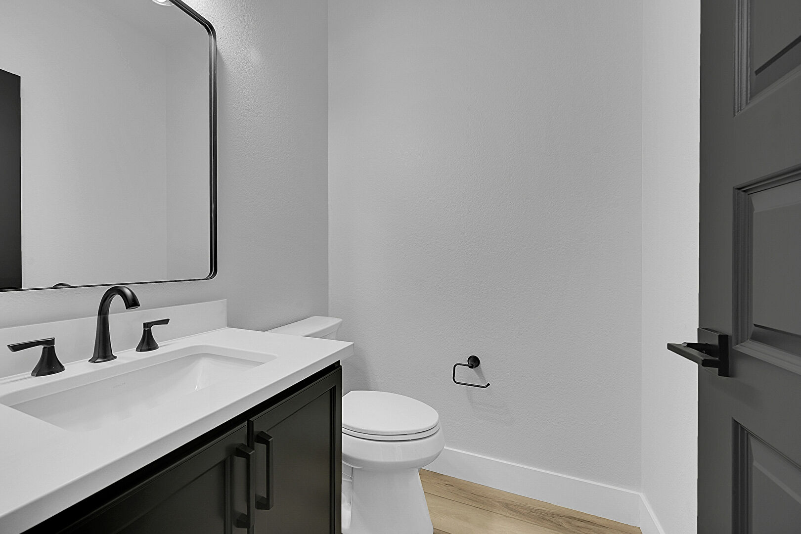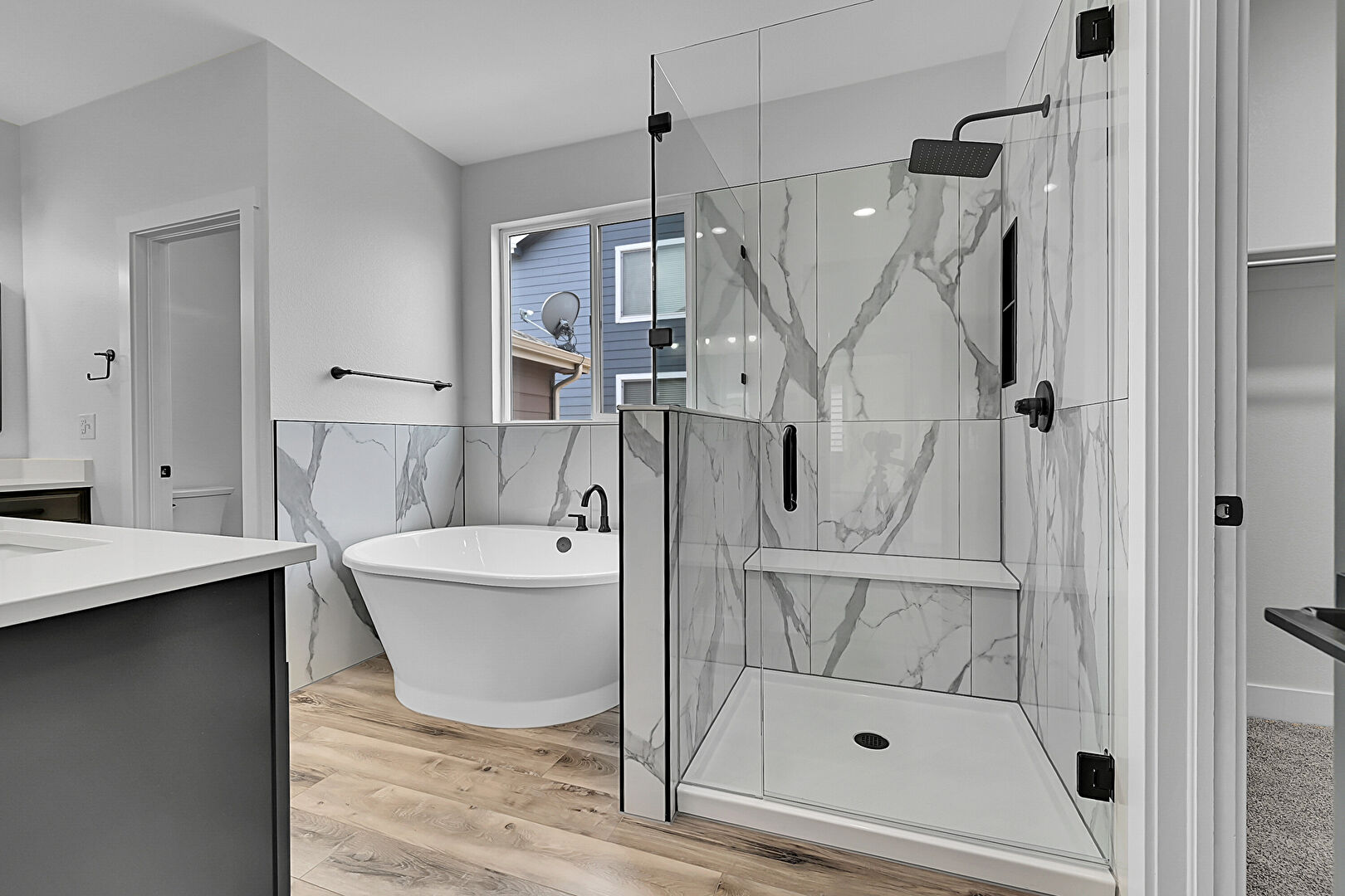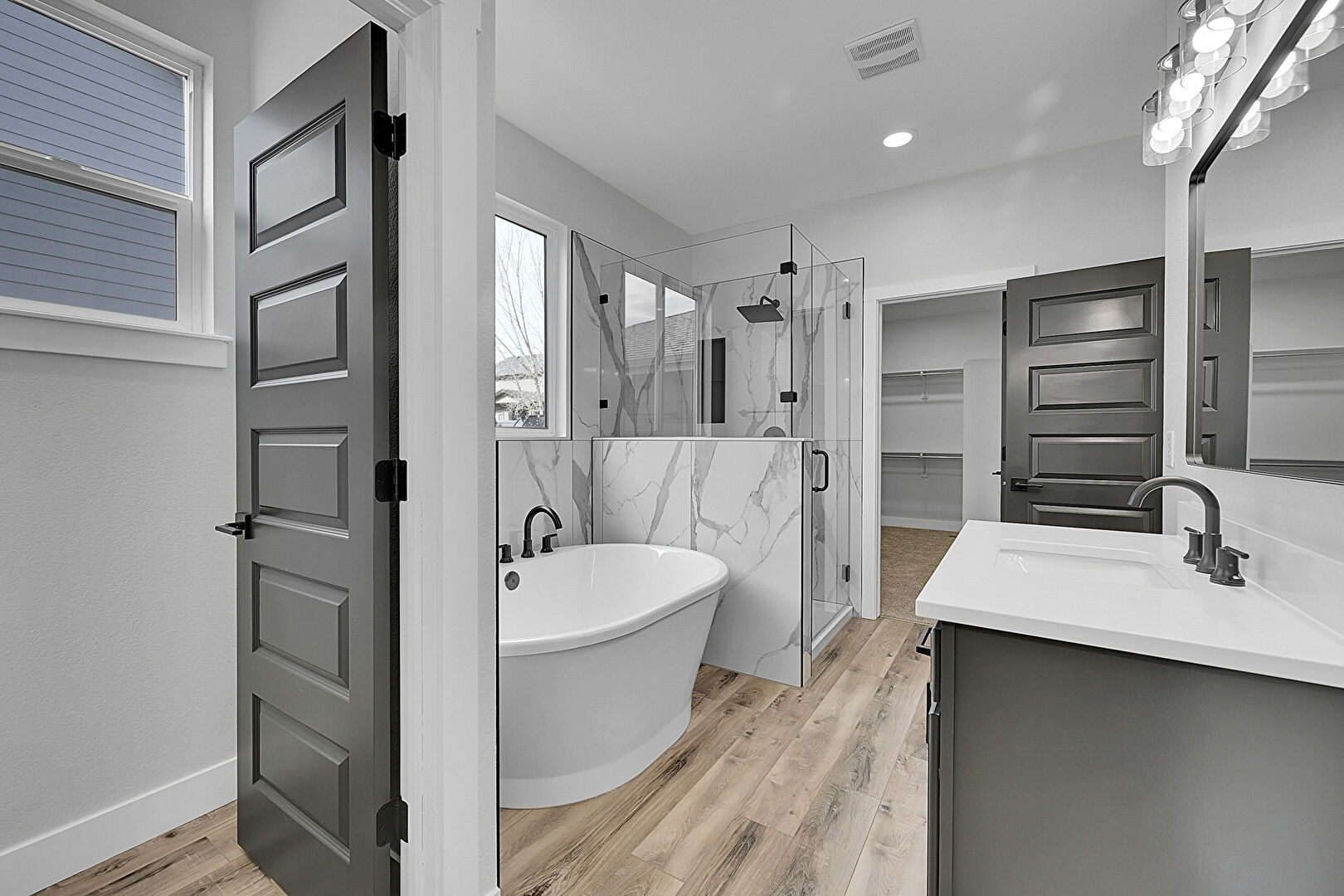 Baseboards Wall, Combined Bath Shower, Drywall, Full Bathroom, Natural Light, Vanity, Vent, Wood Finish Floor, Double Vanity, Full Bathroom, Half Bathroom