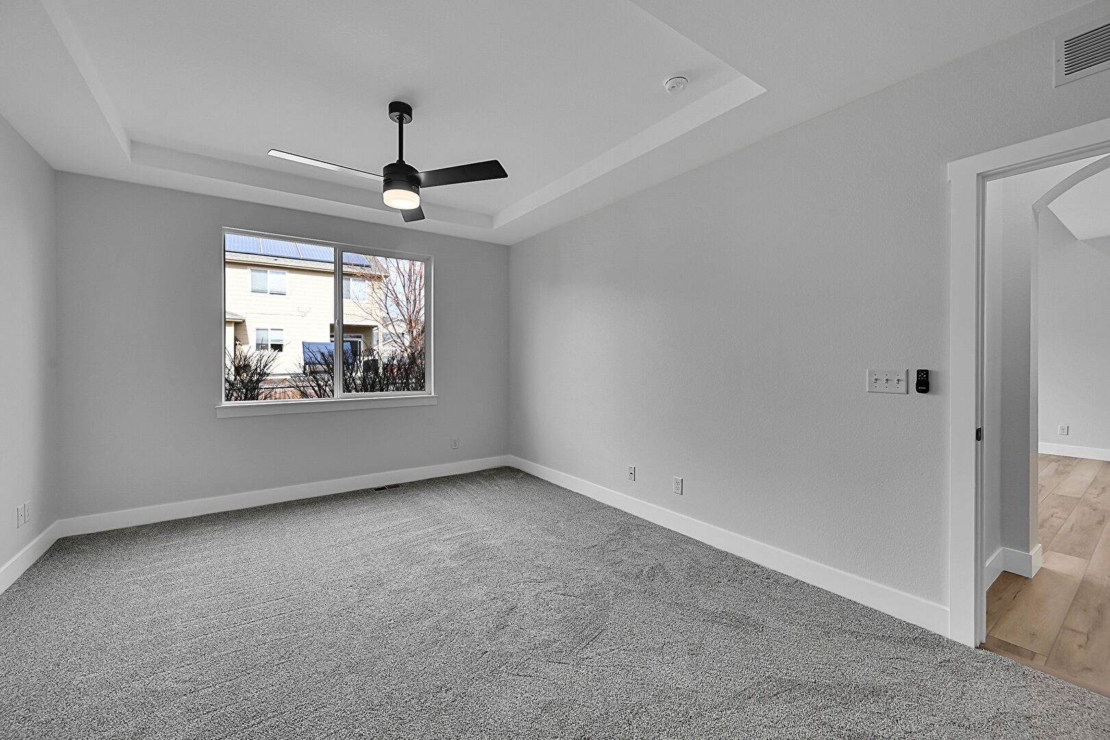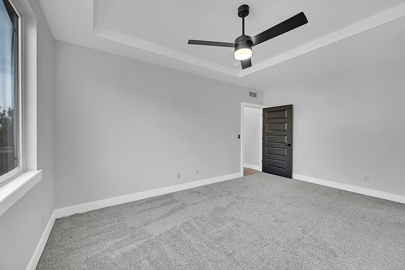Arched Walkways, Baseboards Wall, Carpet, Ceiling Fan, Drywall, Natural Light, Tray Ceiling, Vent, Drywall, Natural Light, Tray Ceiling