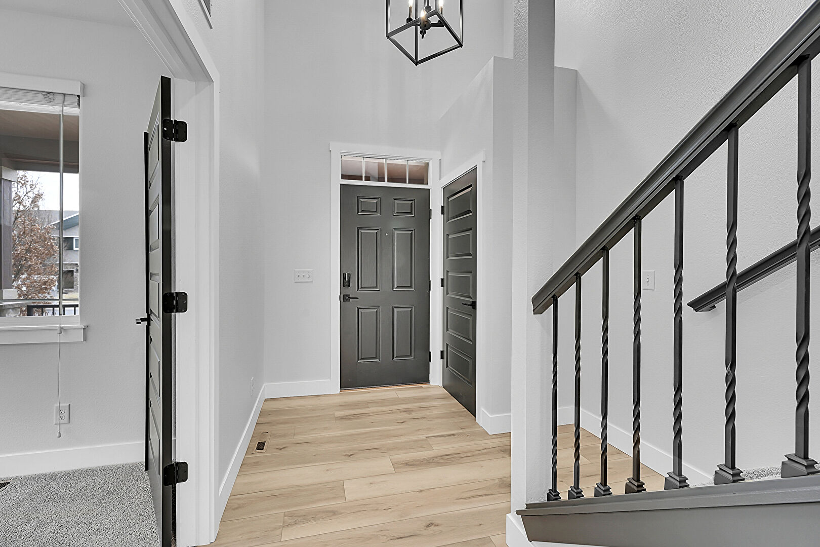 Baseboards Wall, Drywall, High Ceiling, Natural Light, Notable Chandelier, Stairs, Wood Finish Floor, Baseboards Wall, Recessed Lighting