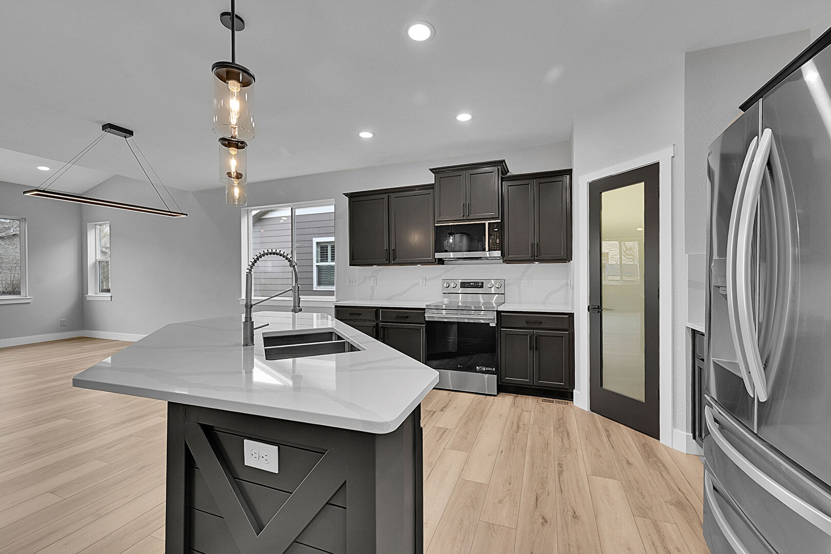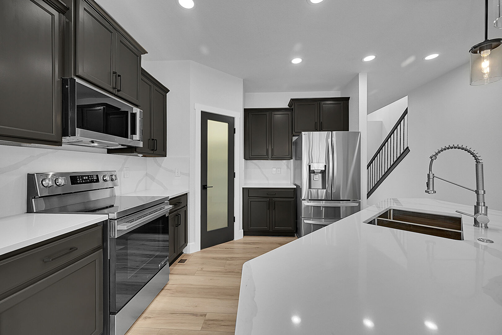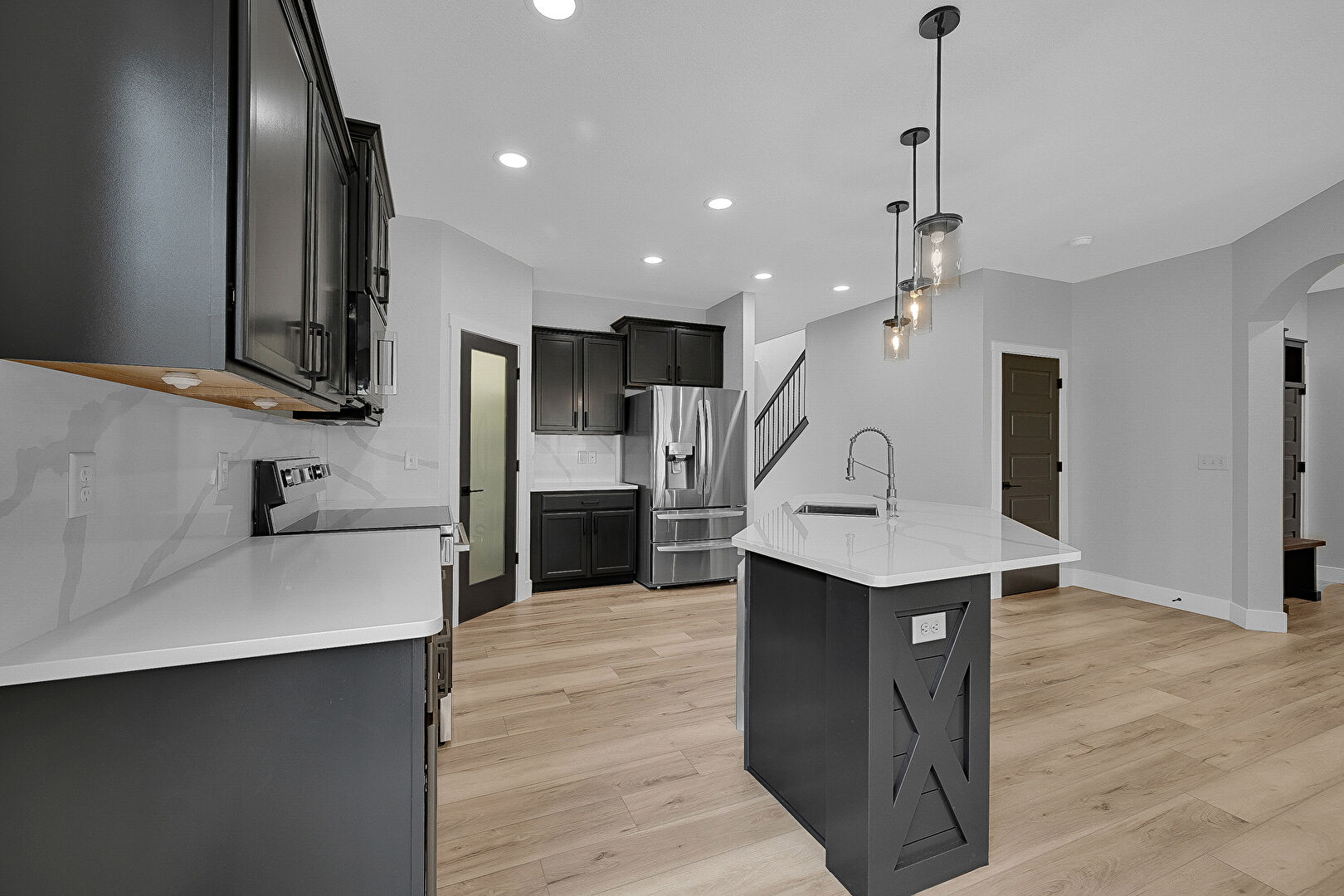 Arched Walkways, Baseboards Wall, Black Cabinets, Crown Molding Cabinets, Drywall, Gray Cabinets, Kitchen Bar, Kitchen Island, L Shaped Kitchen, Natural Light, Opens To Living Area, Pendant Lighting, Recessed Lighting, Shaker Cabinets, Smoke Carbon Monoxide Detector, Stone Countertops, Vent, Wood Finish Floor, Crown Molding Cabinets, Dark Brown Cabinets, Recessed Lighting, Wood Finish Floor