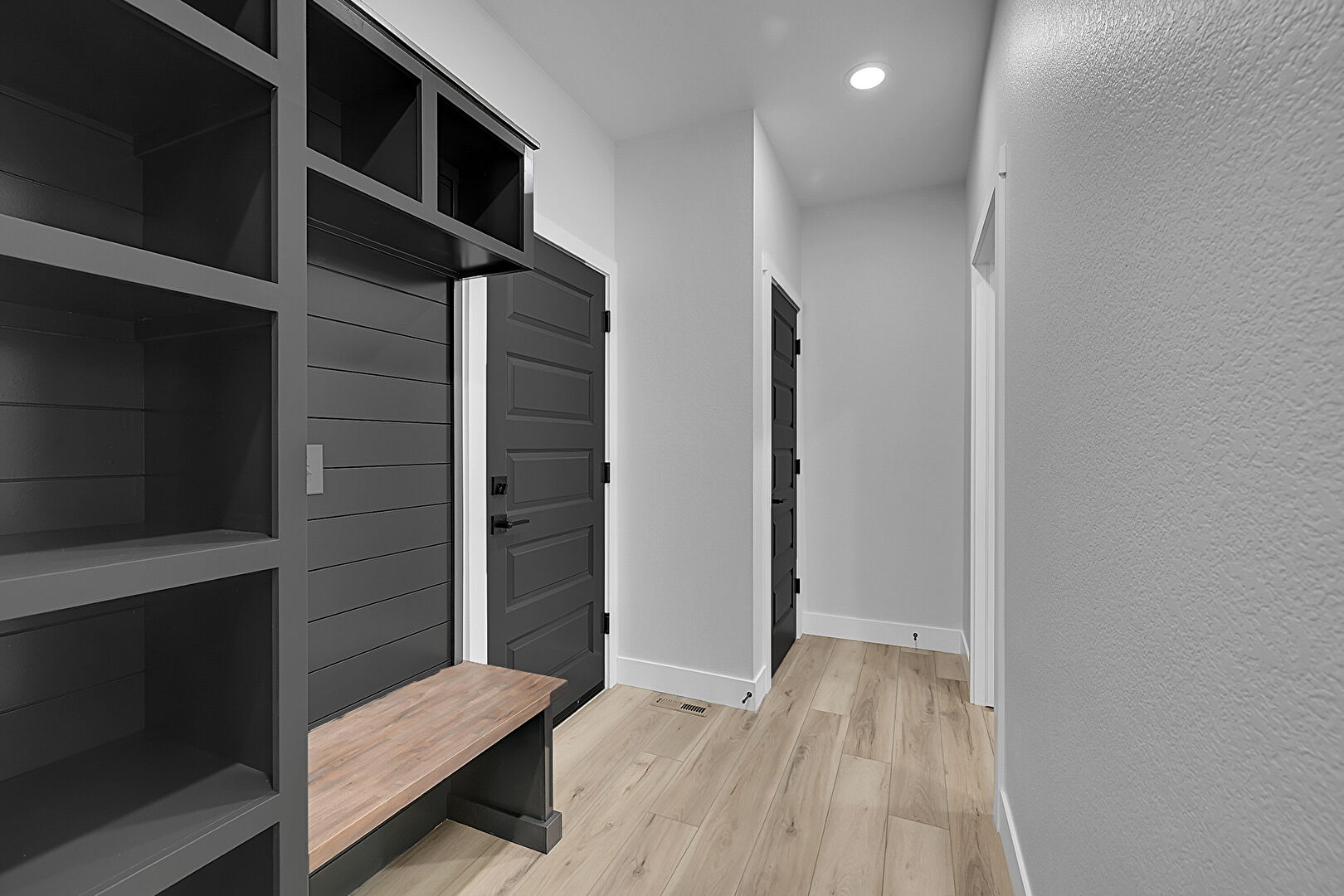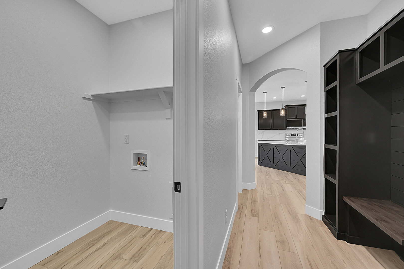 Arched Walkways, Baseboards Wall, Laundry, Recessed Lighting, Stairs, Textured Wall, Vent, Washer Hookup, Wood Finish Floor, Baseboards Wall, Drywall, Wood Finish Floor