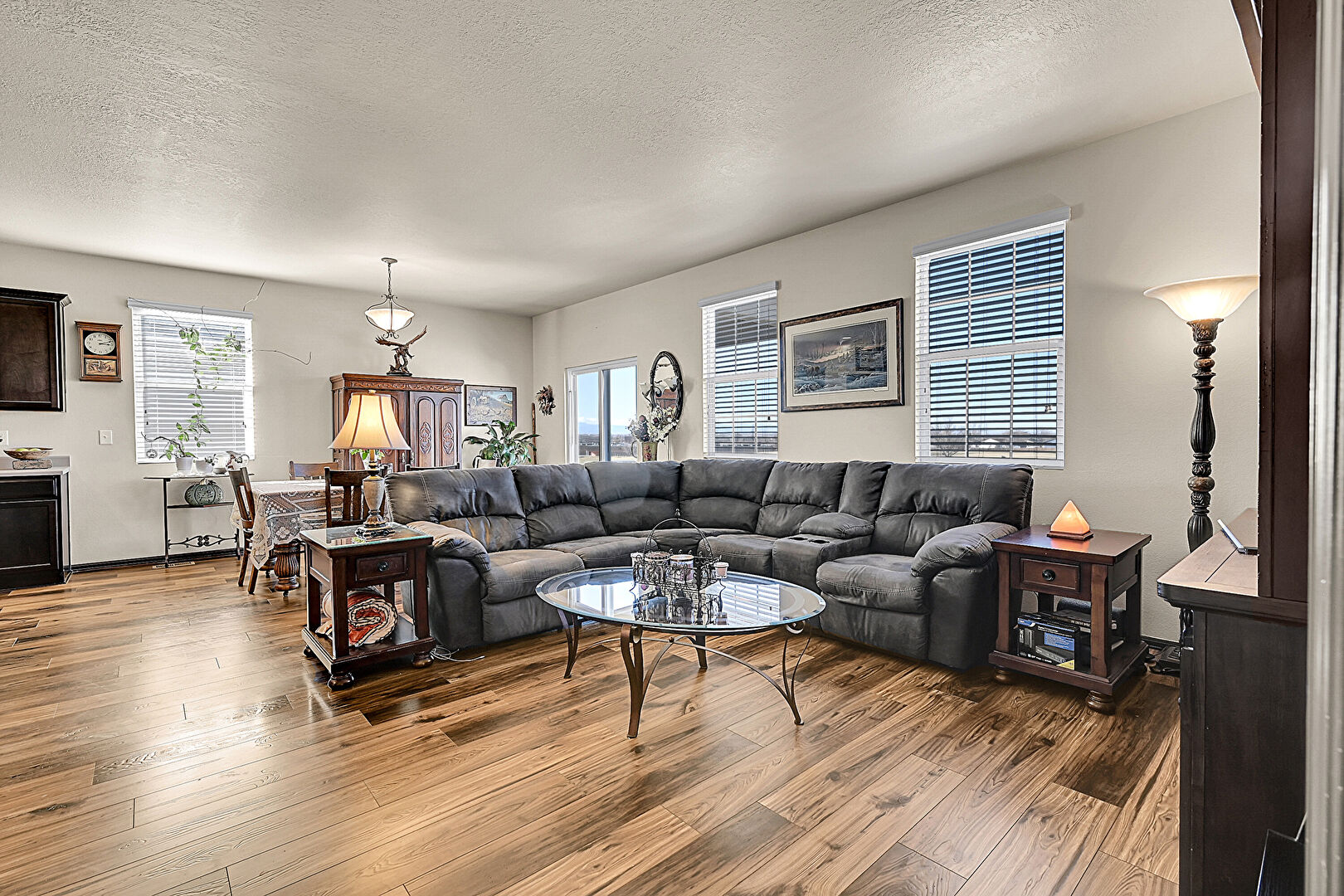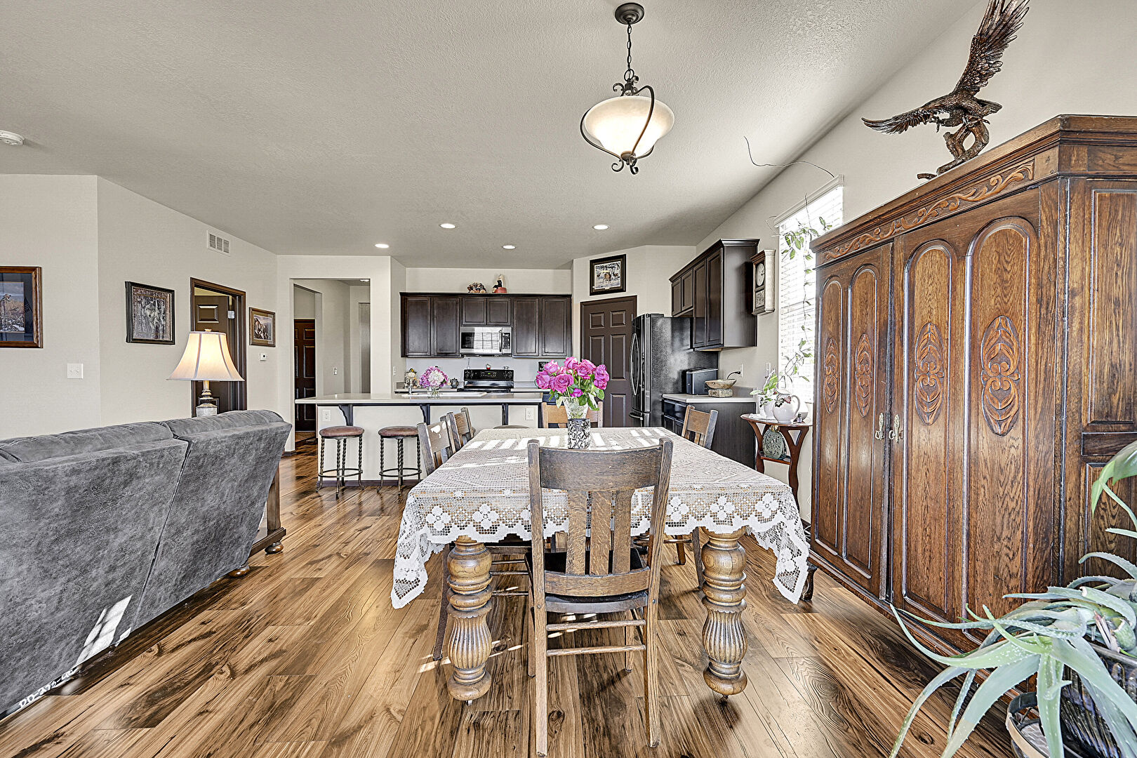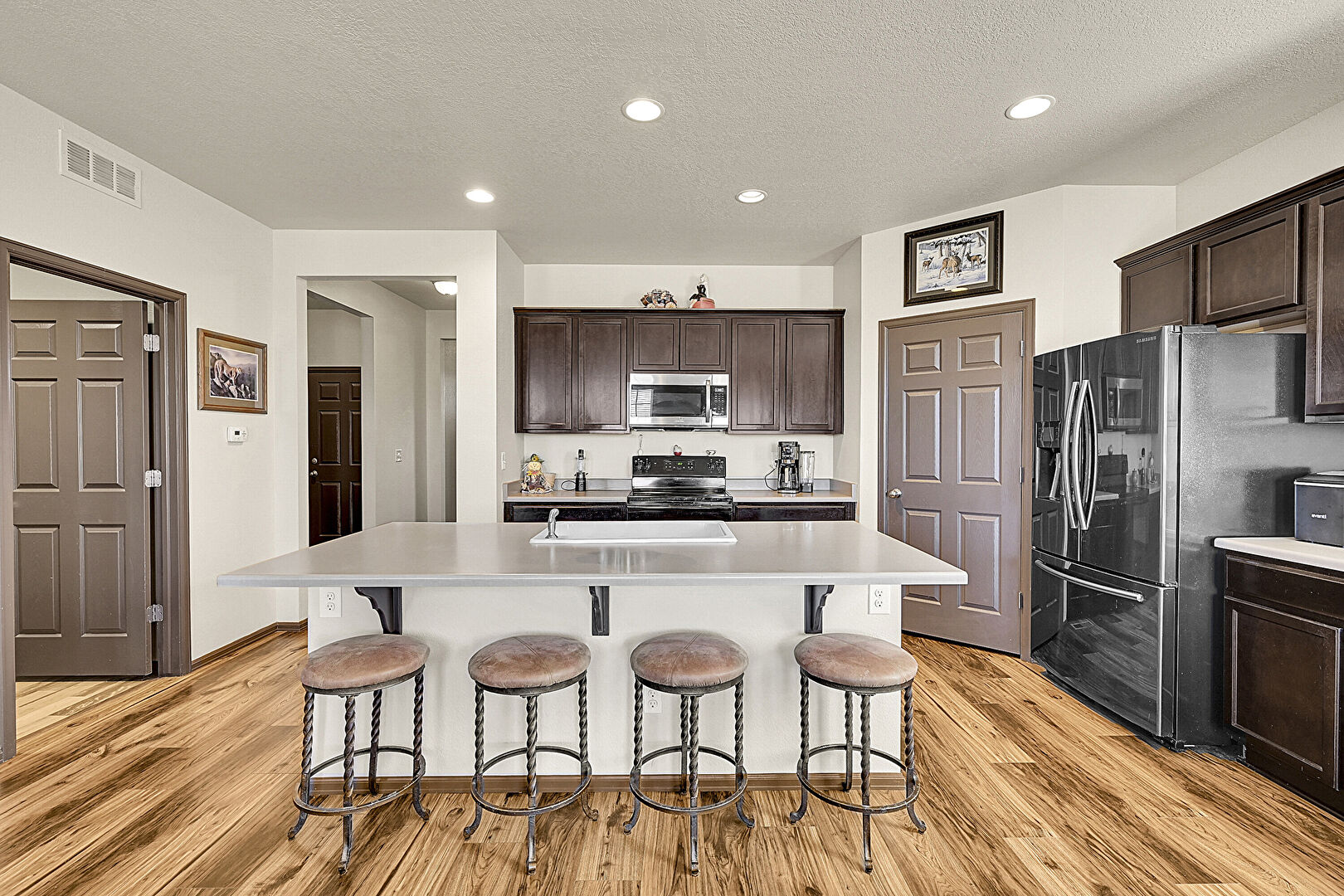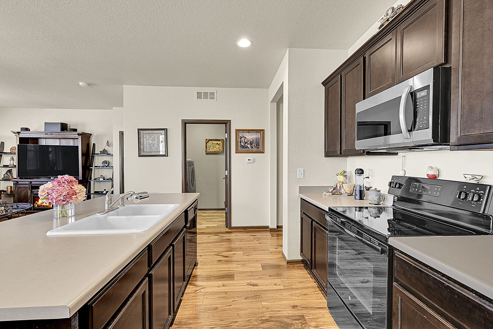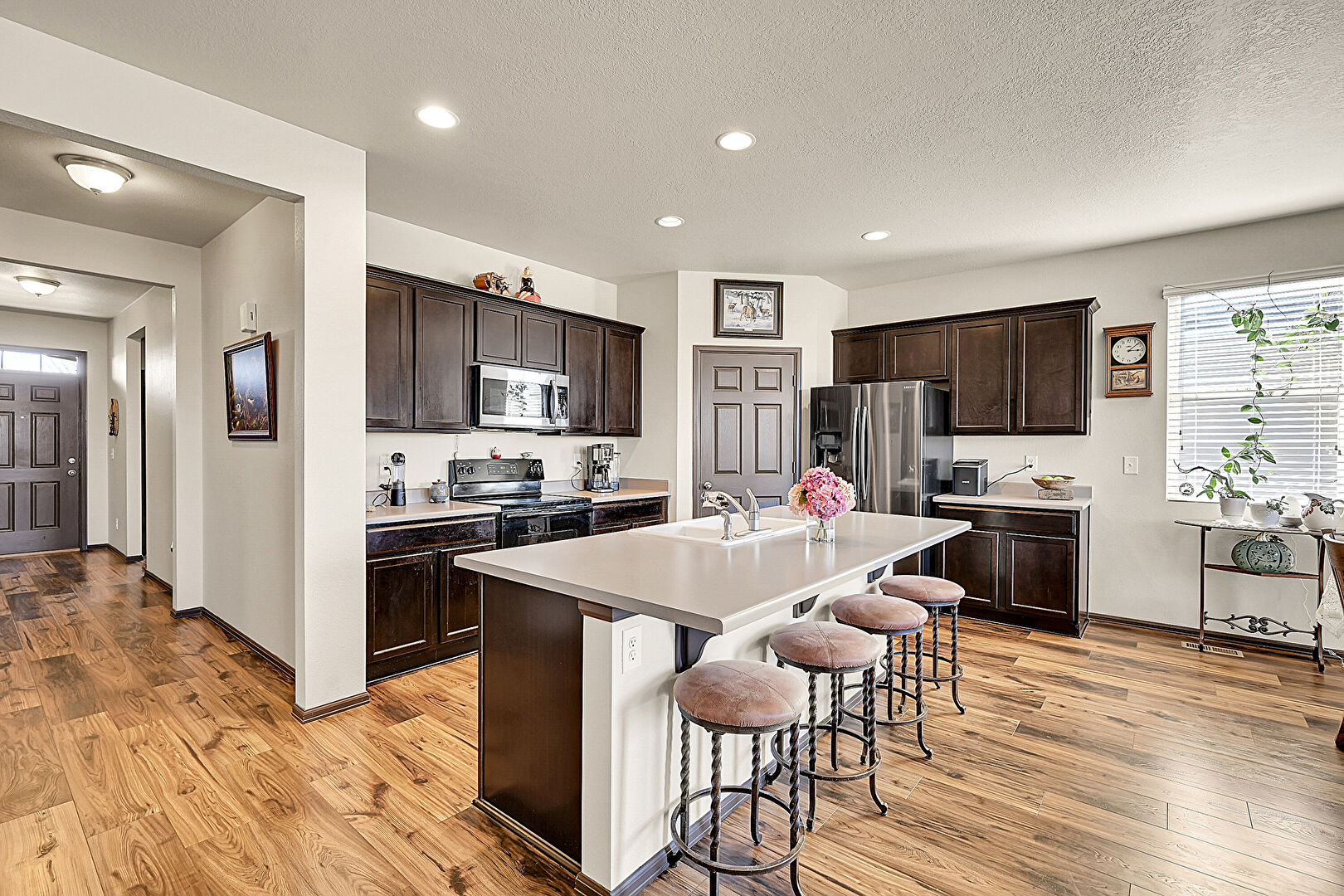 Baseboards Wall, Crown Molding Cabinets, Dark Brown Cabinets, Drywall, Kitchen Bar, Kitchen Island, L Shaped Kitchen, Laundry, Natural Light, Opens To Living Area, Pendant Lighting, Recessed Lighting, Shaker Cabinets, Textured Ceiling, Vent, Washer Dryer, Wood Finish Floor, Crown Molding Cabinets, Dark Brown Cabinets, Opens To Living Area, Shaker Cabinets, Textured Ceiling