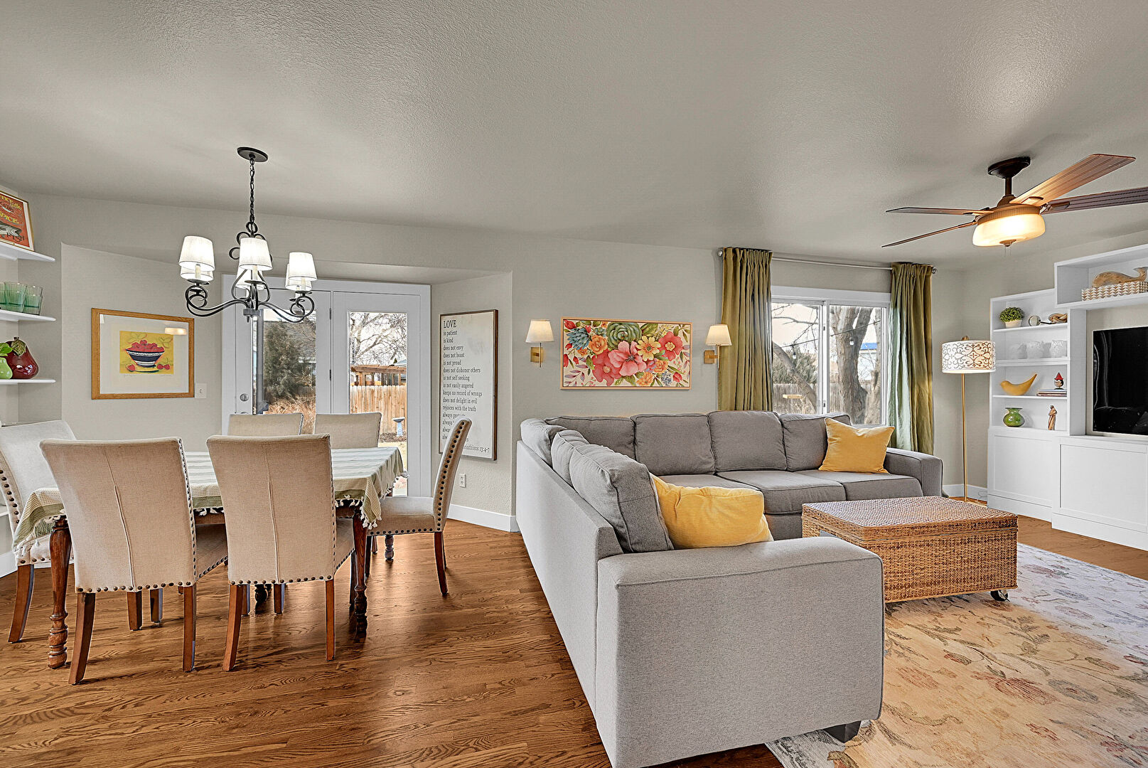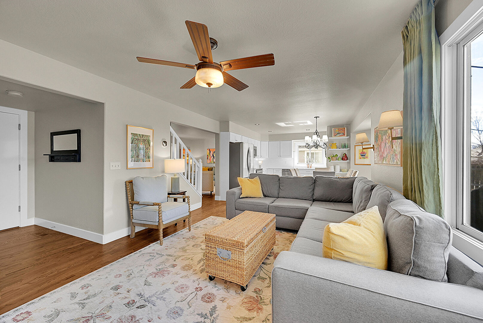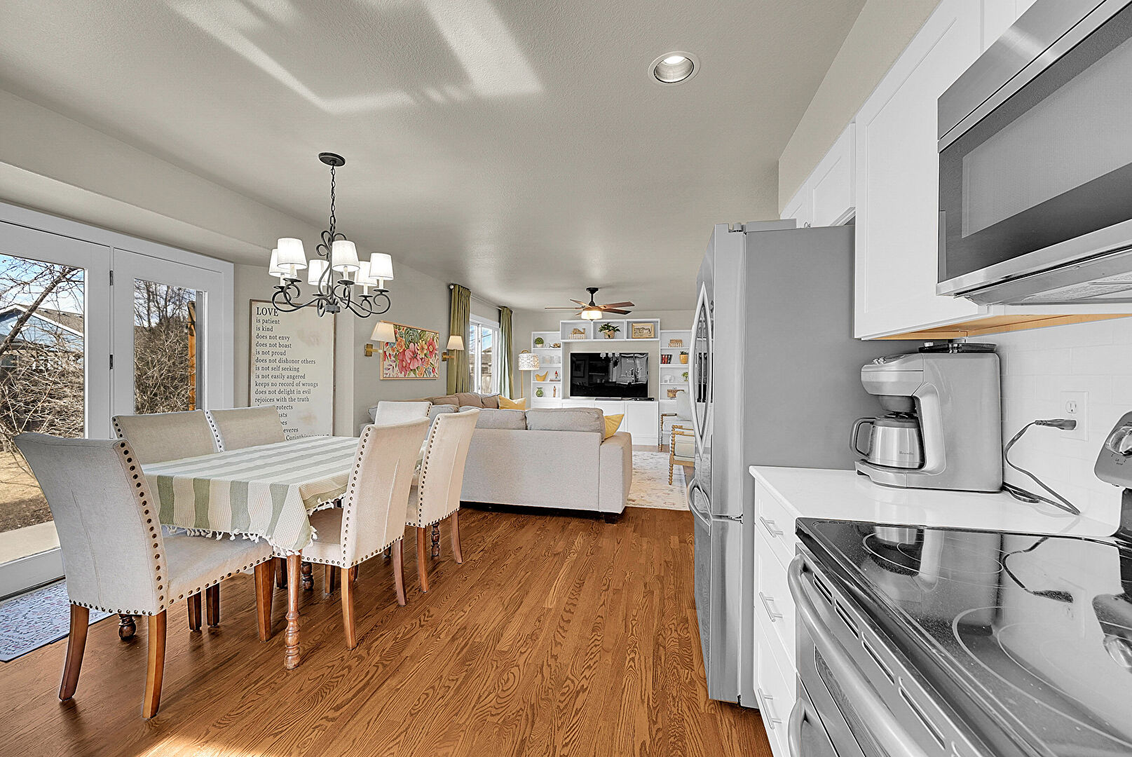 Baseboards Wall, Built In Shelves, Ceiling Fan, Drywall, L Shaped Kitchen, Natural Light, Notable Chandelier, Recessed Lighting, Stairs, Wood Finish Floor, L Shaped Kitchen, Wood Finish Floor