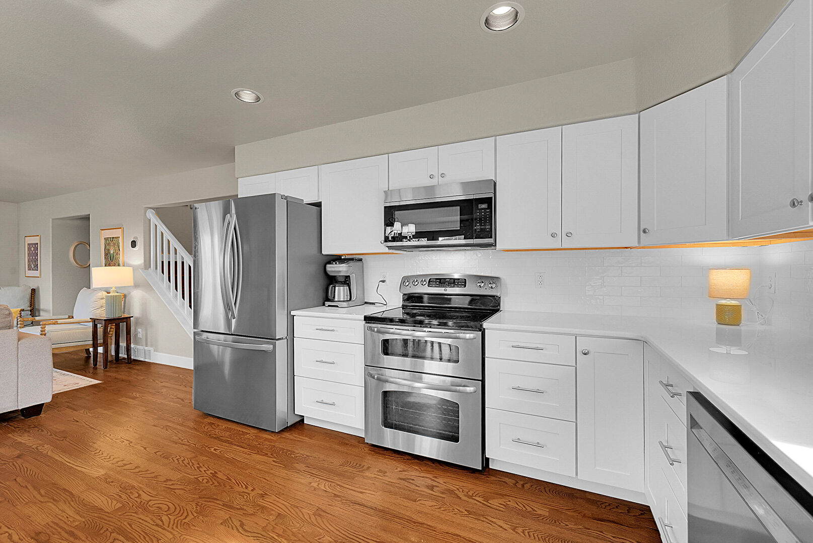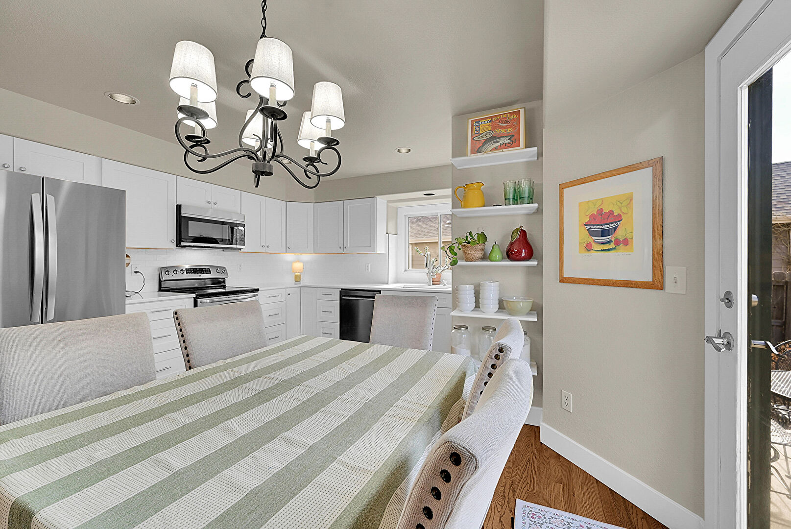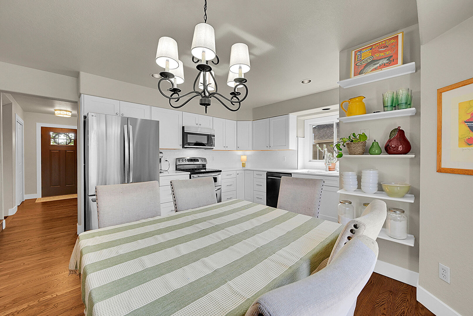 Baseboards Wall, Built In Shelves, Ceiling Fan, Drywall, L Shaped Kitchen, Natural Light, Notable Chandelier, Recessed Lighting, Stairs, Wood Finish Floor, L Shaped Kitchen, Wood Finish Floor