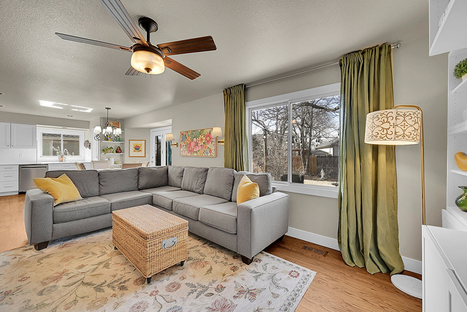 Baseboards Wall, Built In Shelves, Ceiling Fan, Drywall, Natural Light, Notable Chandelier, Stairs, Textured Ceiling, Vent, Wood Finish Floor, Drywall, L Shaped Kitchen, Natural Light