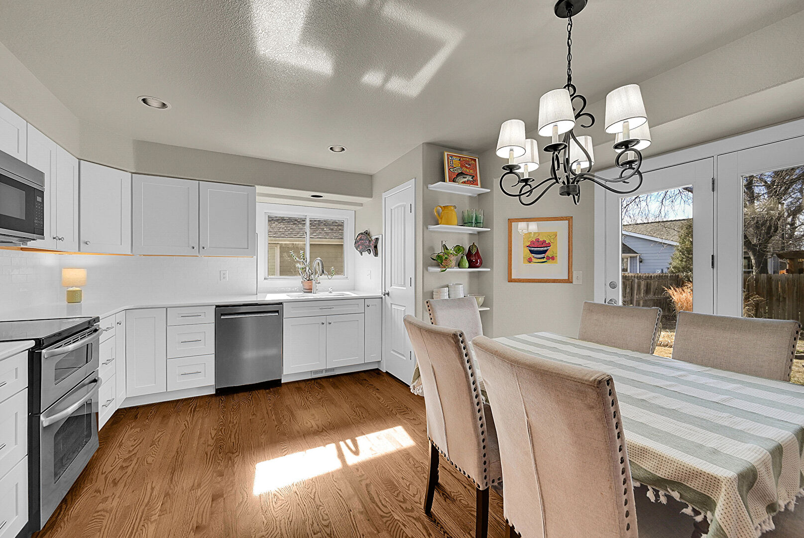 Baseboards Wall, Drywall, Natural Light, Notable Chandelier, Open Shelves, Pendant Lighting, Recessed Lighting, Shaker Cabinets, Stone Countertops, Wood Finish Floor, Ceiling Fan, Stone Countertops, Textured Ceiling, Wood Finish Floor