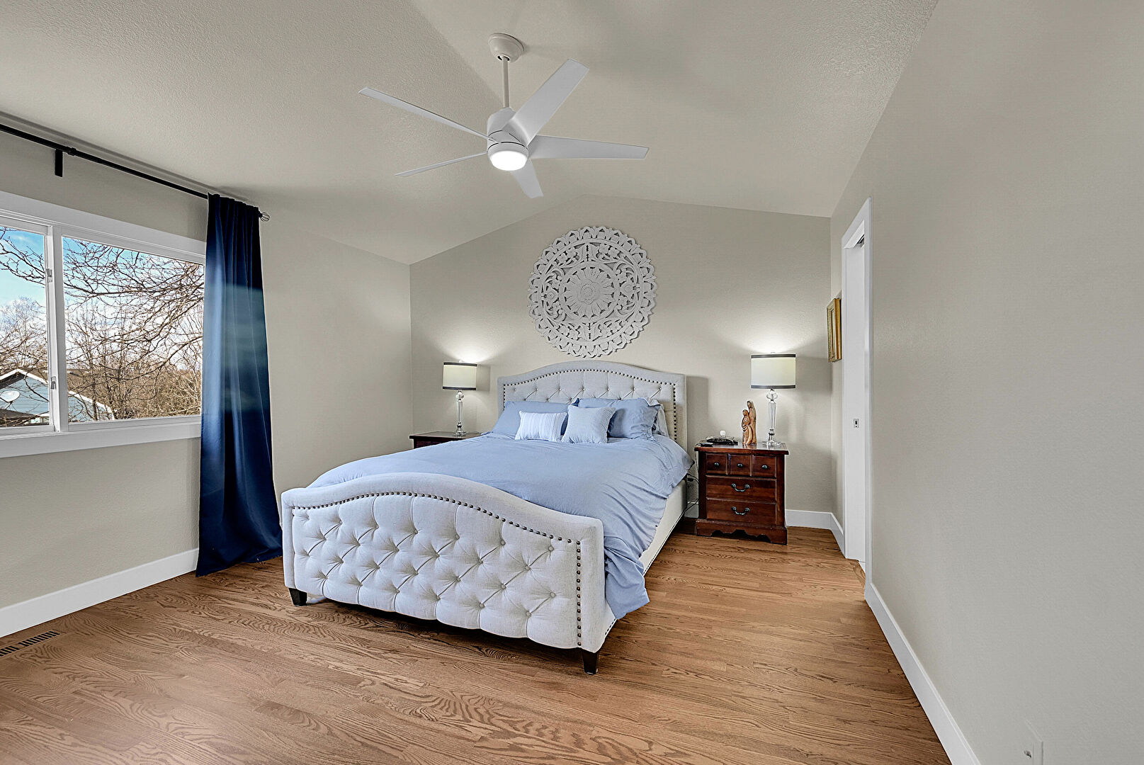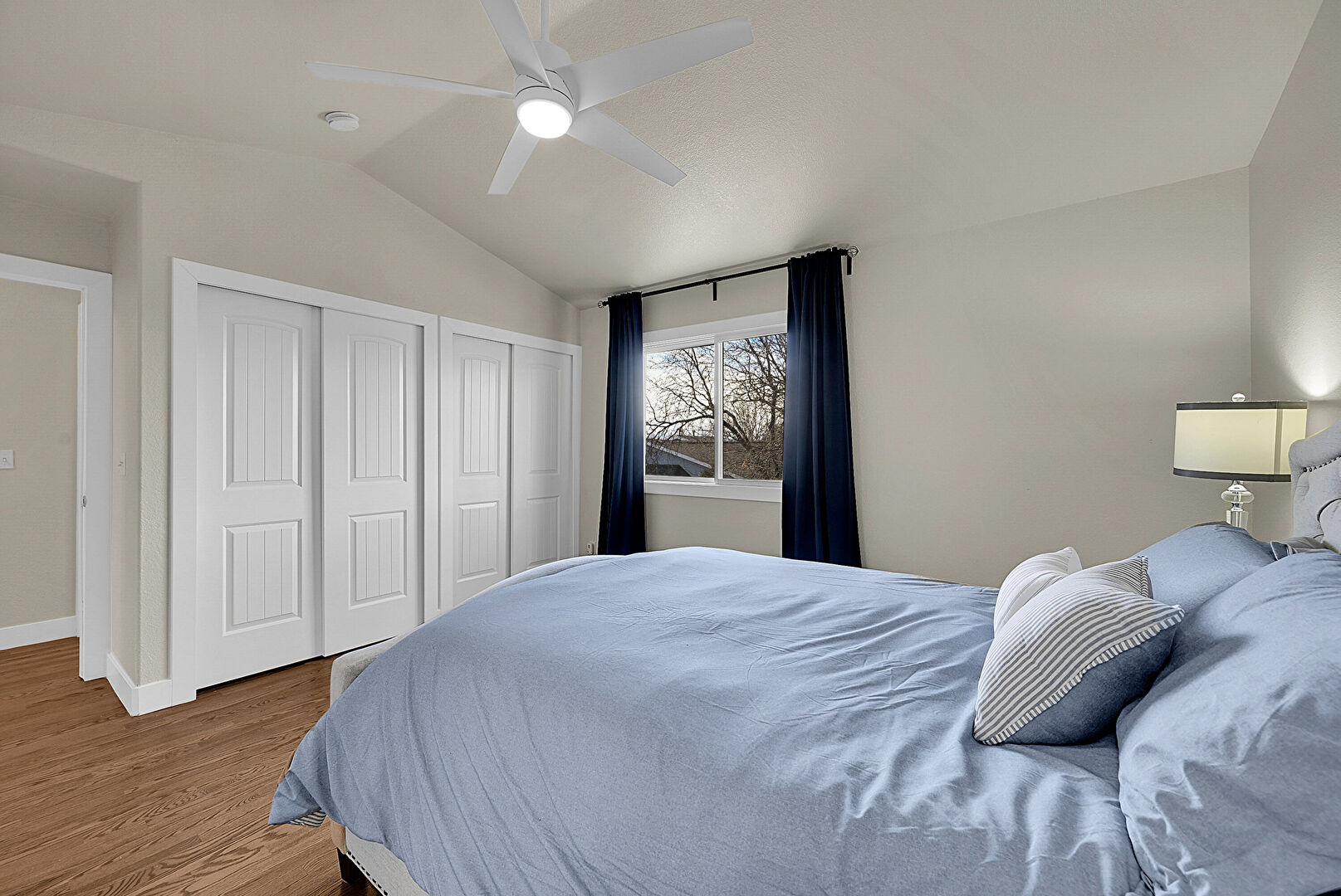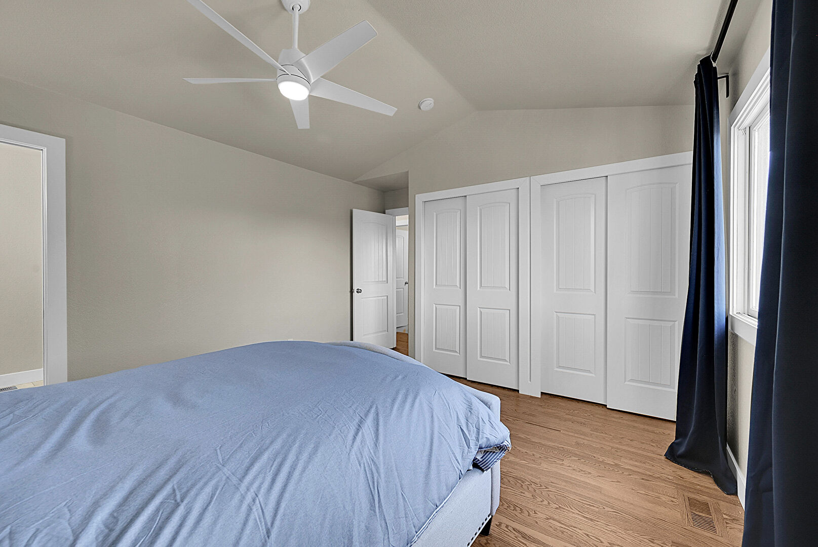 Baseboards Wall, Cathedral Ceiling, Ceiling Fan, Drywall, Ensuite Bathroom, Natural Light, Two Closets, Vaulted Ceiling, Vent, Wood Finish Floor, Baseboards Wall, Cathedral Ceiling, Wood Finish Floor
