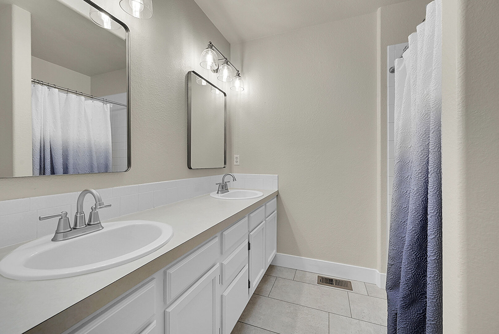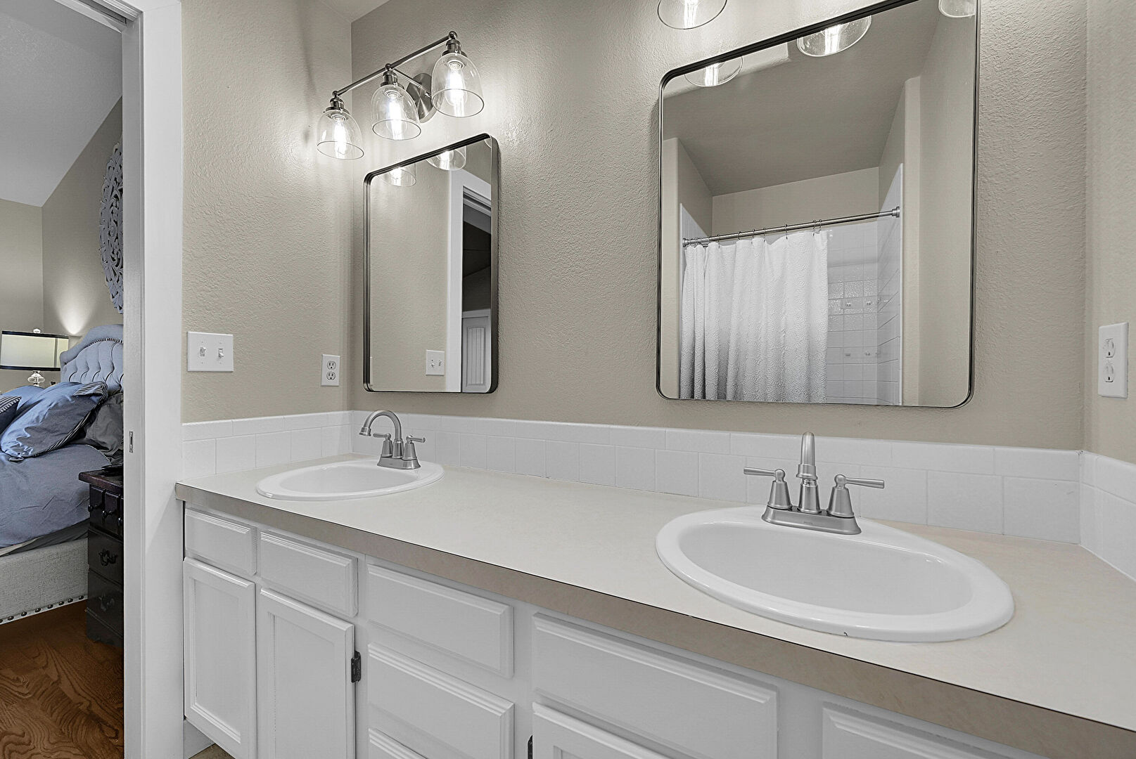 Baseboards Wall, Double Vanity, Ensuite Bathroom, Full Bathroom, Textured Wall, Tile Floor, Vent, Double Vanity, Wood Finish Floor