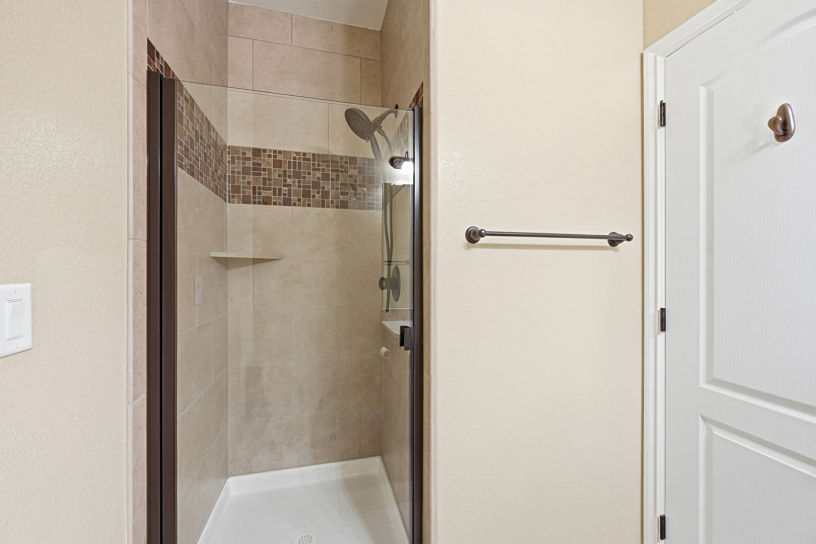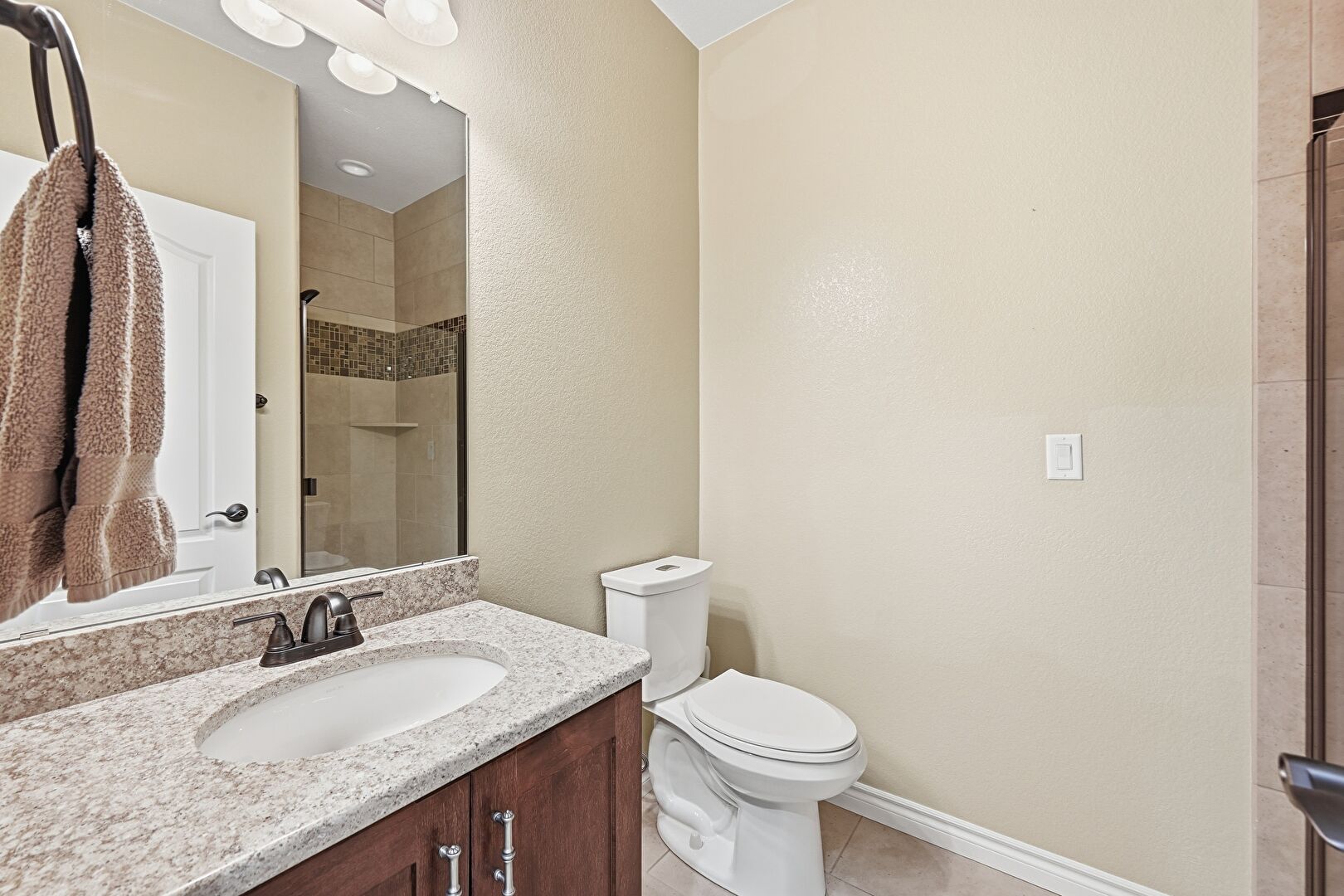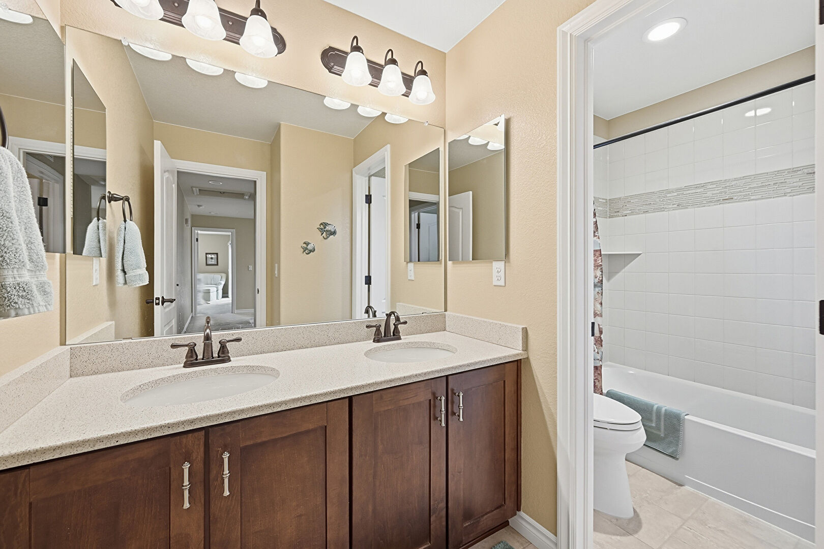 Baseboards Wall, Combined Bath Shower, Double Vanity, Drywall, Ensuite Bathroom, Full Bathroom, Recessed Lighting, Textured Wall, Tile Floor, Vanity, Vent, Baseboards Wall, Full Bathroom, Textured Wall