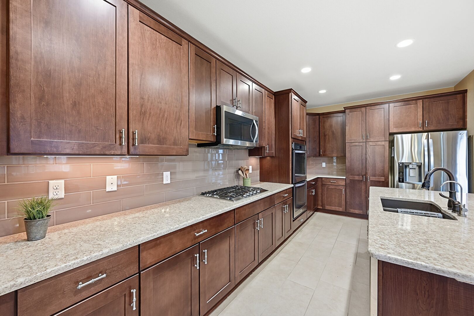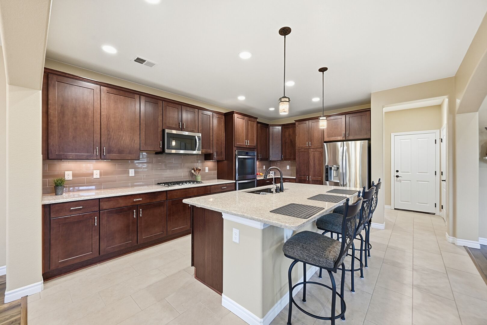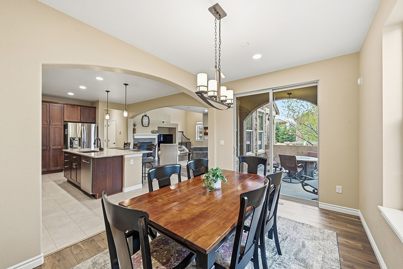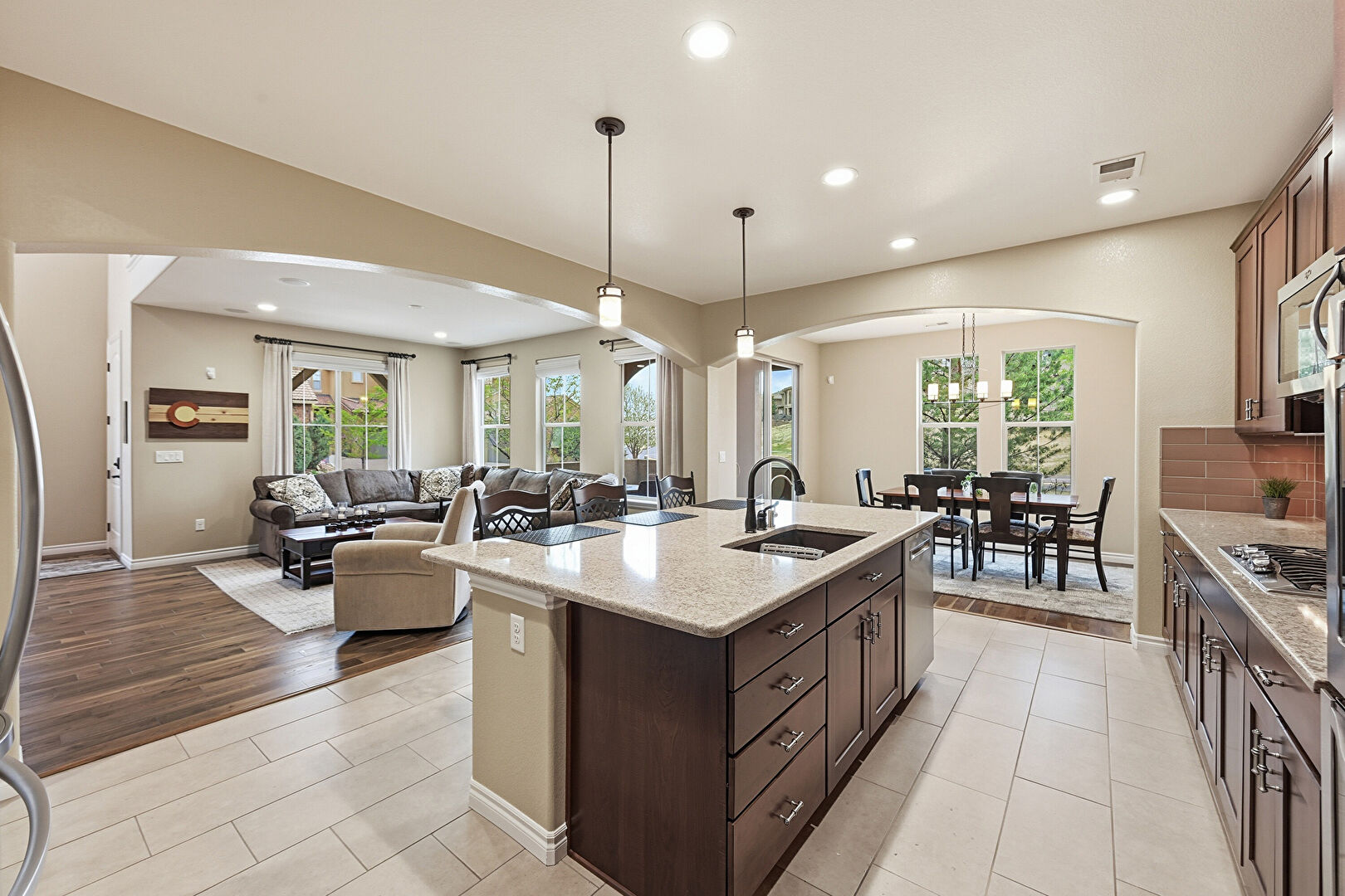 Arched Walkways, Baseboards Wall, Crown Molding Cabinets, Dark Brown Cabinets, Double Oven, Drywall, Kitchen Bar, Kitchen Island, L Shaped Kitchen, Natural Light, Notable Chandelier, Opens To Living Area, Pendant Lighting, Recessed Lighting, Shaker Cabinets, Stone Countertops, Tile Floor, Vent, Arched Walkways, Pendant Lighting, Tile Floor