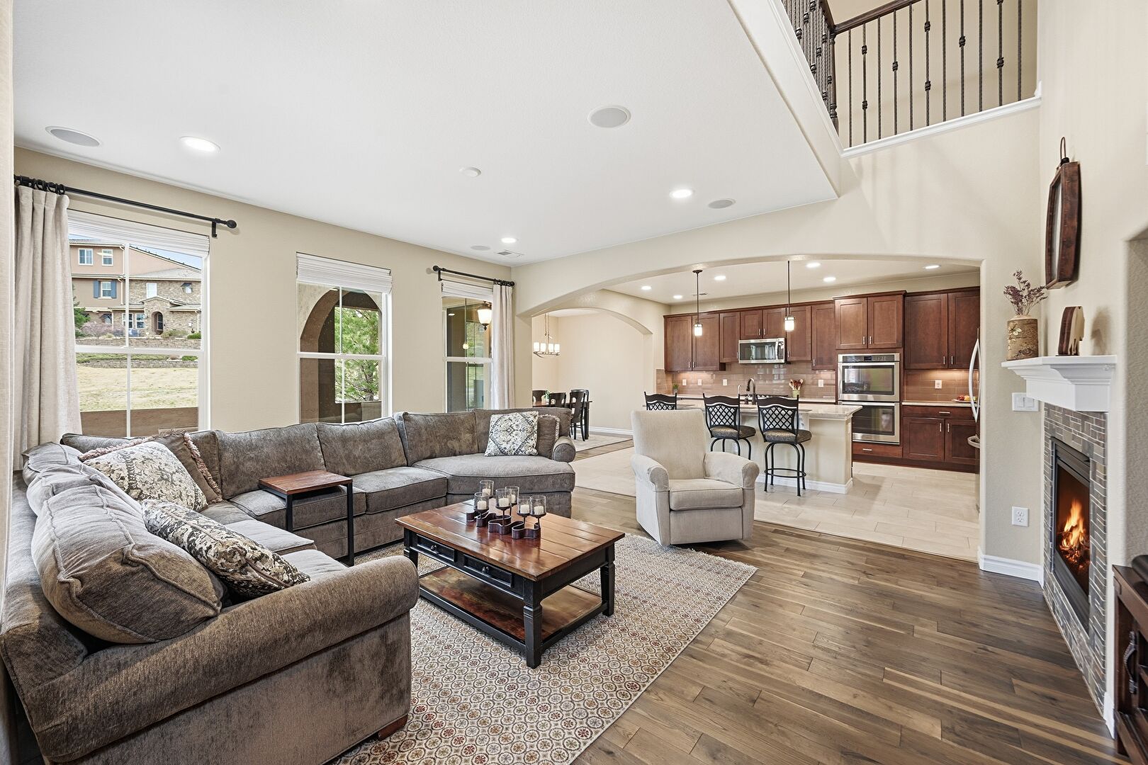 Baseboards Wall, Double Oven, Drywall, Fireplace, Natural Light, Recessed Lighting, Stairs, Vent, Wood Finish Floor, Arched Walkways, Baseboards Wall, High Ceiling