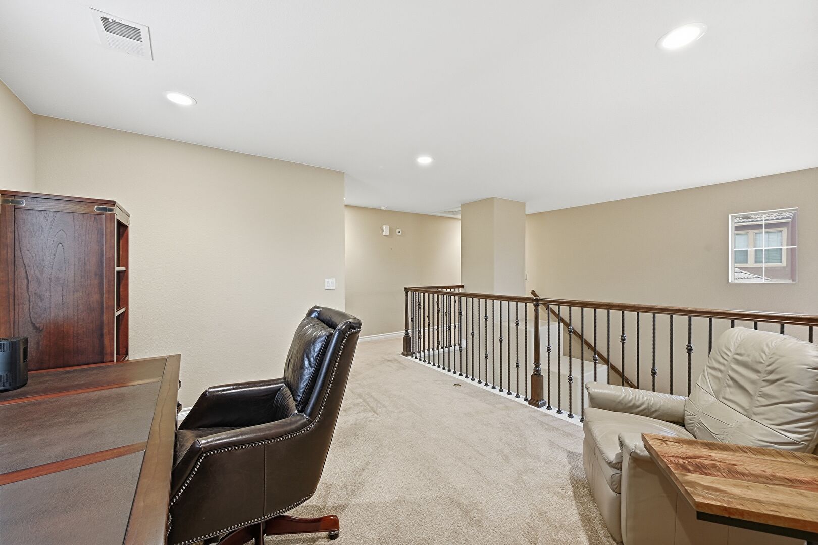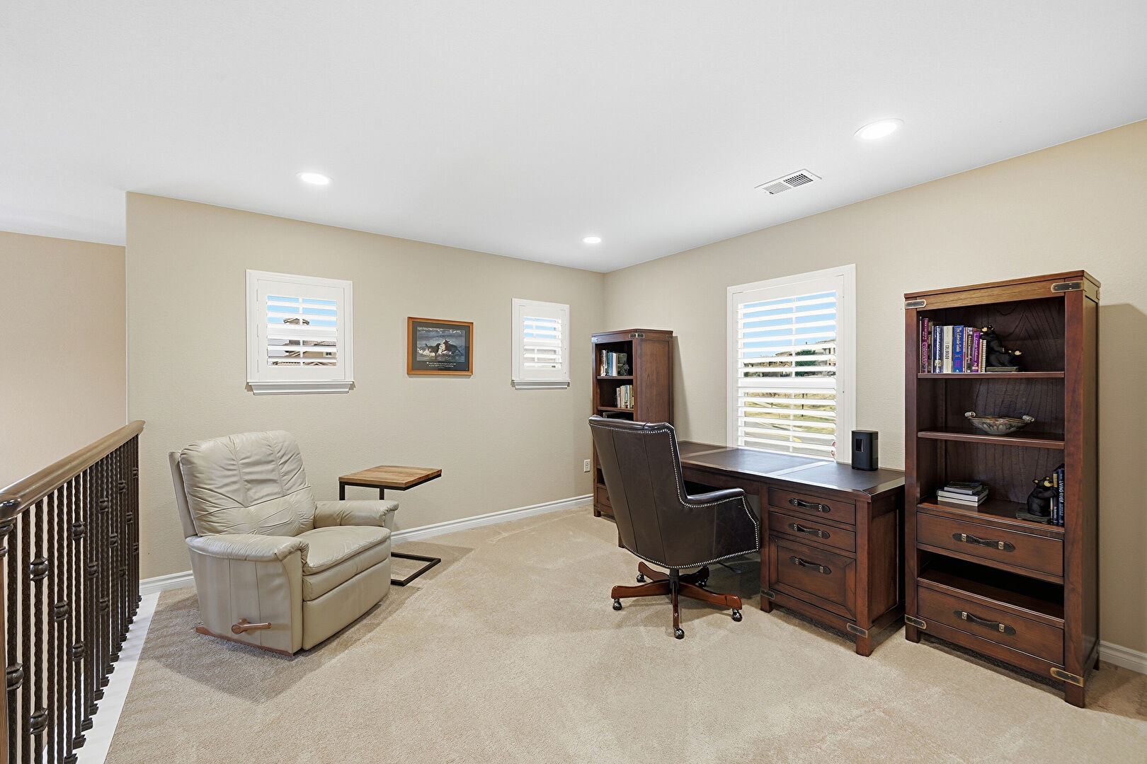 Baseboards Wall, Carpet, Drywall, Natural Light, Office Area, Recessed Lighting, Vent, Carpet, Office Area