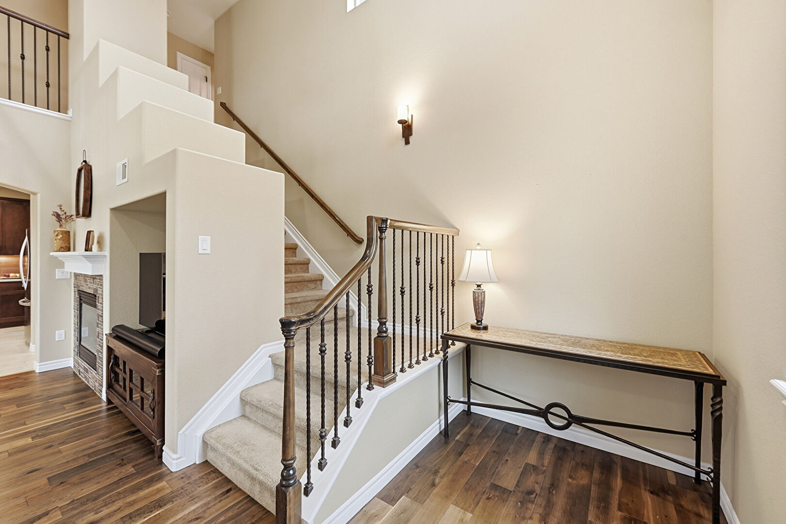 Baseboards Wall, Drywall, Fireplace, Stairs, Vent, Wood Finish Floor, High Ceiling