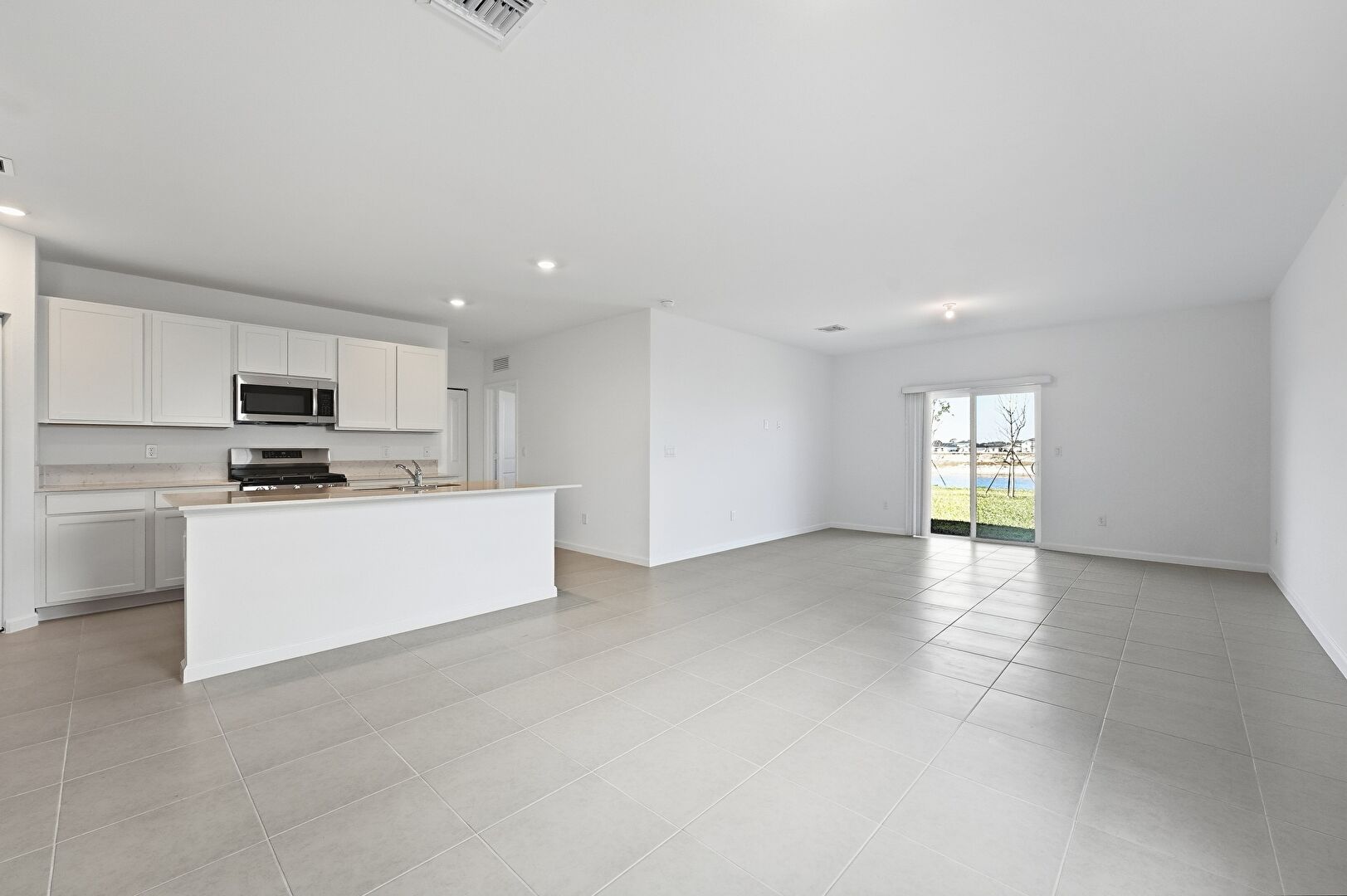 Baseboards Wall, Drywall, Kitchen Island, L Shaped Kitchen, Natural Light, Opens To Living Area, Recessed Lighting, Shaker Cabinets, Stone Countertops, Tile Floor, Vent, Drywall, Tile Floor