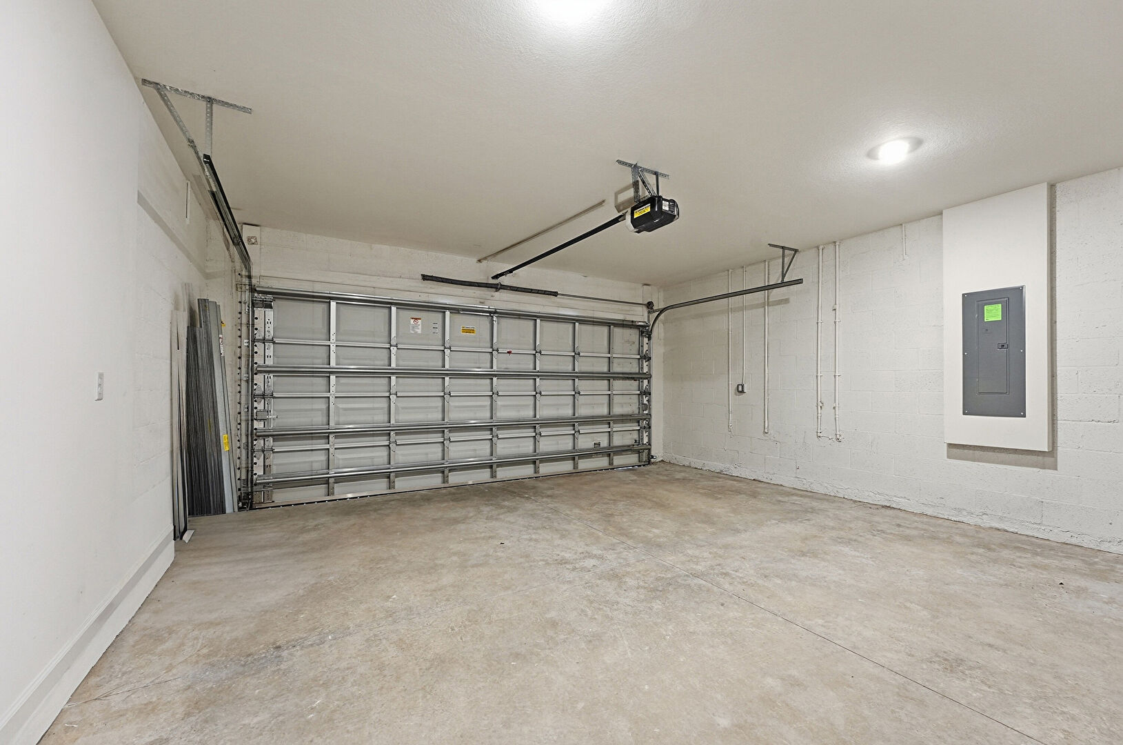 Baseboards Wall, Drywall, Electric Panel, Garage, Garage Door Opener, Concrete Block Wall
