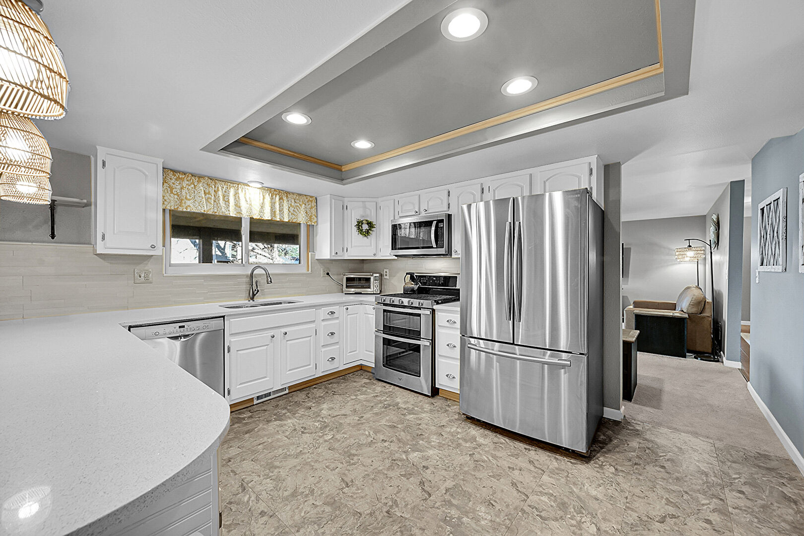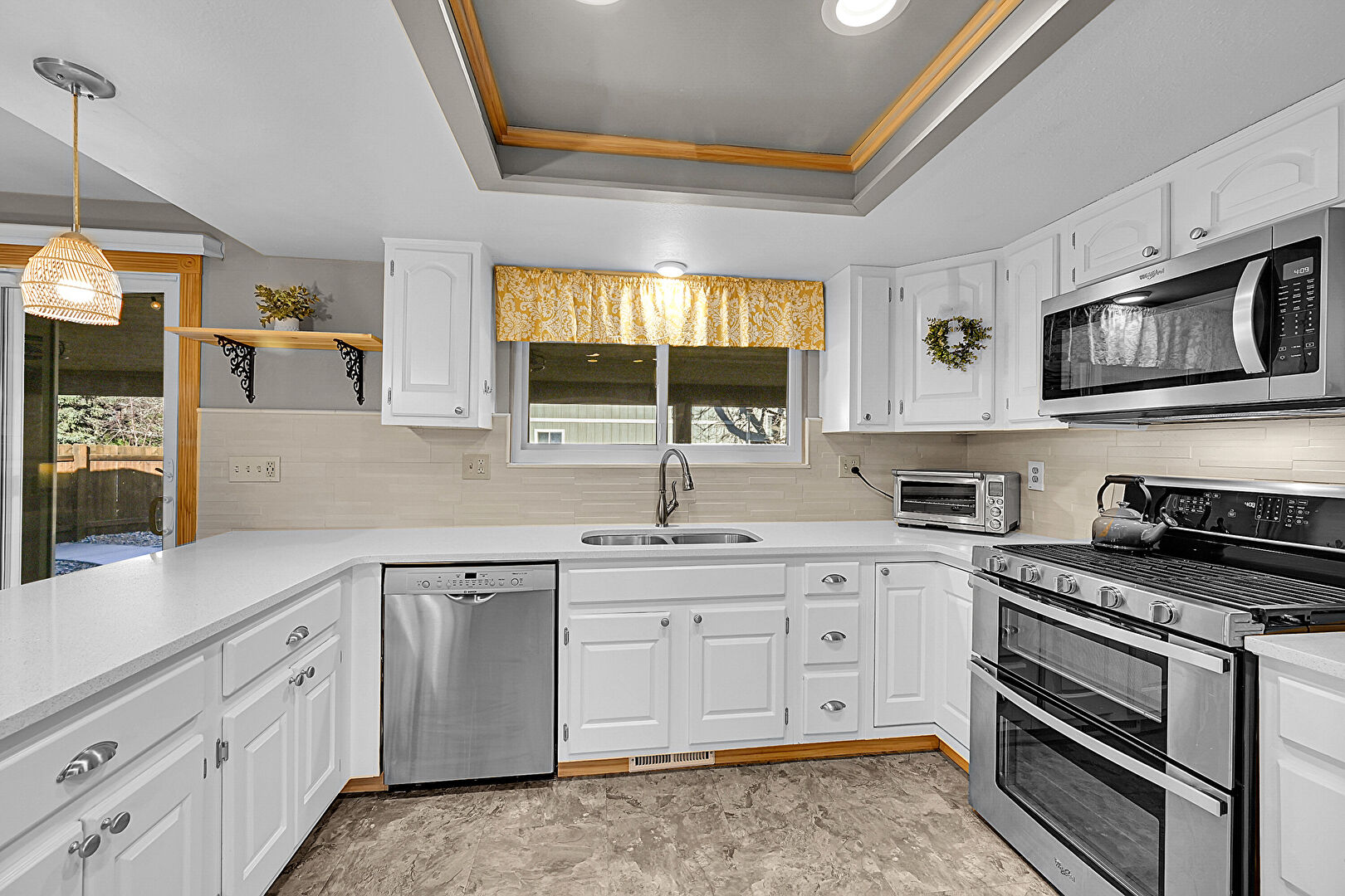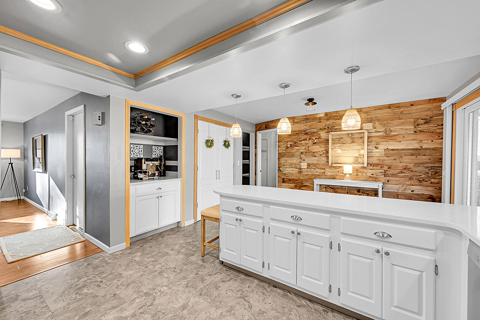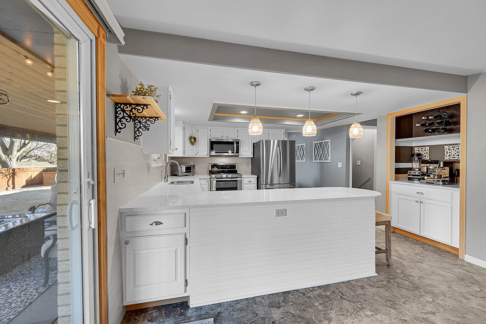 Arched Cabinets, Baseboards Wall, Built In Shelves, Crown Molding, Drywall, Kitchen Bar, Kitchen Peninsula, Laundry, Natural Light, Open Shelves, Pendant Lighting, Raised Cabinets, Recessed Lighting, Stone Countertops, Stone Finish Floor, Toaster, Tray Ceiling, U Shaped Kitchen, Vent, Vinyl Floor, Visible Hinge Cabinets, Washer Dryer, Wood Wall, Arched Cabinets, Baseboards Wall, Built In Shelves, Pendant Lighting, Raised Cabinets, Wood Wall