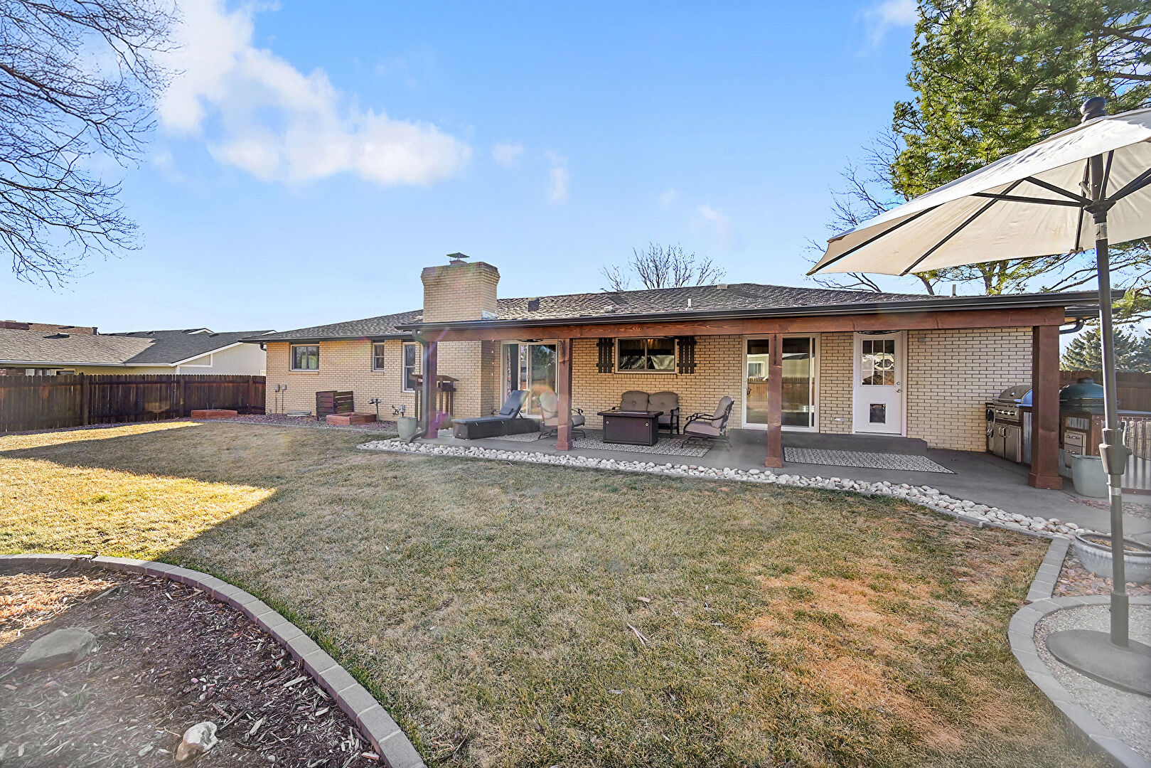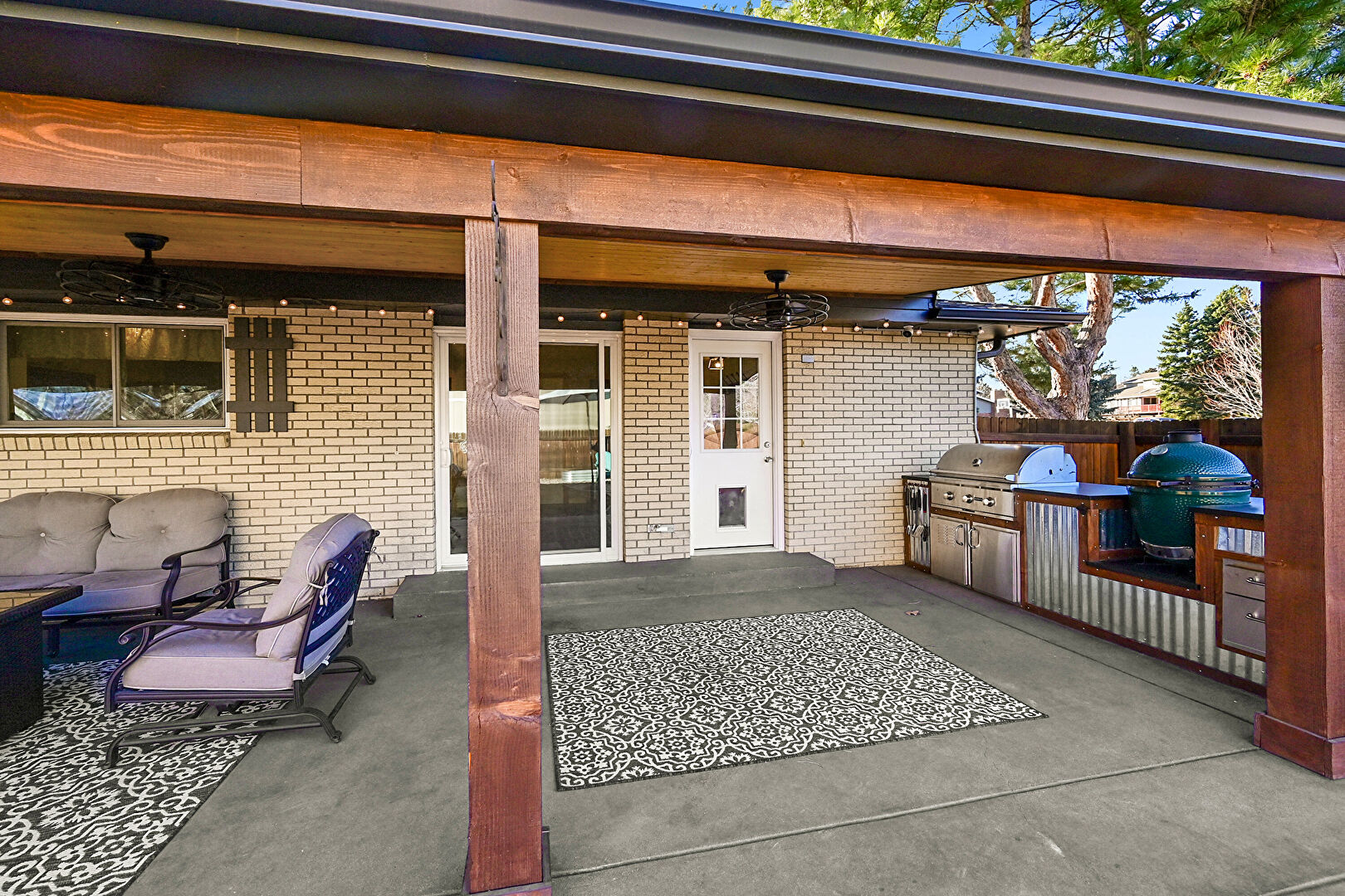 Ceiling Fan, Fence, Fire Pit, Grill, Outdoor Kitchen, Outdoor Living Space, Patio, Vent, Fire Pit, Lawn, Patio