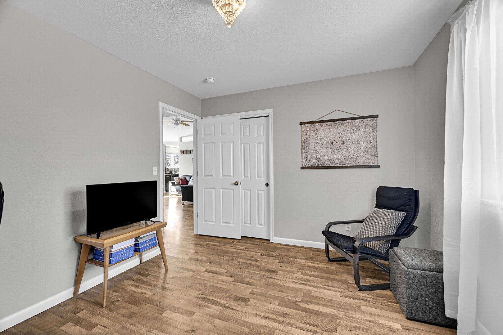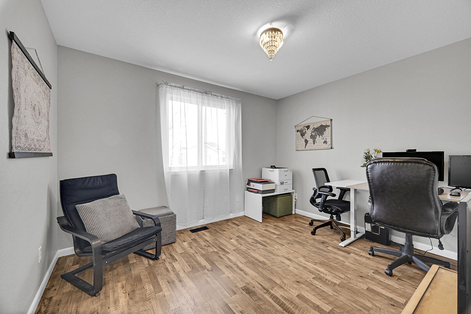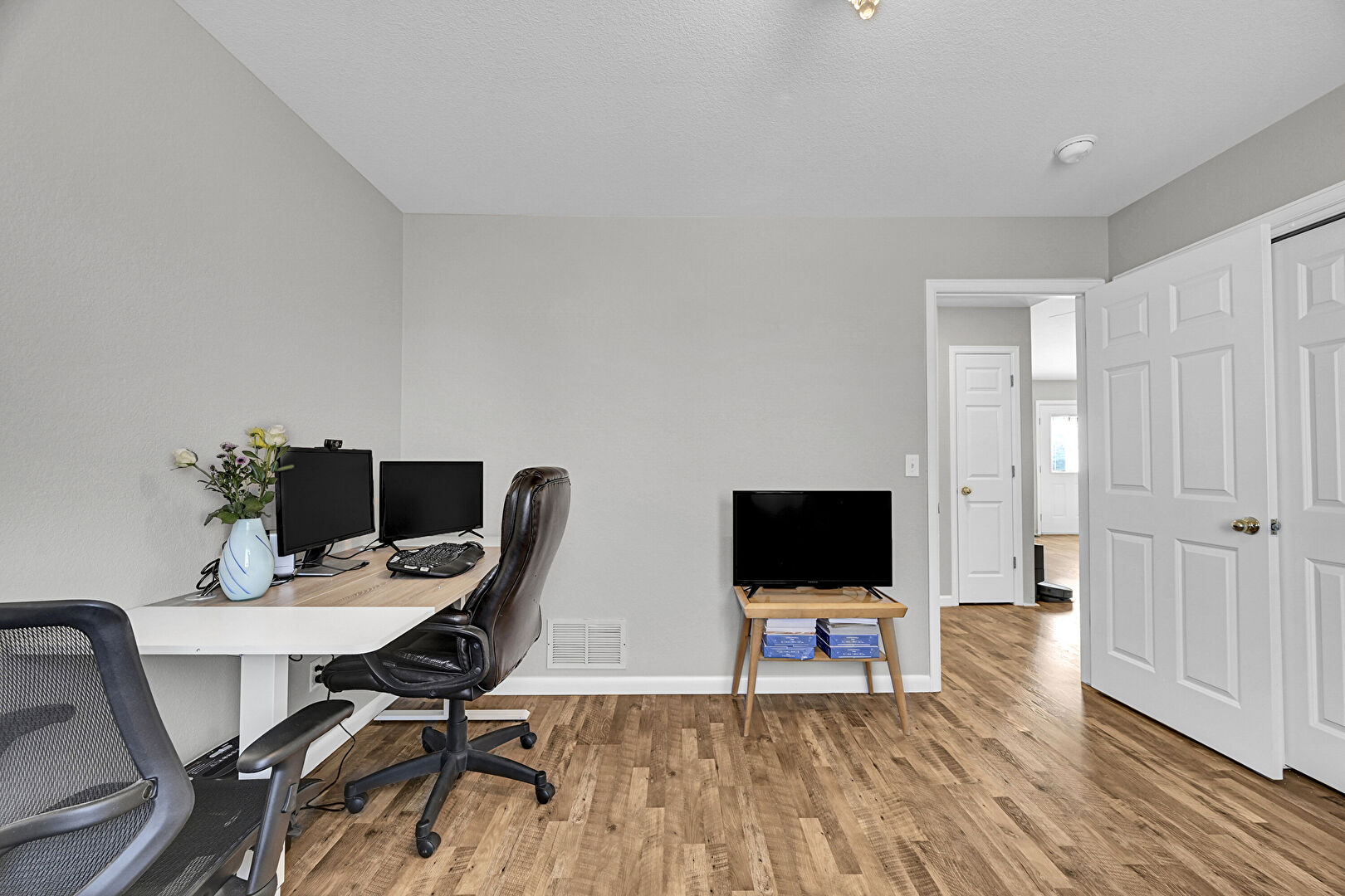 Baseboards Wall, Ceiling Fan, Drywall, Natural Light, Office Area, Textured Ceiling, Vent, Wood Finish Floor, Office Area, Smoke Carbon Monoxide Detector